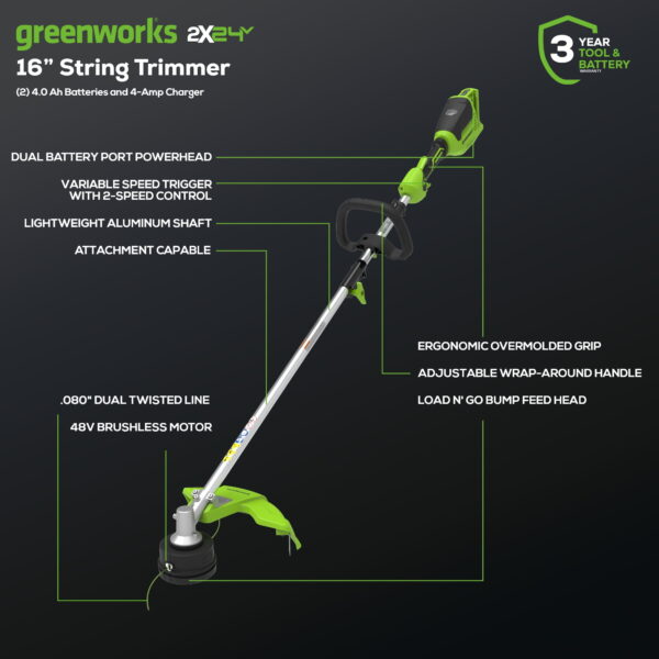 • Greenworks 48V (2x24V) 16" Brushless (Attachment Capable) String Trimmer with (2) 4Ah Batteries 2123402