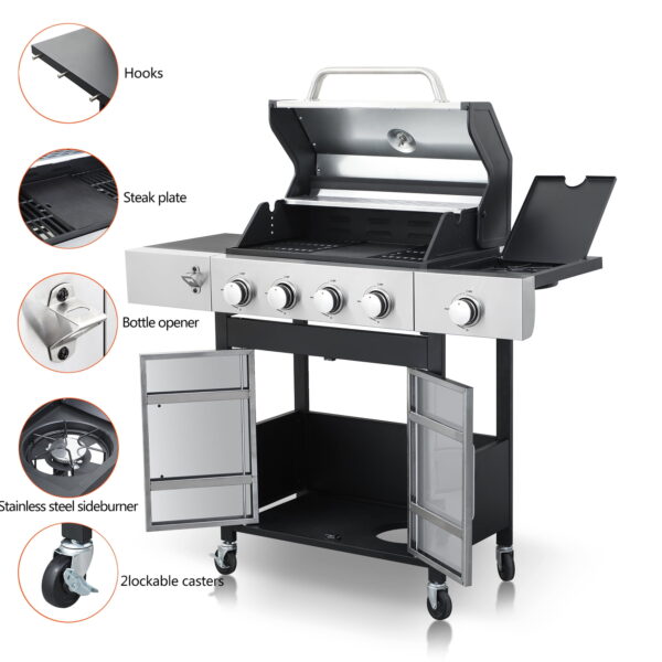 • Royal Gourmet GA5407H 5-Burner BBQ Gas Grill with Sear Burner and Lidded Side Burner,Cabinet Style Grill for Outdoor Grilling and Backyard Cooking, Black