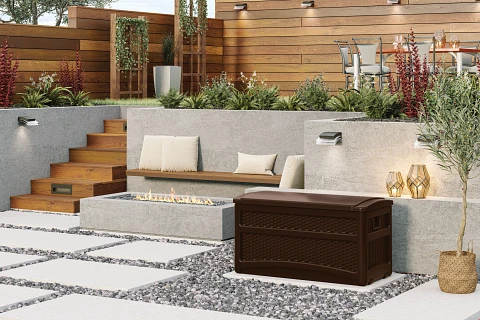 • Suncast 73-Gal. Weather-Resistant Resin Outdoor Deck Storage Box and Bench, Java