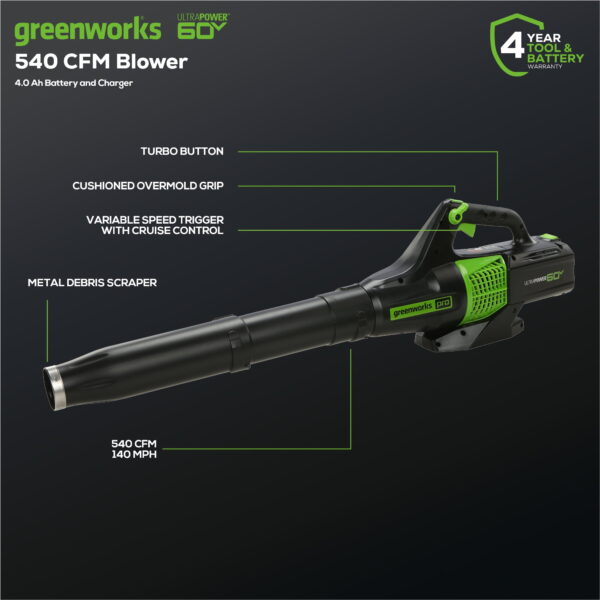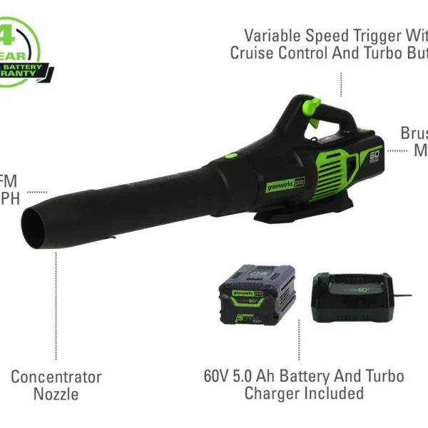 • Greenworks 60V 700 CFM Cordless Battery Leaf Blower + 5.0Ah Battery & Charger 2419502