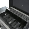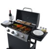 The whole Stainless steel control panel with chromium plating control knob makes this propane gas grill more study and delicate, a stainless steel handle and a built-in stainless steel thermometer on the cover lid, two tables and two wheel casters for storage and moving