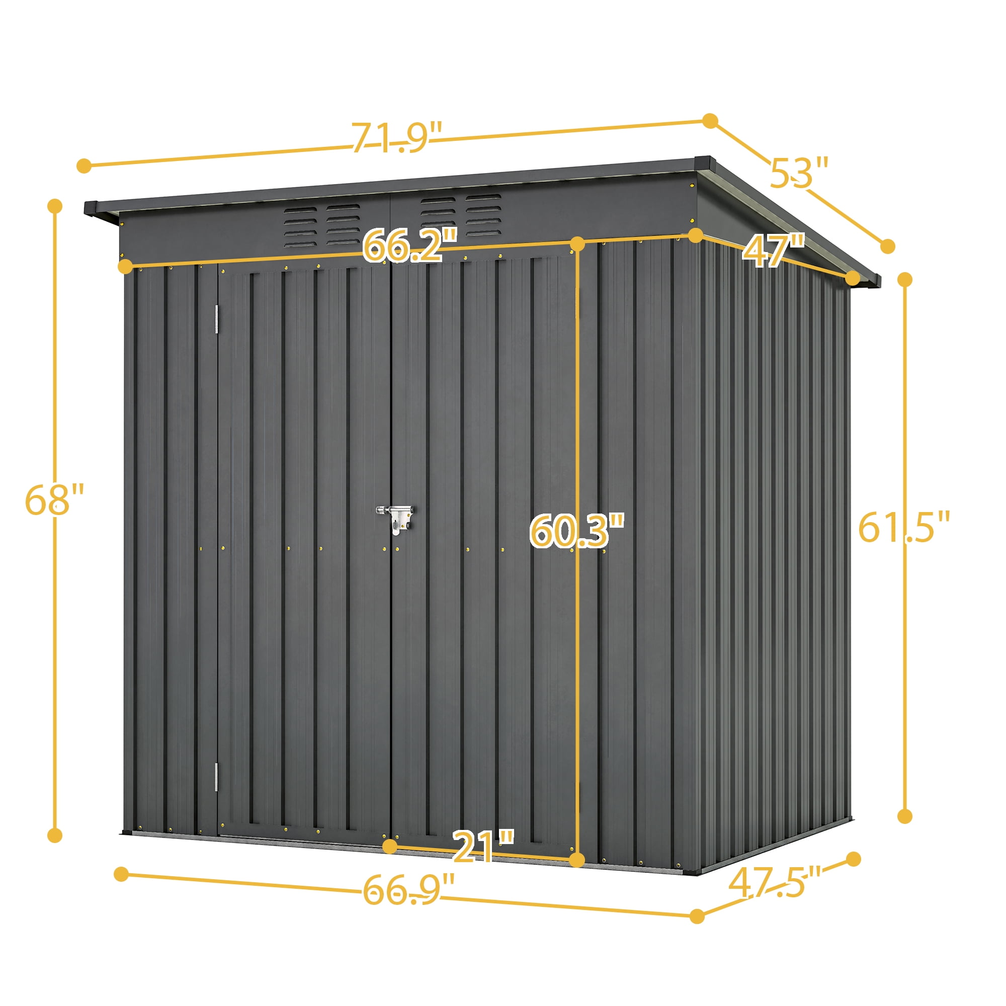 This series of metal steel storage sheds is a wonderful choice for outdoor storage. This sturdy metal shed can protect your outdoor equipment, tools, and gardening supplies from all kinds of bad weather.This garden shed has just enough storage space to hold all the tools you need to maintain your beautiful yard. This sturdy metal shed will protect your outdoor equipment, tools, and gardening supplies from all kinds of harsh weather. The metal sheds are weatherproof, UV resistant, rust, and corrosion resistant, and have a long service life. This is due to the fact that the metal shed is made of high-quality galvanized steel powder coating, which greatly enhances the overall performance and sturdiness of metal sheds.