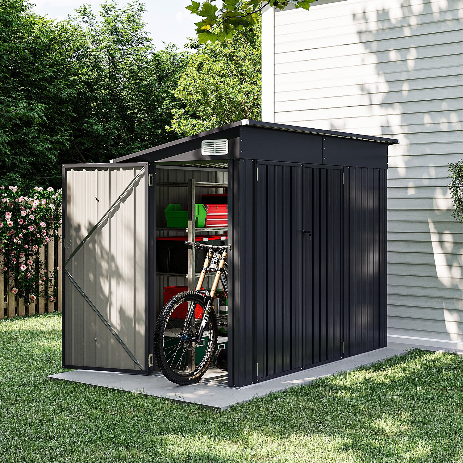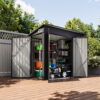 Bapipro’s outdoor storage shed is perfect for your outdoor storage needs. This triple-door design outdoor storage shed is built with high-quality materials like galvanized steel that can help protect the shed from corrosion and rust. Besides, color coated sheet with a powder coat further ensures the corrosion resistance of the shed and can withstand long-term use as well as harsh weather. Stable bases and sturdy structure make the product more stable and secure. Additionally, the outdoor shed measures 7.7’L x 4.3’W x 6.1’H, providing ample capacity and enough space to store your outdoor items or equipment, such as tools and bicycles. This shed can meet your needs.