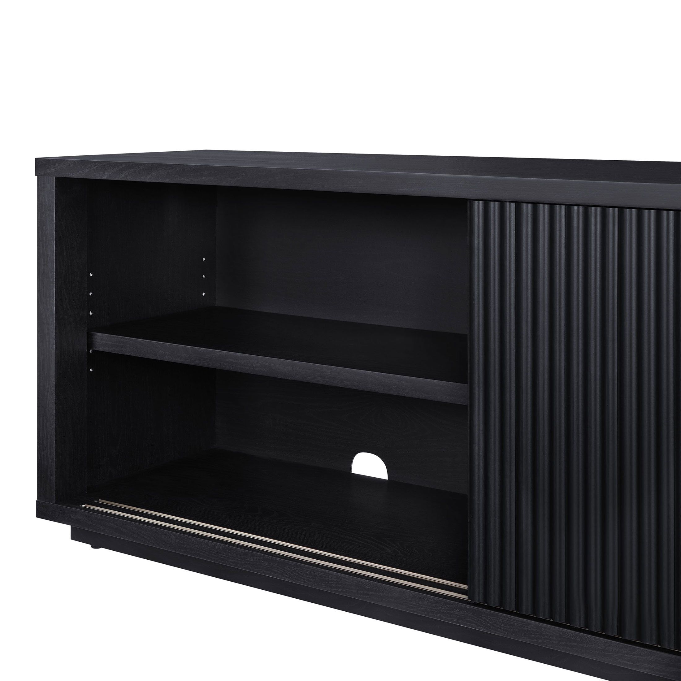 The Beautiful Fluted TV Stand adds style and function to your living room or entertainment space. It’s designed to hold large TVs, creating a stable and secure setup for your home entertainment. The sliding cabinet doors feature eye-catching fluted panels for a modern touch and easy access to storage. Inside, two adjustable shelves keep your media devices and accessories organized and out of sight. Made with sturdy wood, this TV stand is built to support your TV and last for years. Pair it with other Beautiful by Drew Furniture collection pieces to complete your space (sold separately).