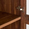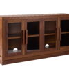The Better Homes & Gardens Ezra TV Stand for TVs up to 70″ has a stylish, framed geometric construction that enhances its overall aesthetic appeal, making it the ideal focal point for a living room, dining room, or entryway. Featuring four framed, safety-tempered glass doors with soft-close hinges, this TV stand with storage has a sleek and modern design that adds a touch of elegance while providing practical media storage space. Behind each stylish door of this wooden television stand is a large, adjustable shelf, for versatile storage and display options. A cord management system conveniently accommodates video equipment devices and more, while reducing the clutter of cords and wires. With a strong and lightweight two-inch panel construction, this adjustable TV stands with doors holds up to a 70-inch TV weighing up to 95 pounds.. Built-in adjustable levelers at the base ensure the furniture is level, even if the floor is not. Finished in decadent Walnut, this Better Homes & Gardens Ezra TV Stand for TVs up to 70″ exudes sophistication and seamlessly blends into various styles of interior decor.