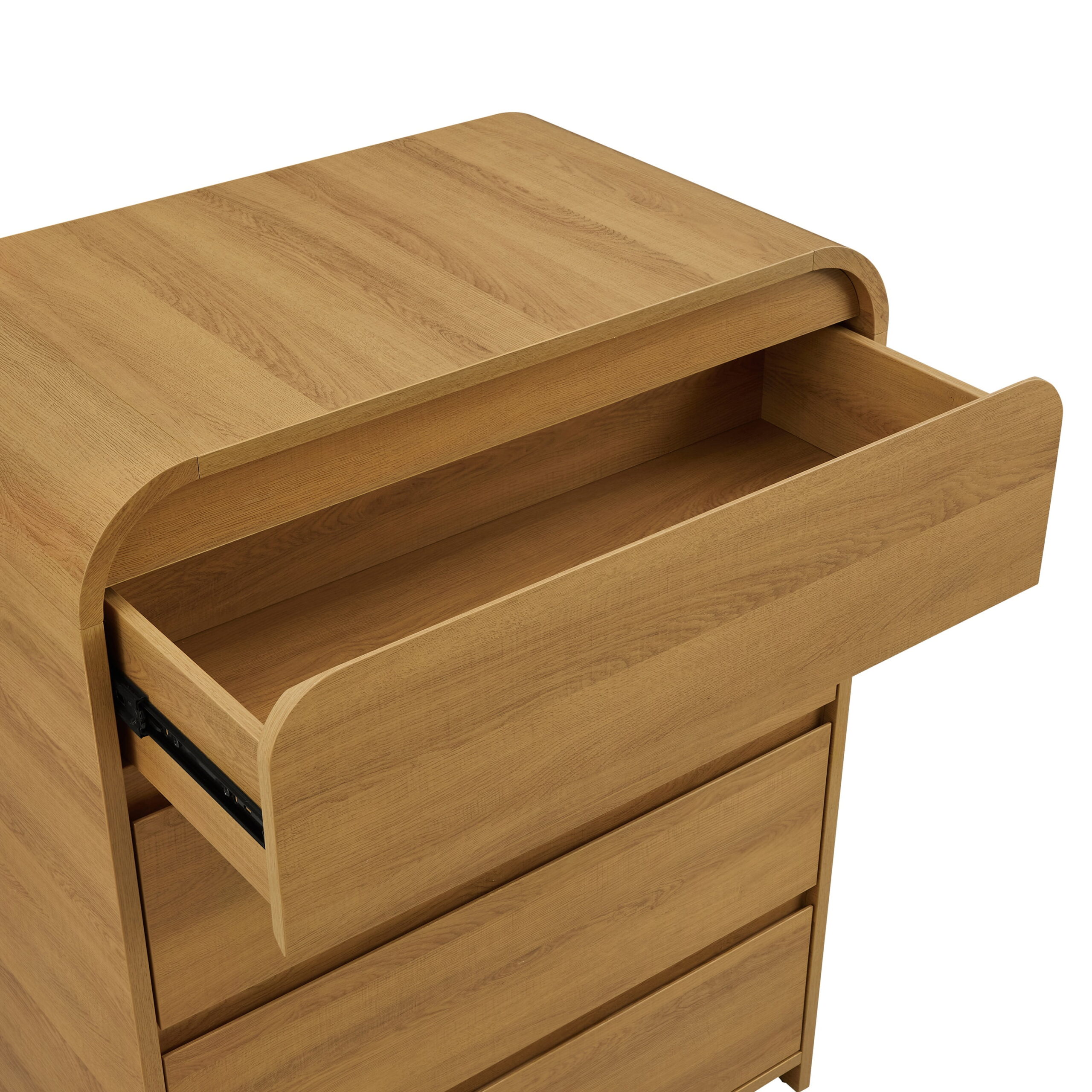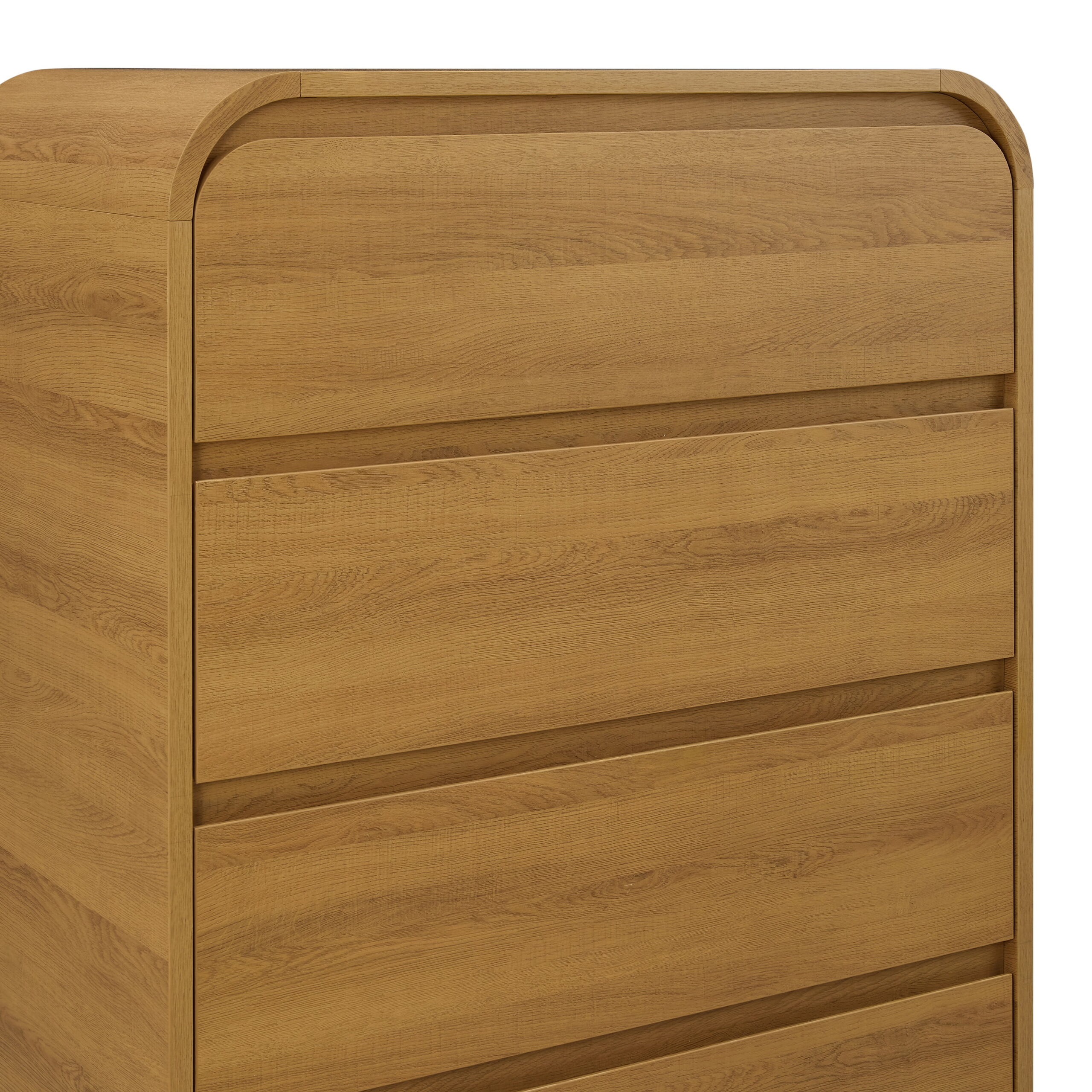 Upgrade your decor with this contemporary 4-drawer dresser from the Better Homes & Gardens Juliet Collection. Featuring a warm light honey finish with sleek, rounded edges and hidden notched hand pulls, this modern chest of drawers offers a minimalist, stylish look. This tall dresser would look great in a bedroom but also could be used as storage in a hallway or home office. Constructed with premium MDF and durable metal drawer glides, the Juliet 4-Drawer Dresser is built for lasting quality and reliable performance. Safety stops on each drawer and an included wall anchor kit ensure extra security. Assembly is required. Elevate your bedroom storage with this elegant, high-quality modern dresser that combines form and function seamlessly.