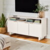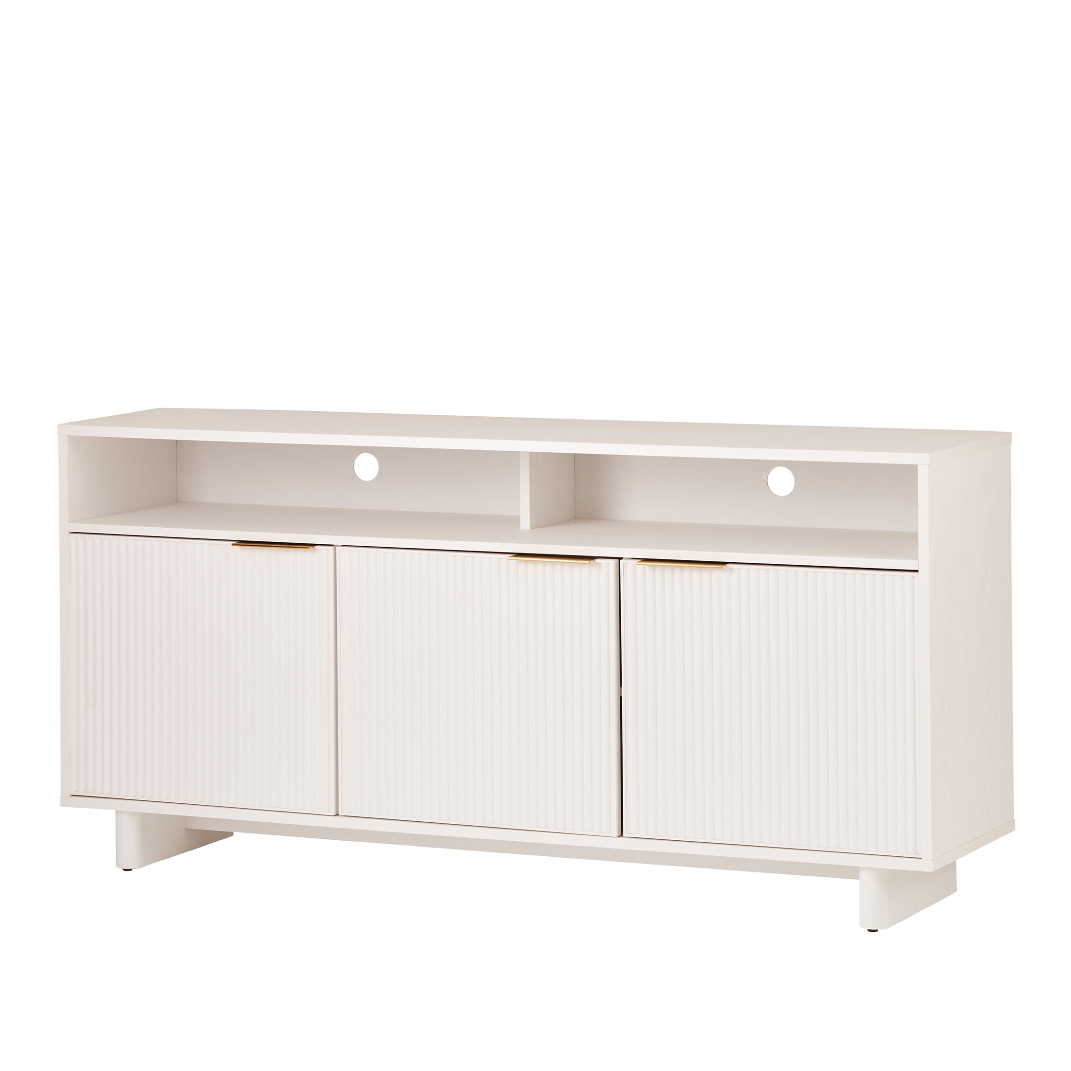 The Better Homes & Gardens Lillian Fluted TV Stand is a perfect blend of modern, mid-century, and Art Deco-inspired design. Featuring a white finish and fluted detailing, this stylish entertainment center adds a sophisticated touch to any living room, den, or media room. This TV console offers ample storage space with open center shelves for gaming consoles, streaming devices, and décor, plus spacious bottom cabinets with adjustable shelves to keep media essentials organized. The built-in cable management system includes two cable cutaways on the back panel, helping you maintain a clean, clutter-free setup. Perfect as a TV console, media cabinet, or stylish storage credenza, the Better Homes & Gardens Lillian Fluted TV Stand brings both functionality and modern aesthetics to your home.