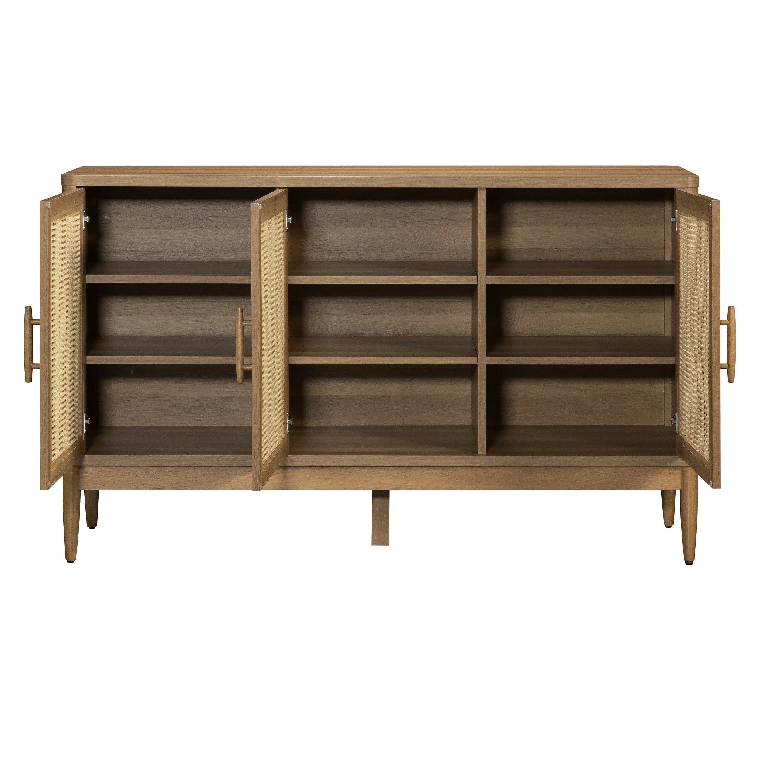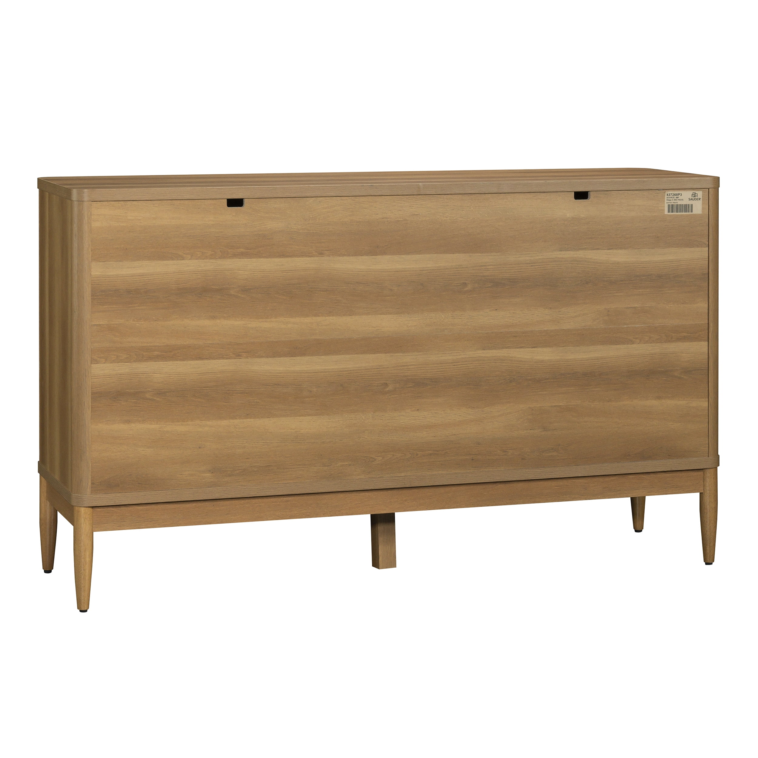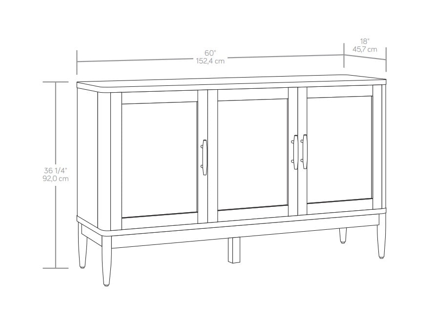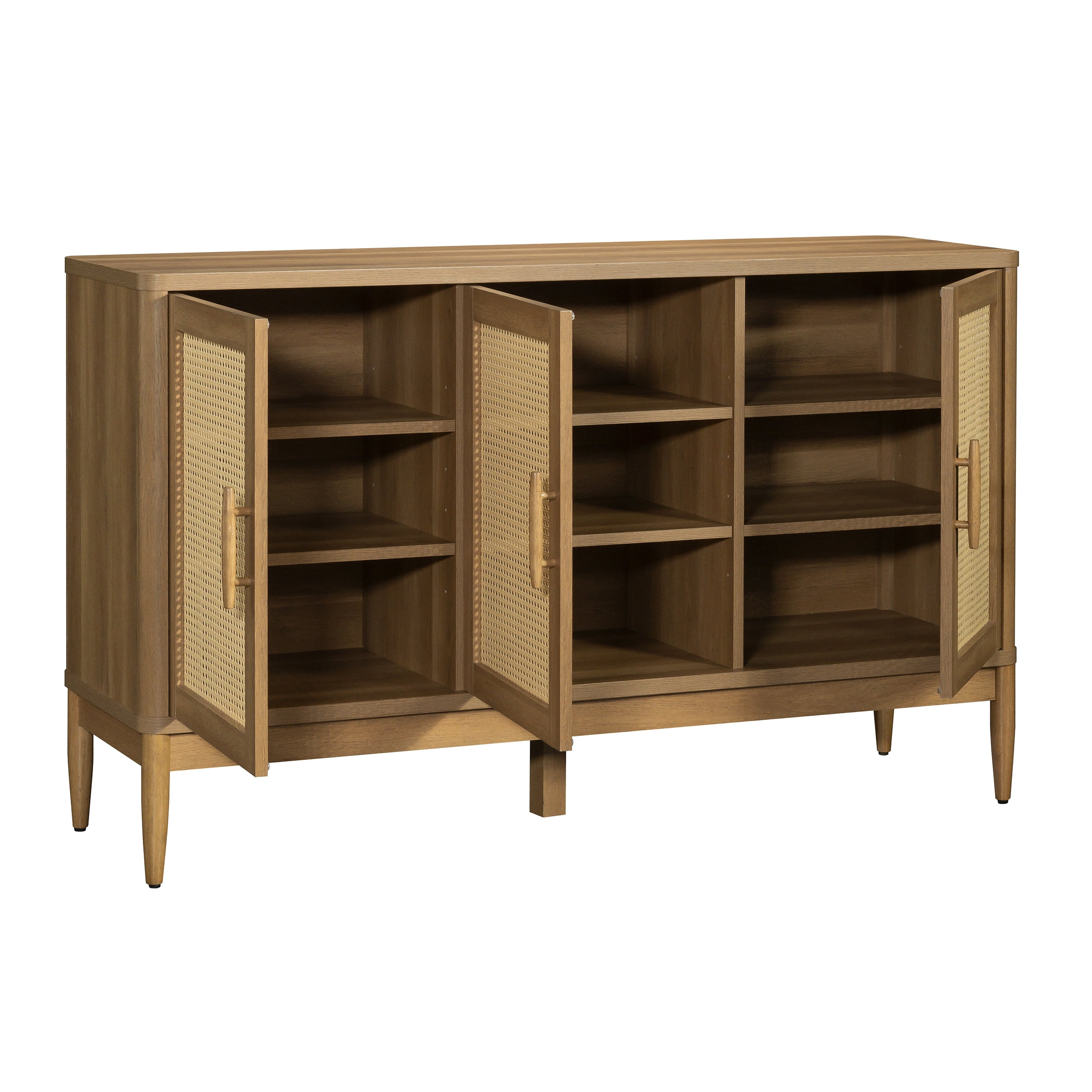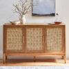 Upgrade the home entertainment experience with this stunning dining room buffet from the Better Homes and Gardens Springwood Caning Sideboard. Its durable 1″ thick top is built to withstand daily use, while the decorative rattan insert on the door fronts adds a touch of tropical style. Ample storage space lies behind the three doors, with two adjustable shelves behind each door for versatile storage of dining room or living room essentials. Solid wood feet and adjustable levelers of this dining room hutch ensure that this living room storage cabinet stands firmly on any surface. With the ability to hold up to a 65-inch TV weighing up to 70 lbs, this rattan living room cabinets a versatile choice for multiple rooms. The Light Honey finish is neutral yet elegant, making this rattan entertainment credenza an ideal choice for blending into any décor. Whether used as a piece of furniture for daily use or a statement piece, this versatile Better Homes and Gardens Springwood Caning Sideboard is ready to entertain guests or store a variety of home goods.