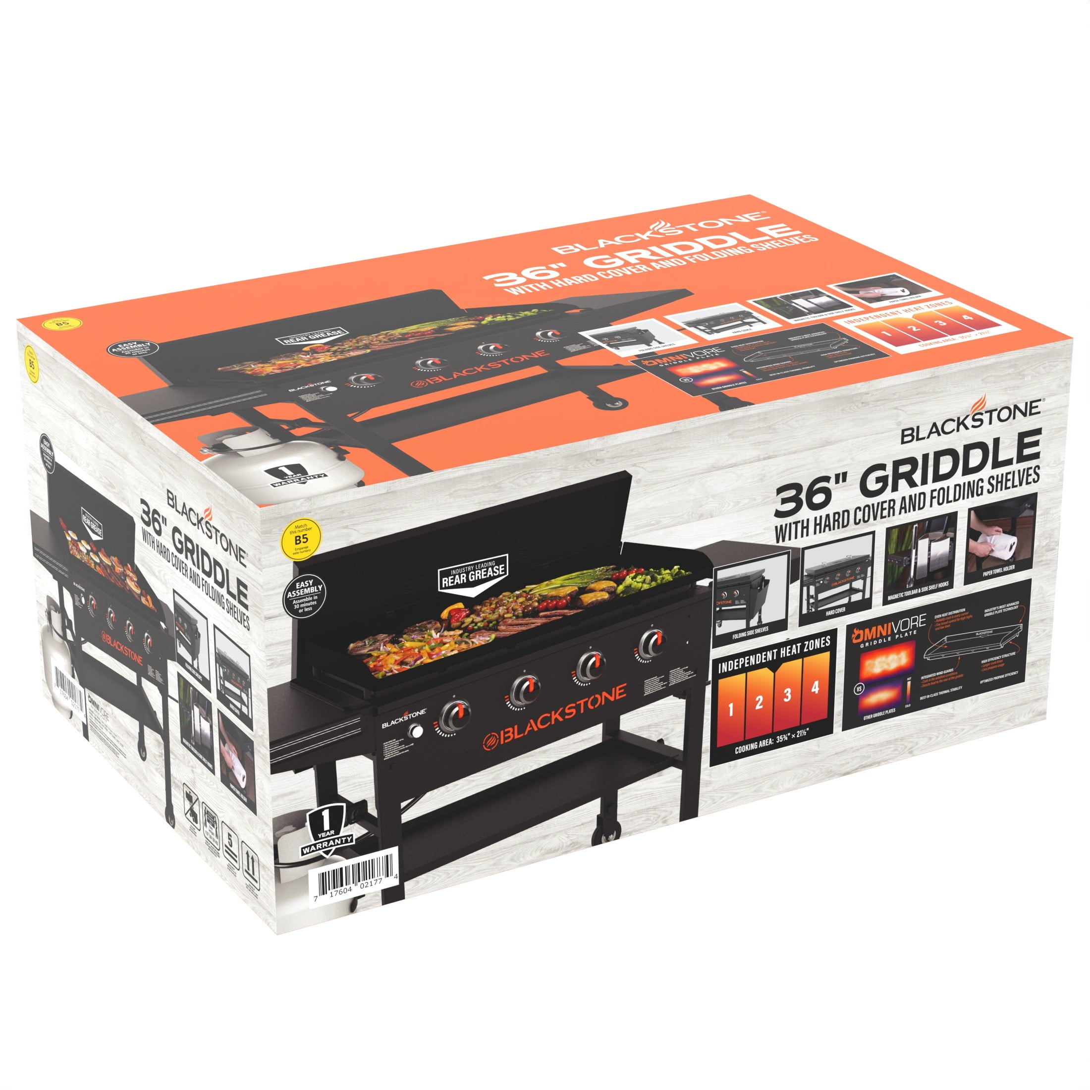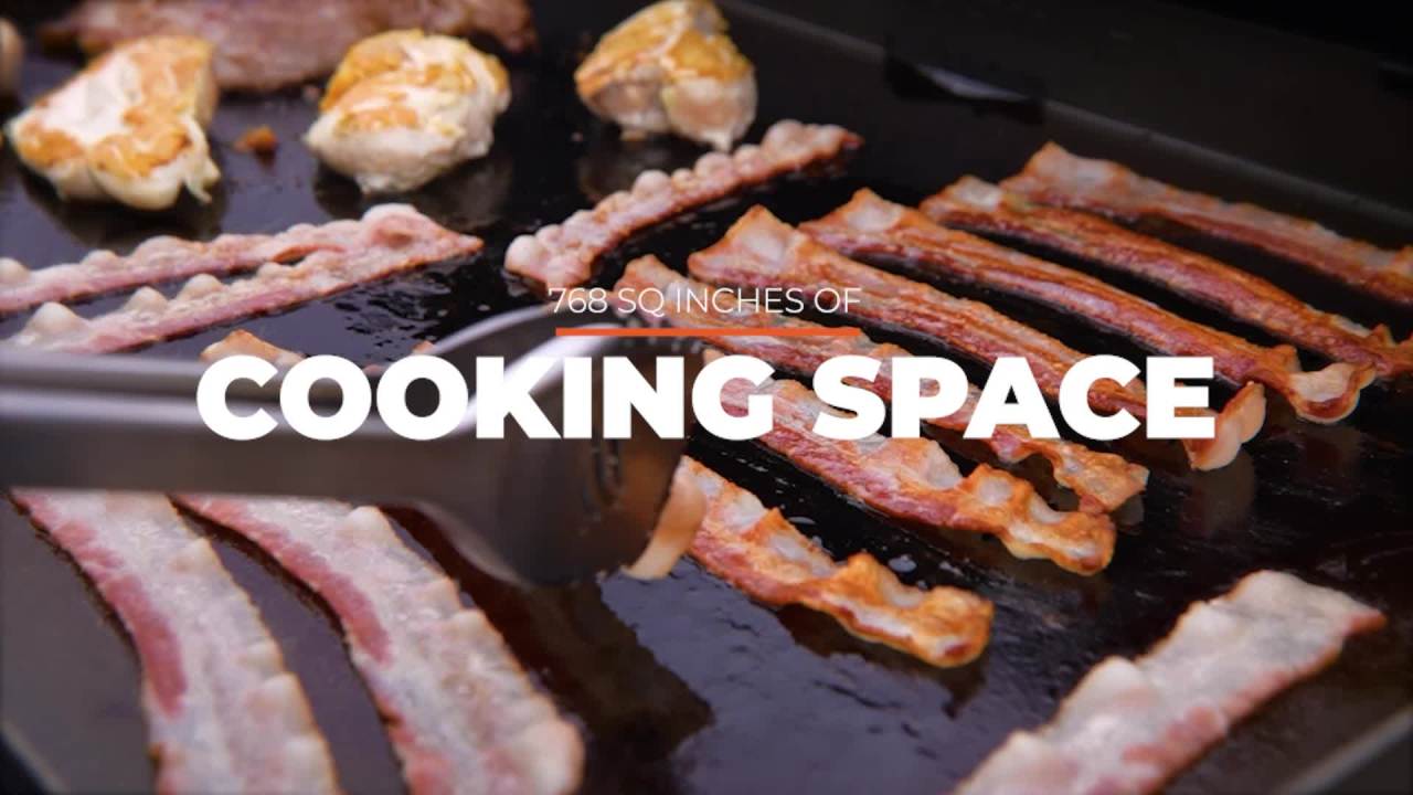 Show off your cooking skills with the Blackstone 36″ Griddle Cooking Station, now featuring the Blackstone Omni Griddle Plate. This large griddle with four independently controlled cooking zones is just what you need for your backyard parties, barbecues, and campouts. The propane-fueled Blackstone 36″ Griddle gives you 768 square inches of cooking space for the best griddling experience. On top of that, this griddle provides you with four independent cooking zones so you can cook everything at the same time at different temperatures. The new and improved Omni griddle plate has a patented design that heats your cooktop surface more evenly than ever before. Extra features include the side shelves that are designed specifically with your Blackstone griddle tools in mind, featuring tool hooks and a magnetic toolbar so all your Blackstone accessories are within easy reach. NOTE: This griddle is not compatible with the current Blackstone natural gas conversion kit.