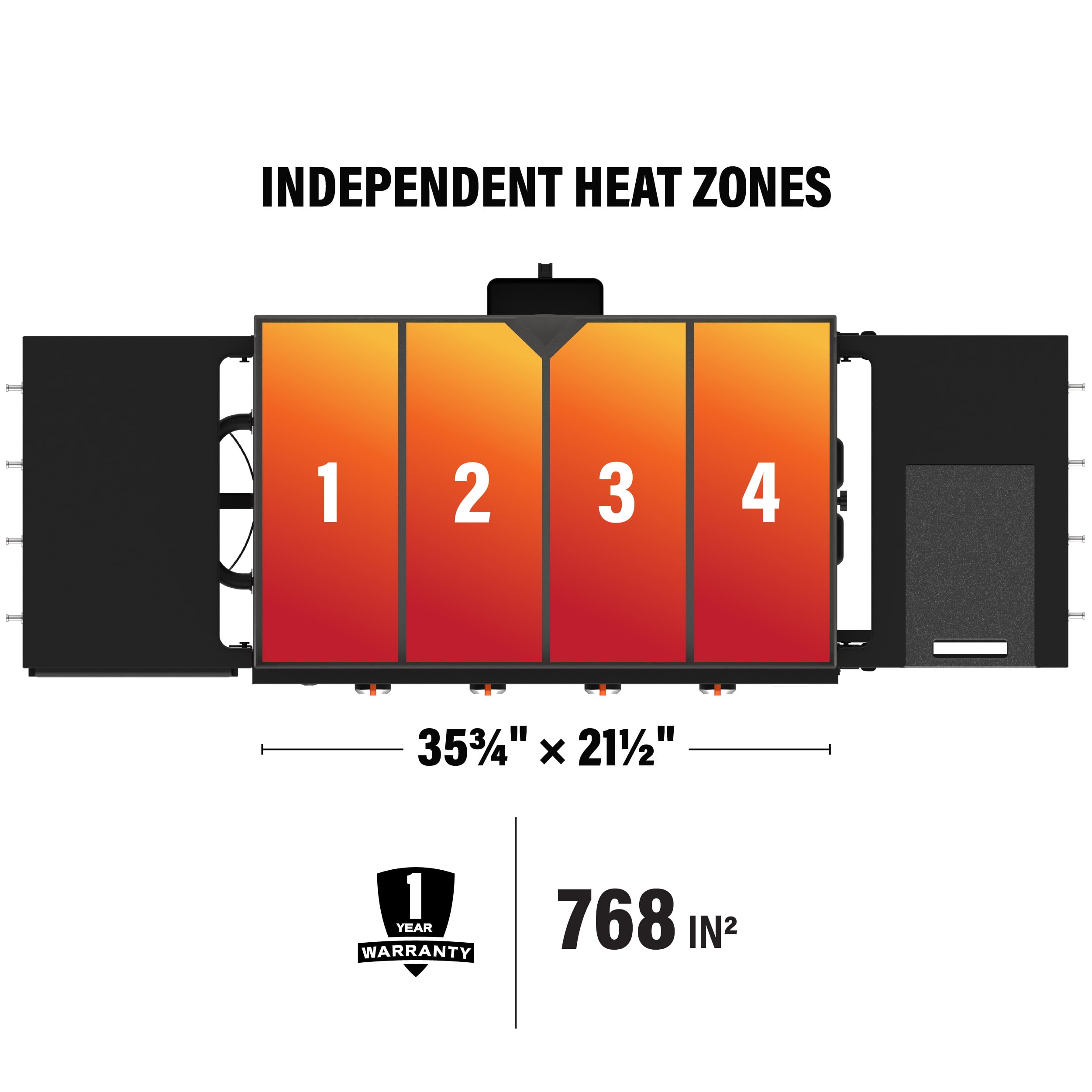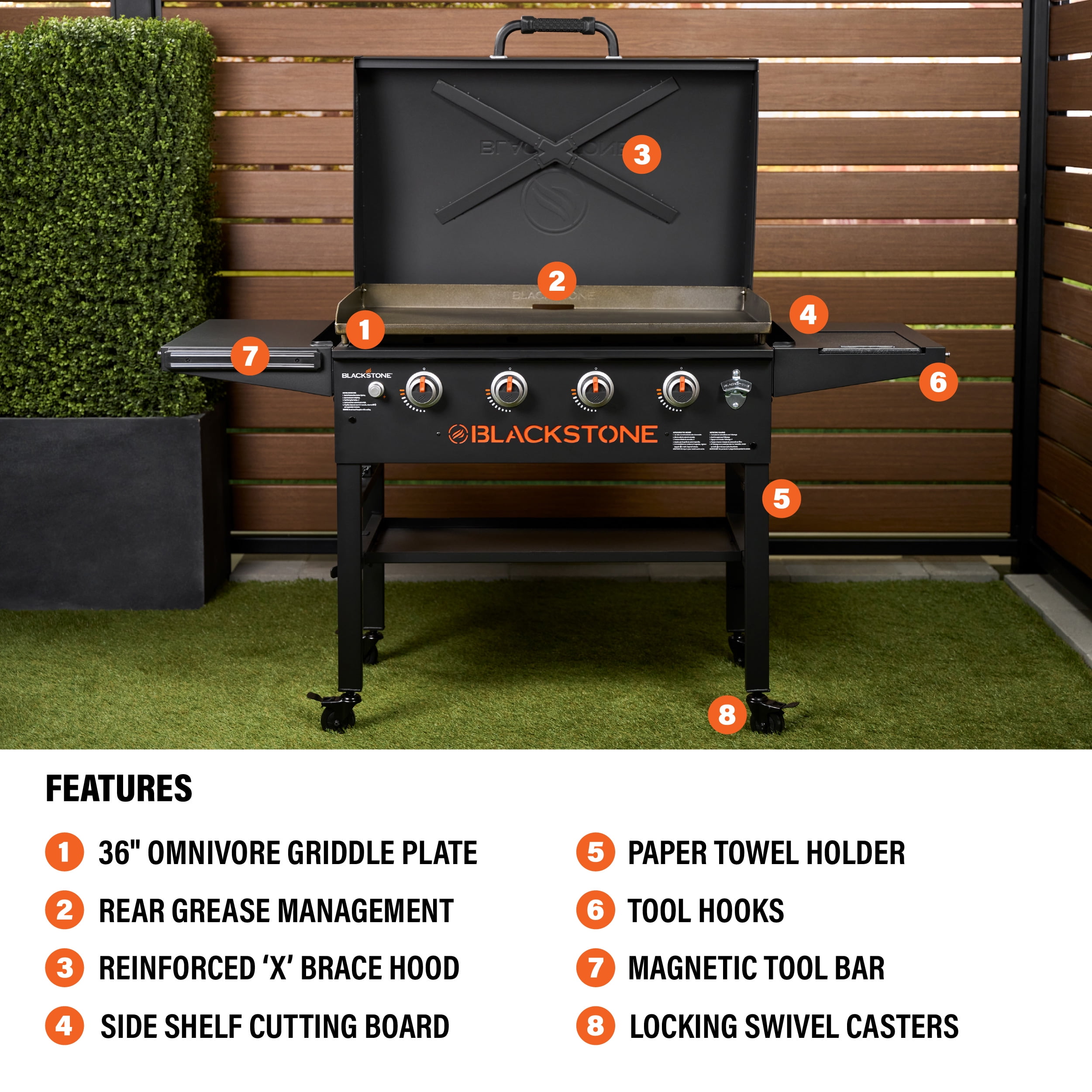 Create delicious outdoor meals on this Blackstone 36” Omnivore Griddle with Hood and Folding Side Shelves – now natural gas ready. This griddle was designed to make cooking outdoors easier and more efficient. The Omnivore Griddle Plate provides faster preheat and recovery times, more even heating across the griddle top, and uses less fuel per cook. With 768 square inches of cooking space and four independently controlled burners, this flat top grill is great for making multiple food items at once. Extra features including a side shelf cutting board, magnetic tool strip, bottle opener, and paper towel holder make it easier to prep, cook, and clean up. Protect your griddle top with the integrated ‘X’ brace hood and fold down the side shelves after use for more compact storage. Enjoy everything from prepping your meal to cleaning up after it when you make your meals on this Blackstone 36” Omnivore Griddle.