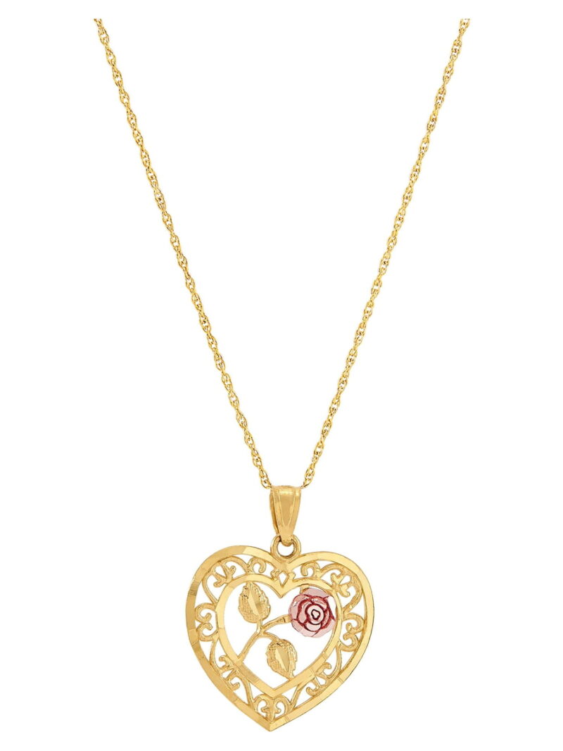 Enjoy the beauty of this Brilliance Fine Jewelry 10K Yellow and Pink Gold Filigree Heart with Center Flower Pendant on 18 inch Gold Filled Chain. This pendant is crafted in lustrous 10K yellow gold and features a rose gold flower in the center of the open heart. It is bordered with a lively filigree that creates a pretty border. It suspends on an 18-inch gold filled cable chain and is secured with a spring-ring clasp that provides protected wear and ease of use. This high polish pendant can enhance practically any fashion ensemble. A romantic, elegant gift for birthdays, anniversaries or other occasions. Female Pendants. Two-Tone Pendants.