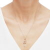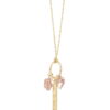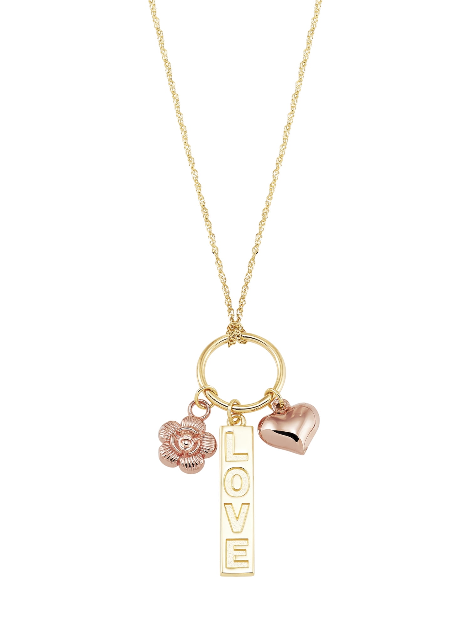 This charming necklace is created in 10K yellow and rose gold with matte and shiny finishes. It has a vertical style flat bar engraved with “love”, dimensional flower and hollow puffed heart assembled on an open ring. The sparkly singapore chain is artfully tied at the center of the ring which creates a charm holder effect. This item measures a total of 19 inches and has a secure spring ring closure. Perfect giftable. Female gold necklaces. Womens gold necklaces. Love necklaces. Brilliance Fine Jewelry.