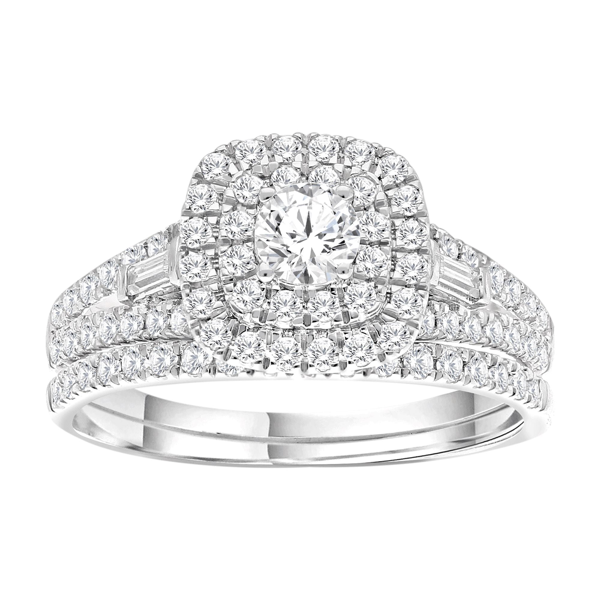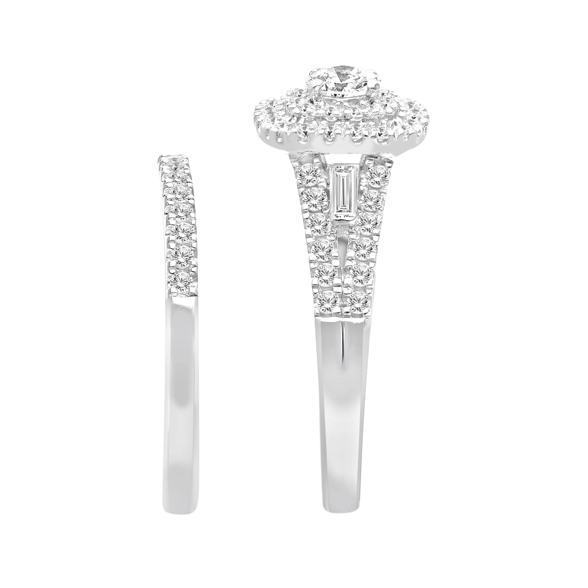 Celebrate your love story with this breathtaking 1 carat lab-grown diamond halo bridal ring set. This exquisite set features a stunning G/H/I color and SI clarity diamond, surrounded by a halo of smaller diamonds, enhancing its brilliance and creating a dazzling effect. Crafted in high-quality sterling silver, this bridal set is the perfect symbol of your eternal love and commitment. Ideal for proposals, engagements, and weddings, this halo bridal ring is a timeless symbol of love and commitment.