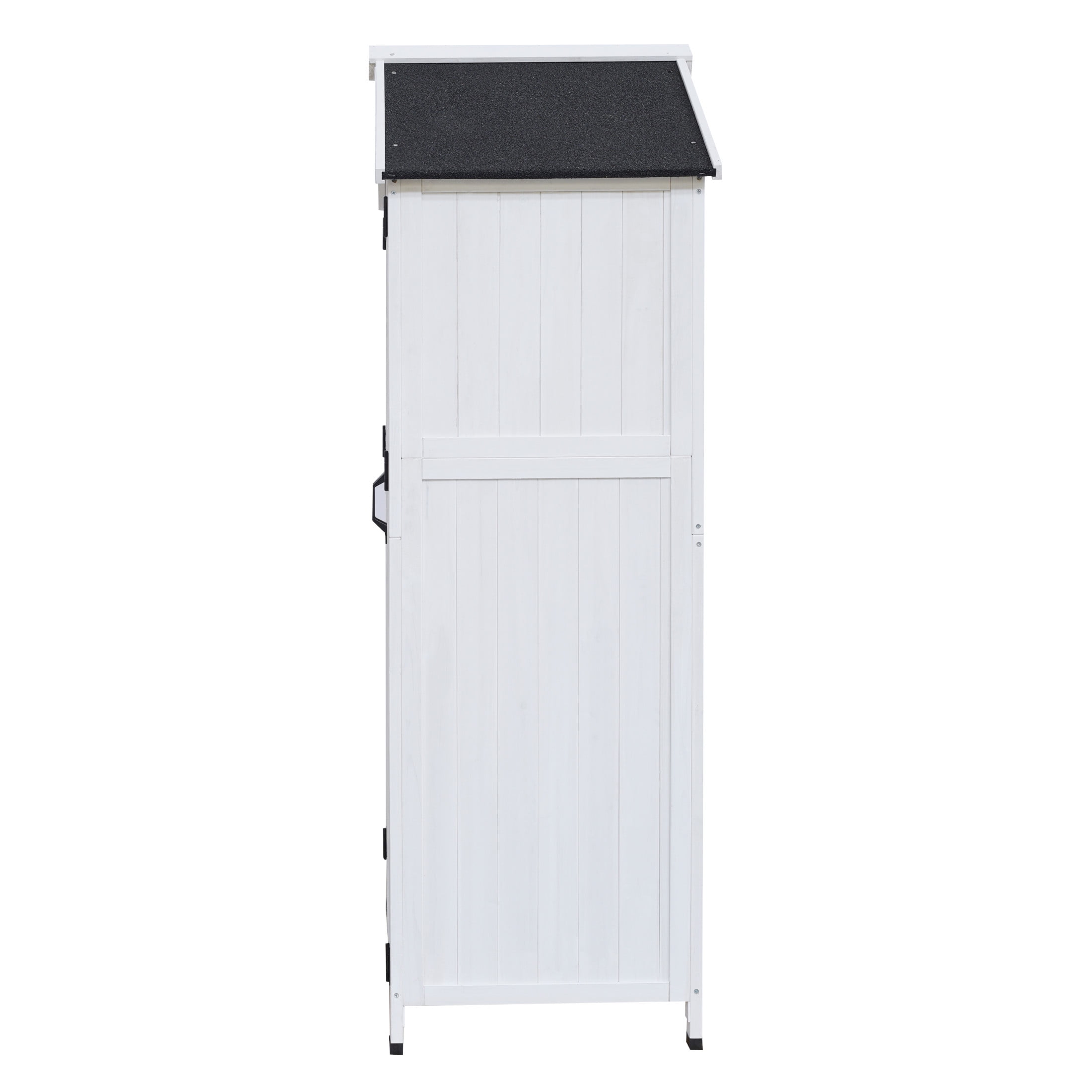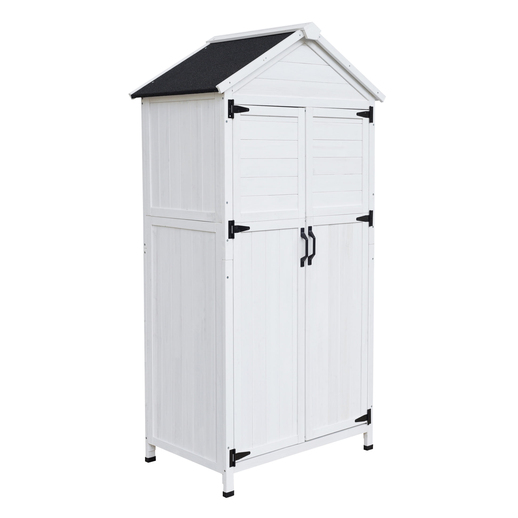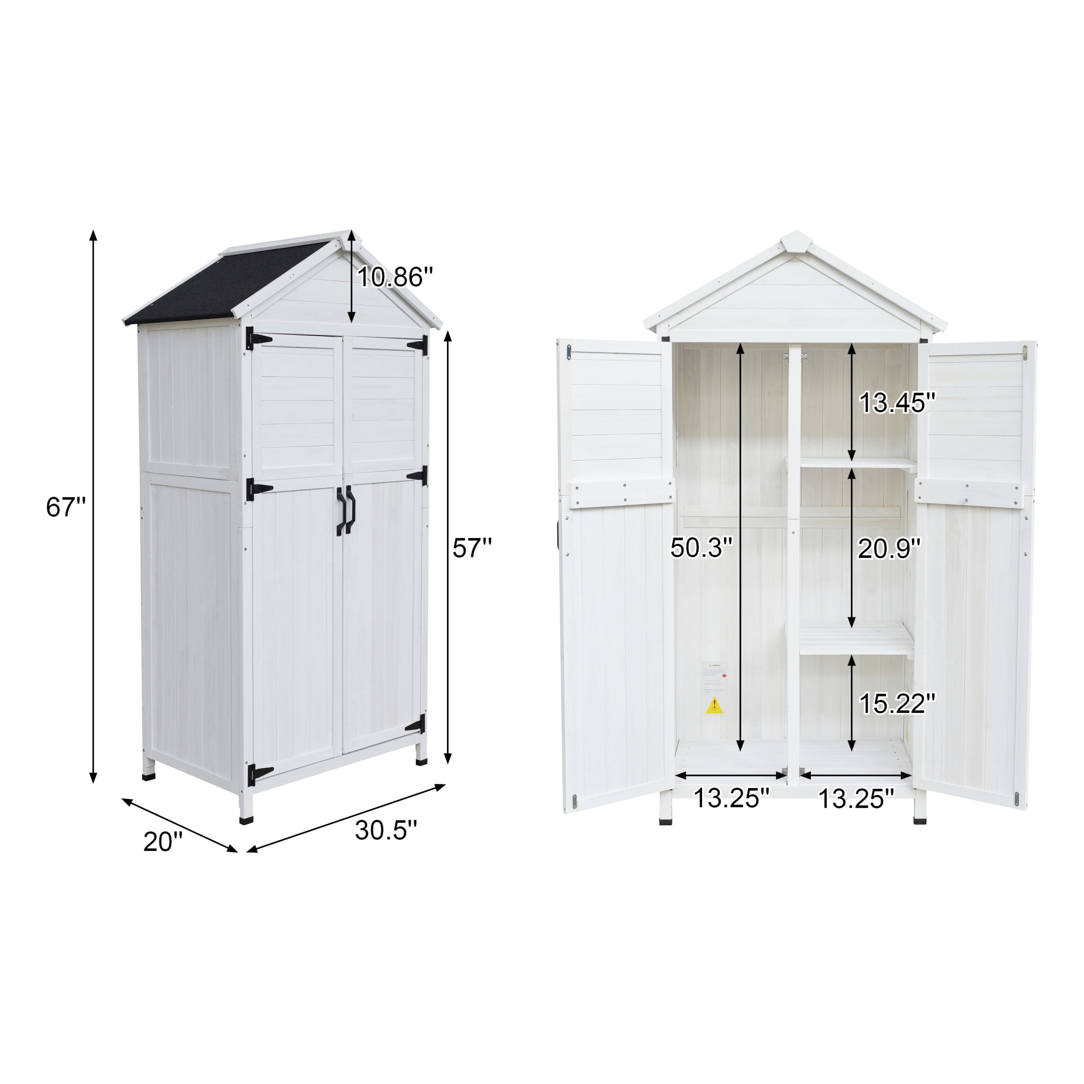 Keep your outdoor space organized and stylish with the White Fir Wood Outdoor Storage Shed. This durable storage solution is crafted from solid fir wood and finished in a crisp white color that complements any garden, patio, or backyard. Standing 67” tall, the shed features spacious interior storage with four distinct compartments, perfect for organizing garden tools, lawn equipment, and outdoor accessories. The dual-door design with smooth metal handles provides convenient access, allowing you to retrieve items easily from either side. Whether storing shovels, pots, or larger tools, this shed offers a reliable, clutter-free storage option for maintaining a tidy outdoor area.