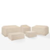 The 5pc set fits a variety of patio sets. It includes two loveseat covers (58″W x 36.5″D x 30″H), a chair cover (36.5″W x 33″D x 30″H), a coffee table cover (48″W x 36.5″D x 14″H), and a square coffee table cover (33″W x 33″D x 17.5″H).