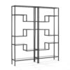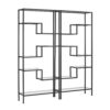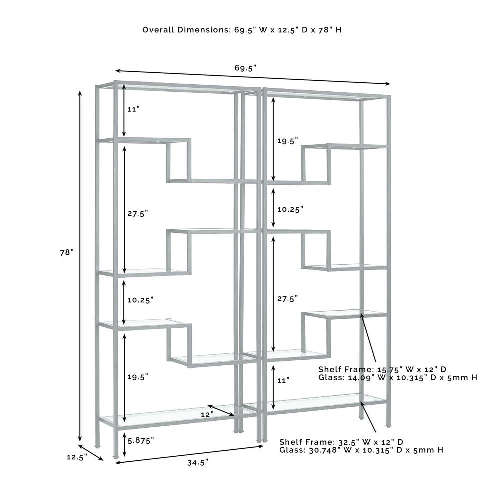 Modern beauty and functional simplicity are the hallmarks of the Sloane 2pc Étagère Set. Ready to display precious keepsakes or your favorite books, this étagère set’s sculptural steel frame features sturdy tempered glass shelves. Paired together the etageres will be the focal point of your living room or home office, with the variable shelf heights and geometric design creating a unique storage space with Art Deco flair.