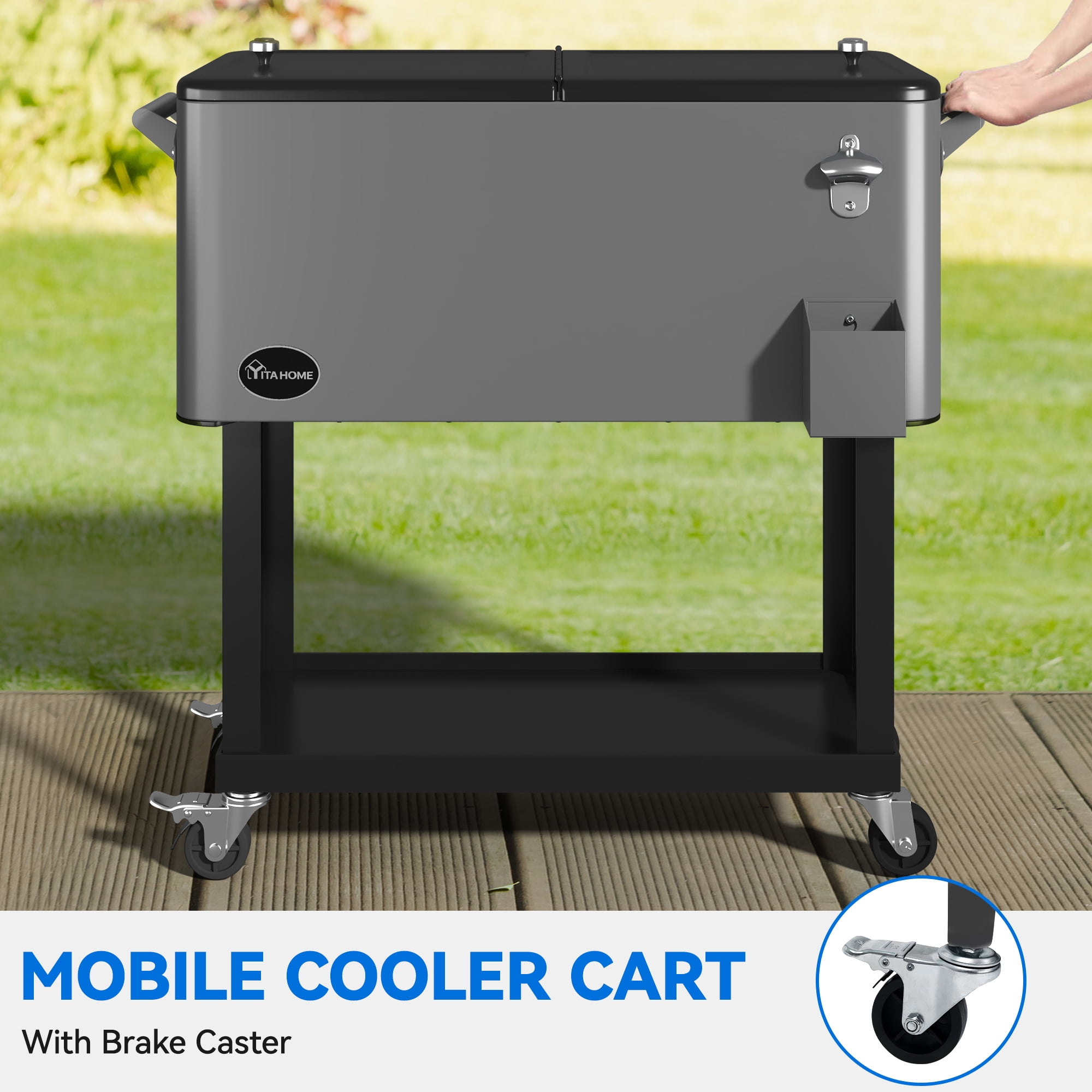 Level up your outdoor events with an all-in-one cooler cart! Fit all the cool refreshments you need with a large, and refill drinks as needed with a large lower shelf storage. Sturdy wheels provide easy mobility even when the cooler is full with its locking casters. Conveniently roll your mobile cart to the park, beach, or yard and clean up in a snap with a convenient drainage cap.There are many colors to choose from; so no matter what your backyard decor looks like you’ll be able to find something to match. And because this patio cooler is constructed from metal its powder-coated finish prevents rust and fading – so it’ll look great for years! With its insulation capabilities, you can ensure that all your beverages stay cold for up to 48 hours , and warm for 8 hours.- perfect for hosting events, celebrations, barbeques or any get-together! So why wait? Get your Rolling Cooler Cart today!