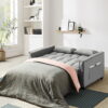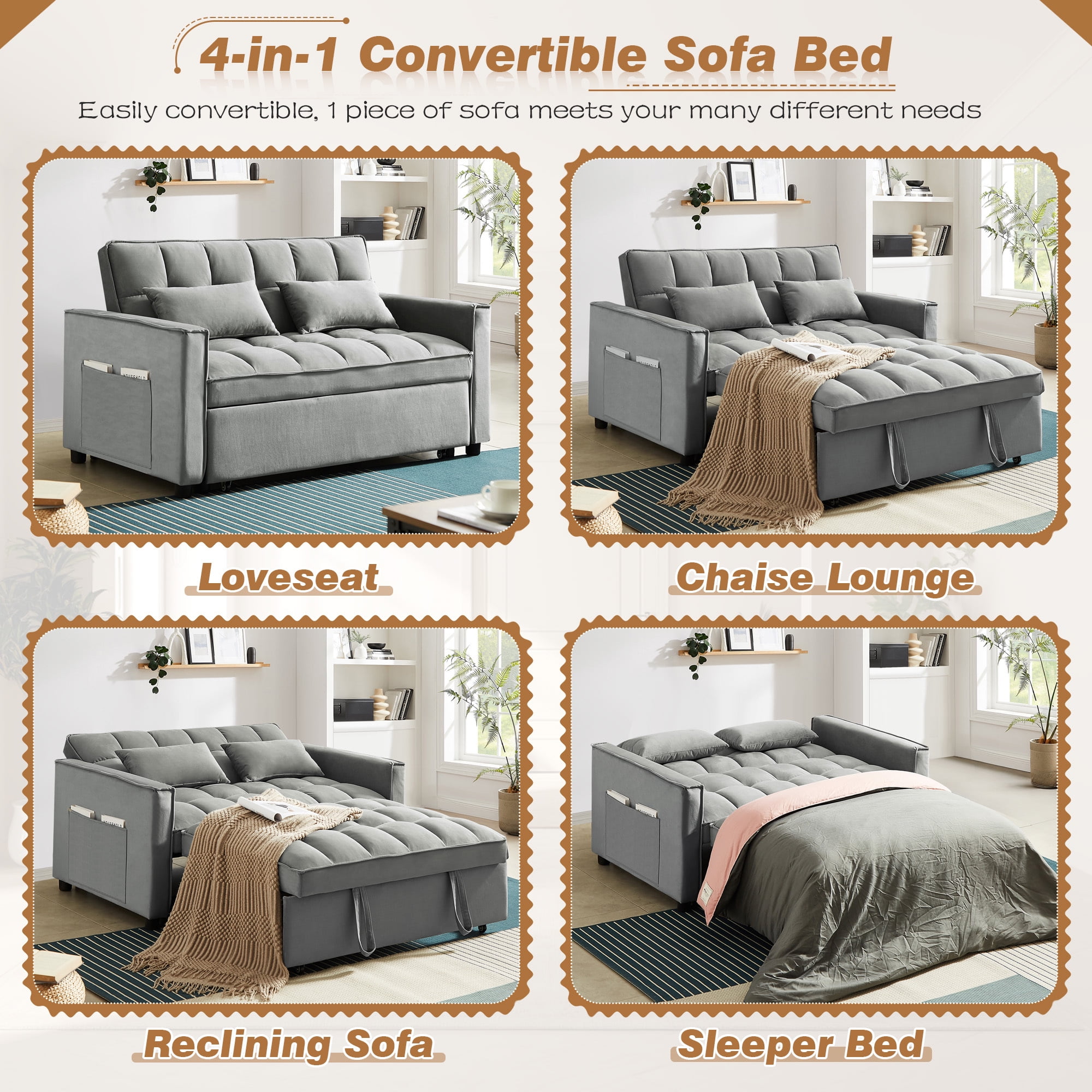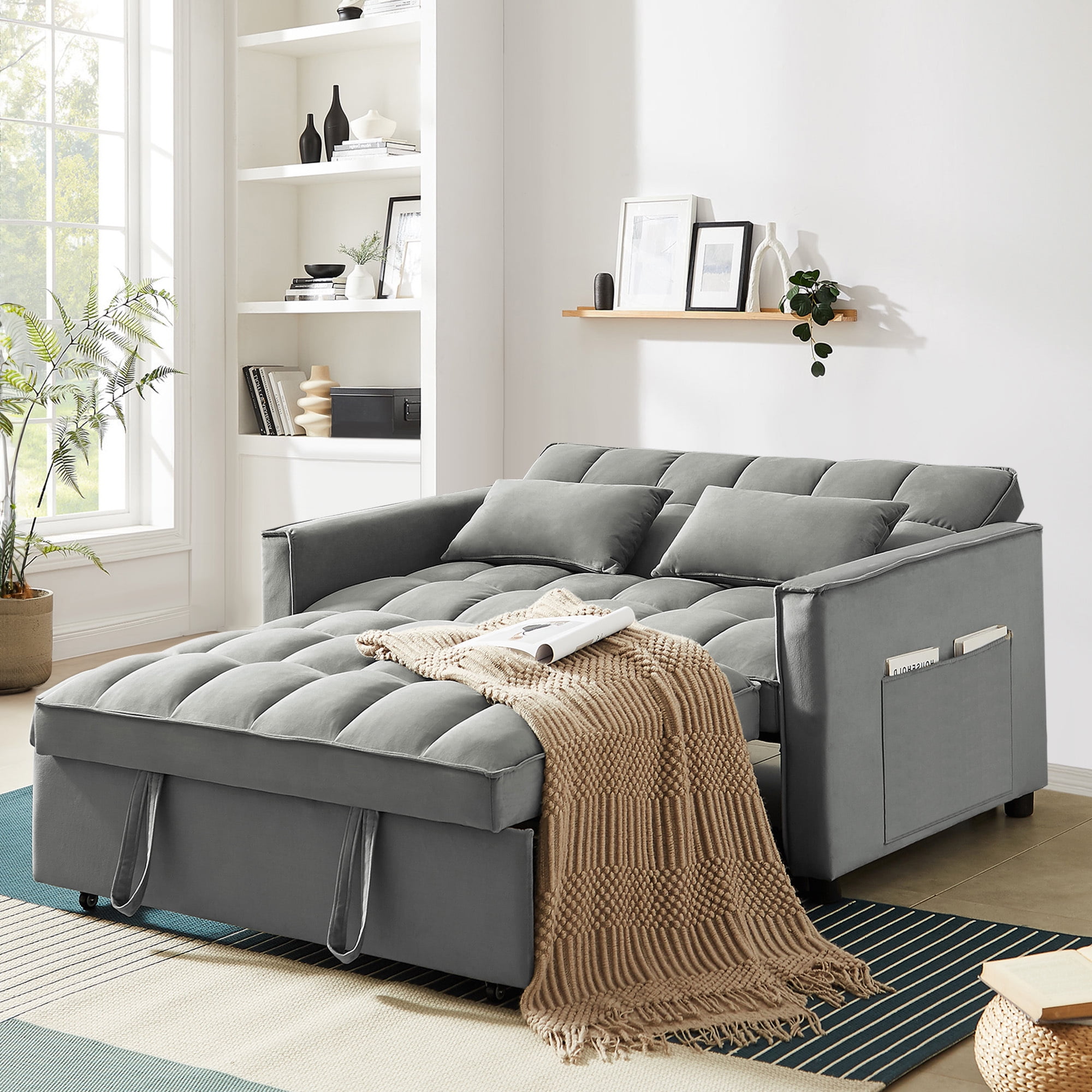 Made of high quality velvet fabric with a unique tufted design, this indoor sofa bed is elegant, comfortable and wrinkle resistant. High-density foam-filled cushions provide a cozy seating experience, and the three-position adjustable backrests allow you to find the perfect position for relaxation. This convertible futon sofa bed is also the perfect solution for overnight guests. Easily convert your sofa into a chaise lounge or recling sofa sleeper bed by pulling out the lower pull-out bed with the auxiliary drawstring. Two large side pockets are included for easy storage of everyday items such as your TV remote, cell phone, magazines and headphones. The pull out sofa bed gives you all the comfort and convenience you need.