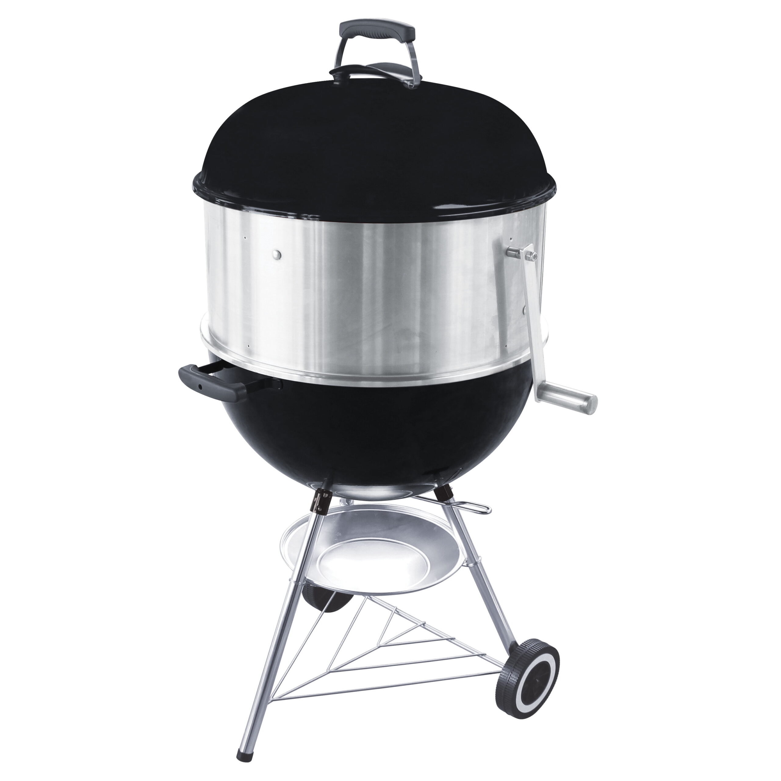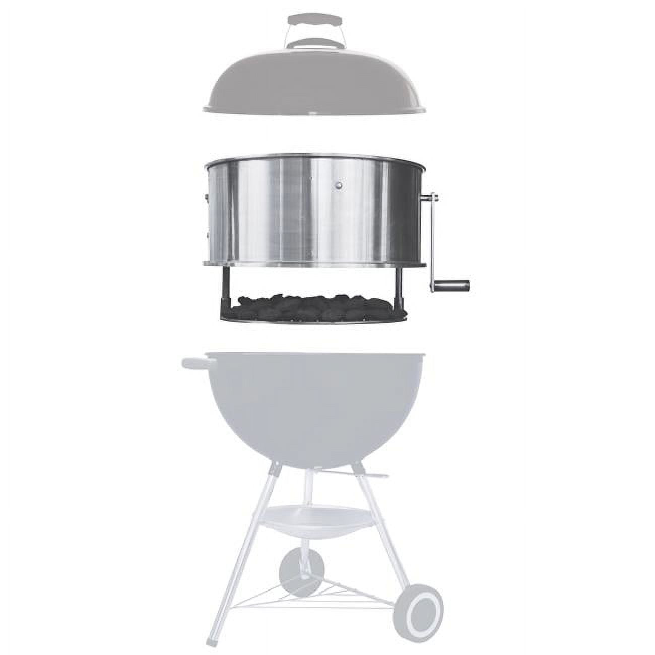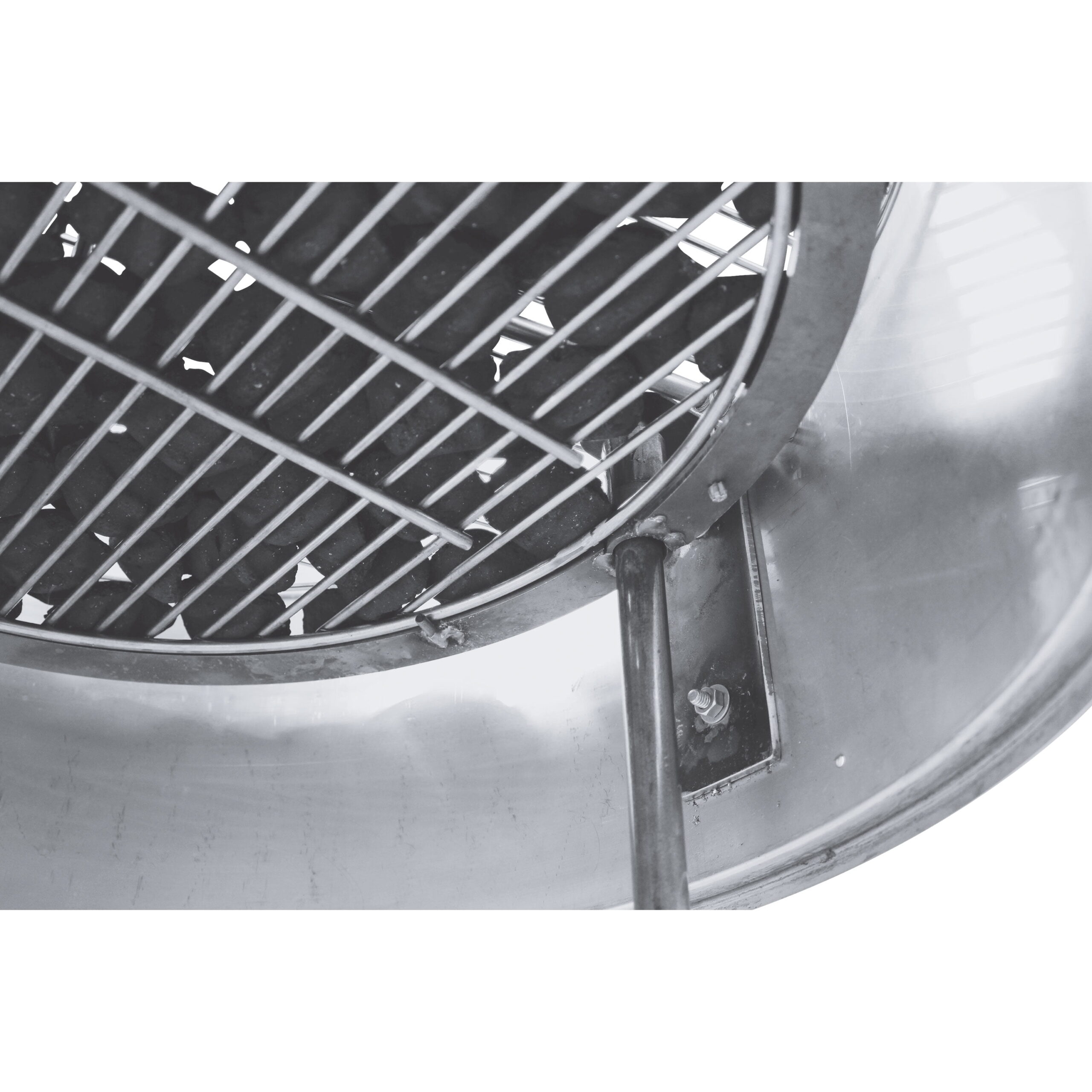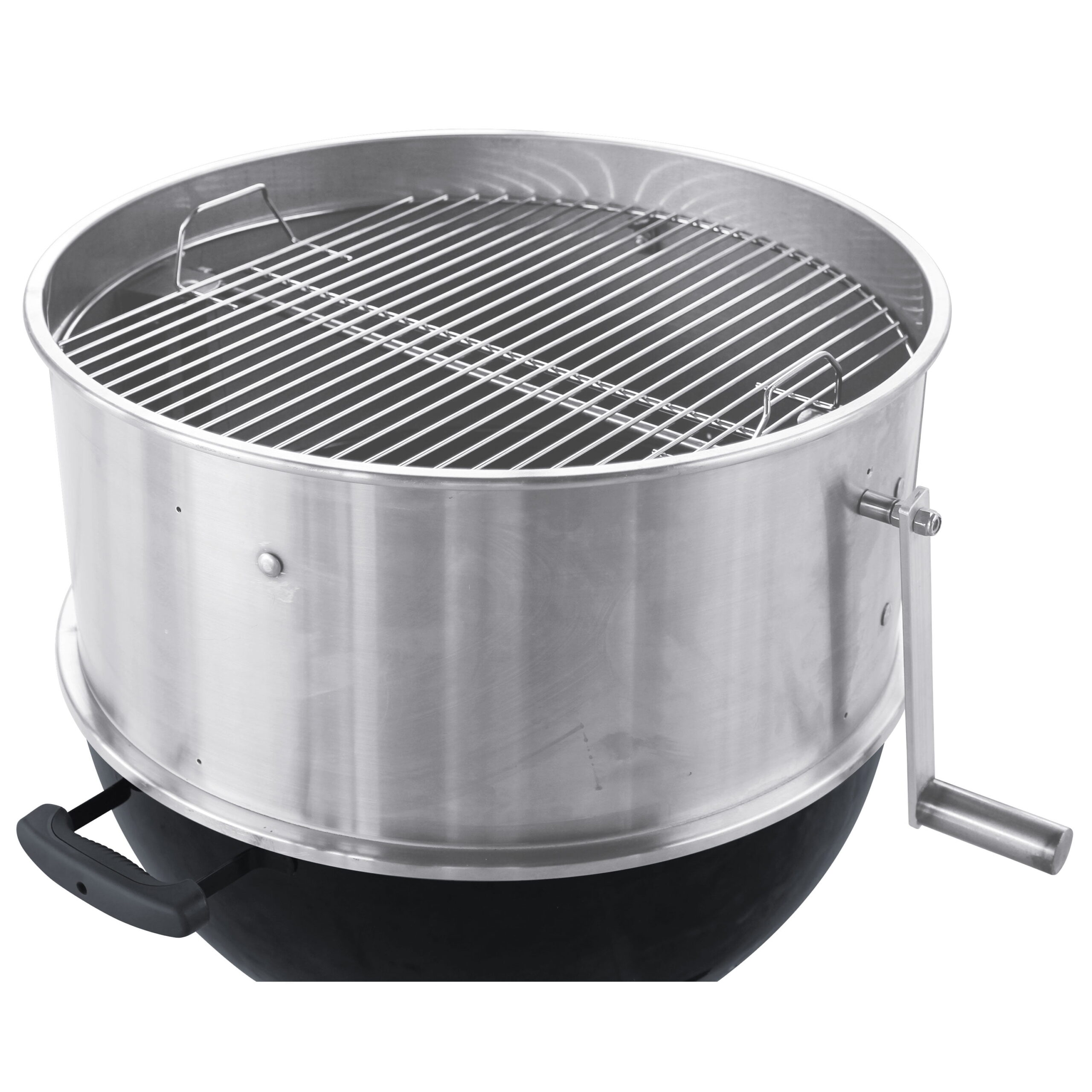 Are you looking for an authentic Argentinian-style grill but are becoming discouraged with the price tag that comes attached? Look no further! The Argentinian-Style Grill Kit provides the ability for Argentinian-style grilling at a fraction of the cost. The easy to assemble kettle grill ring sits directly on top of your 22.5” kettle grill and uses both the existing charcoal grate and cooking grate to give your unprecedented control in virtually any grilling situation. Want to sear you steak directly in the coals for a nice crisp finish? Turn the handle to lift the coal grate to direct contact with your food. Looking to cook an entire bird or rack of ribs and need a longer, consistent indirect heat? Simply lower the handle to set the coal grate a full foot away from the food. The unique weighted handle securely holds any amount of charcoal at 1.5” intervals anywhere between direct contact with the cooking grate to 12” at the fully recessed position without needing any clumsy locks or pins, and the height is adjustable before, during and after the cooking process to give you the ultimate cooking control. The patent pending Argentinian-Style Grill Kit is constructed entirely of stainless steel, making it easy to clean up when the job is finished and resistant to rust and corrosion. The existing grill lid fits directly onto the kit for on-grill storage, but is also removable in seconds once cooled for storage elsewhere.