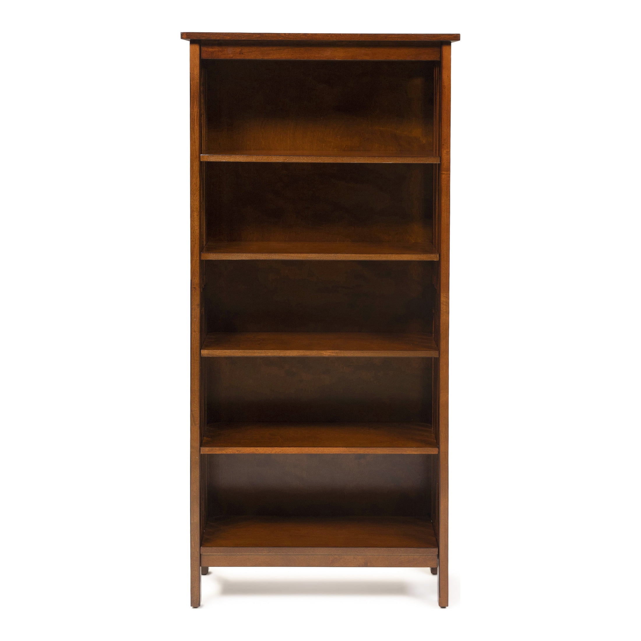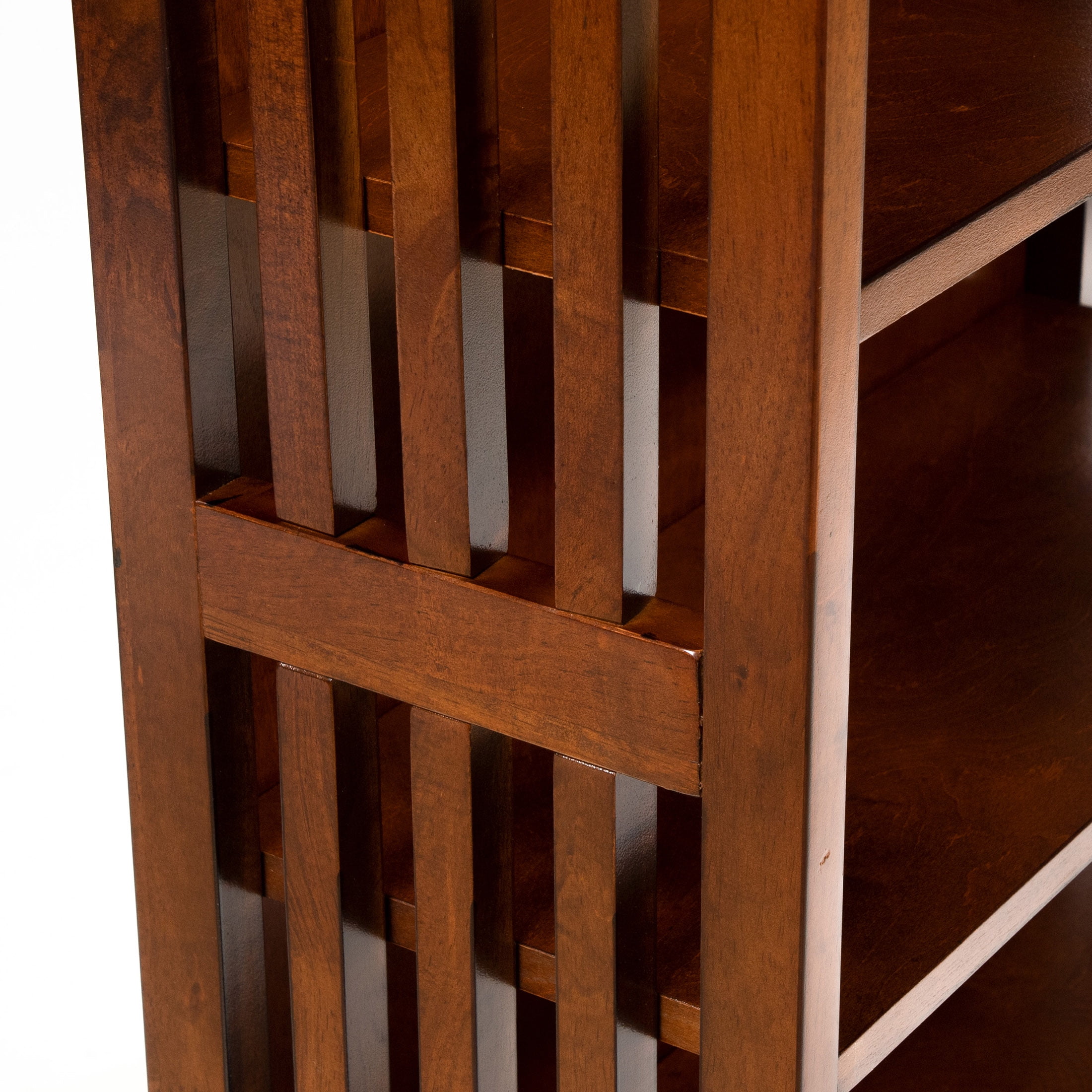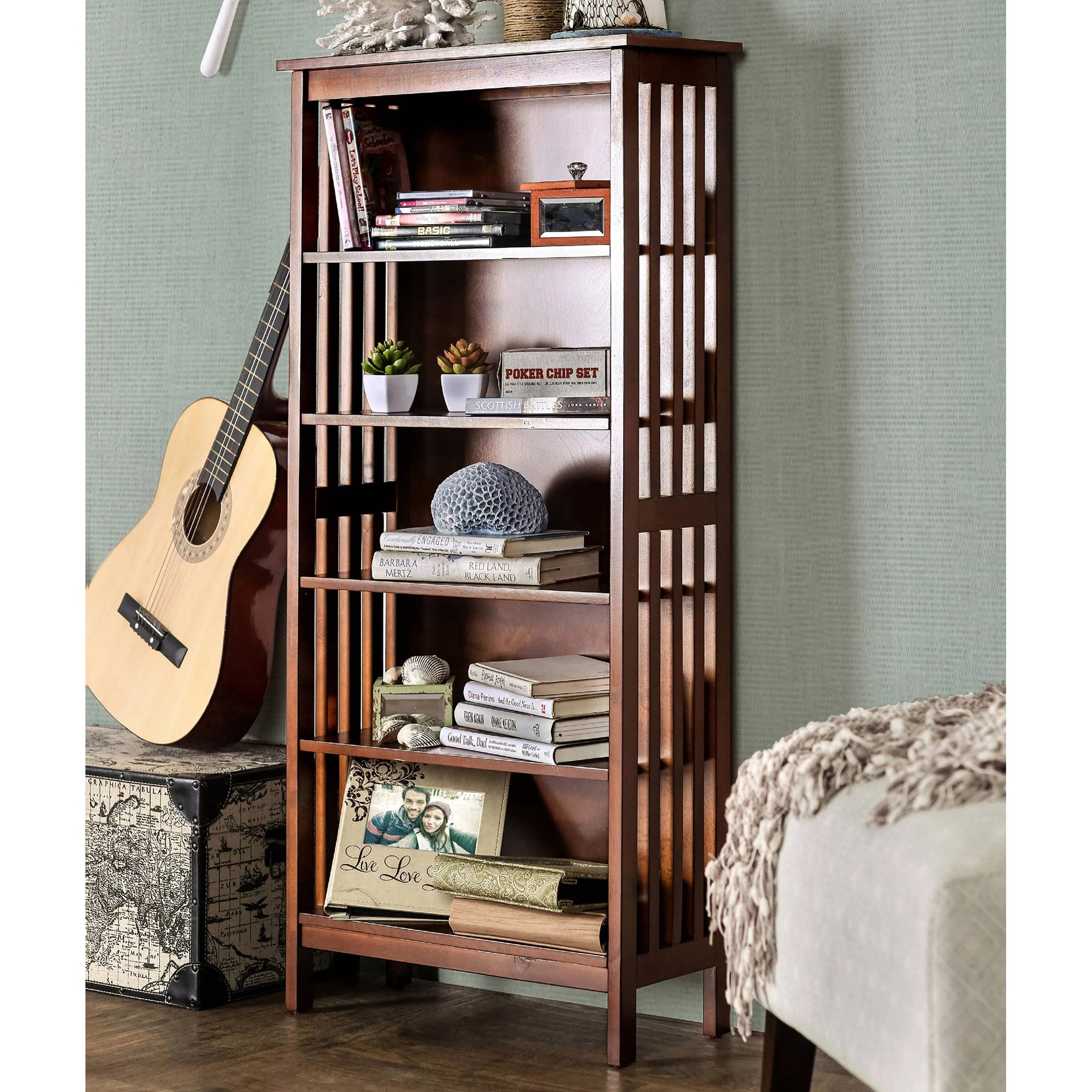 Warm up your office with this antique oak finished bookcase. Its slatted sides offer a charming rustic touch to warm up your work space. The Aziz Mission Style Bookshelf offers five shelves to store away your favorite books and other office materials.