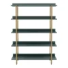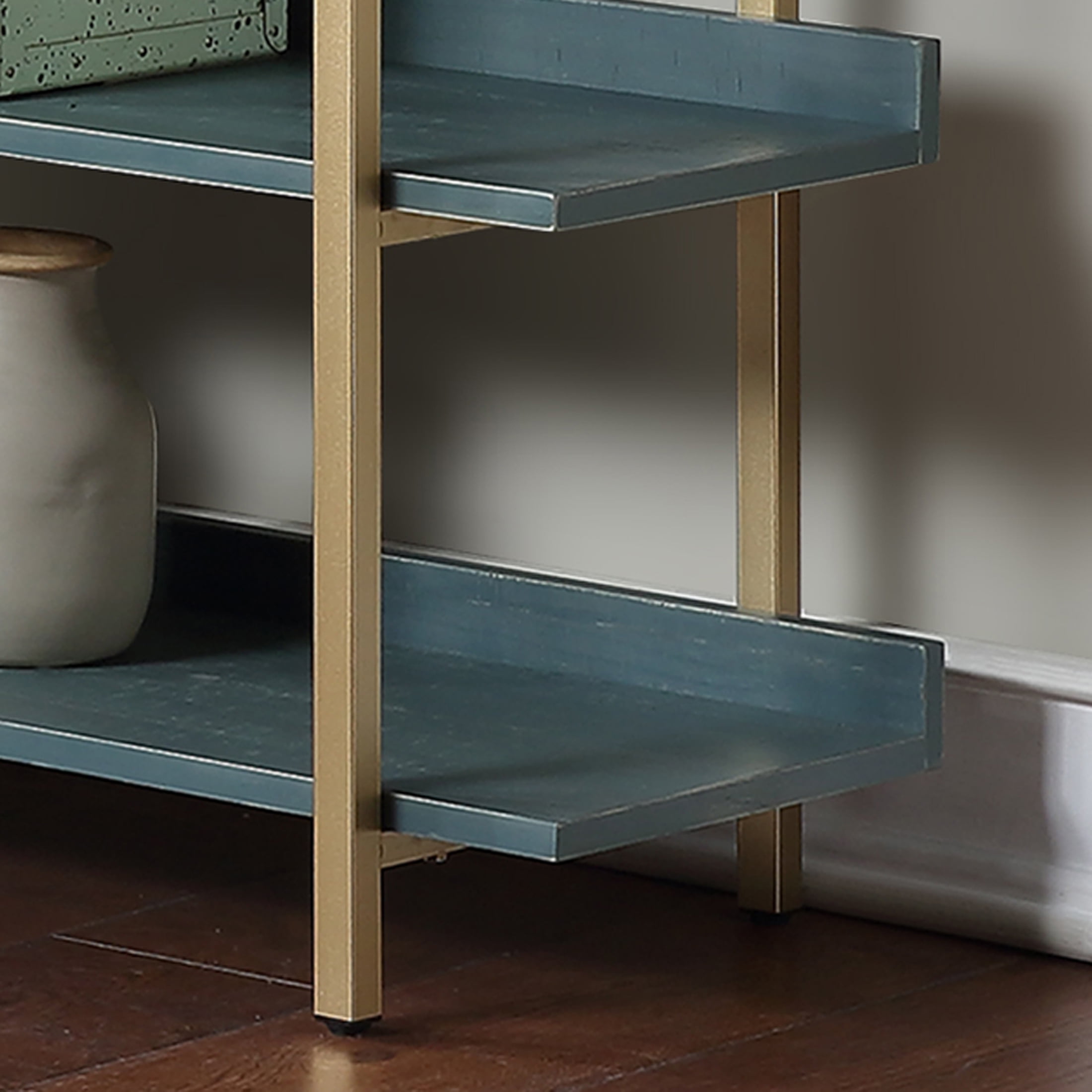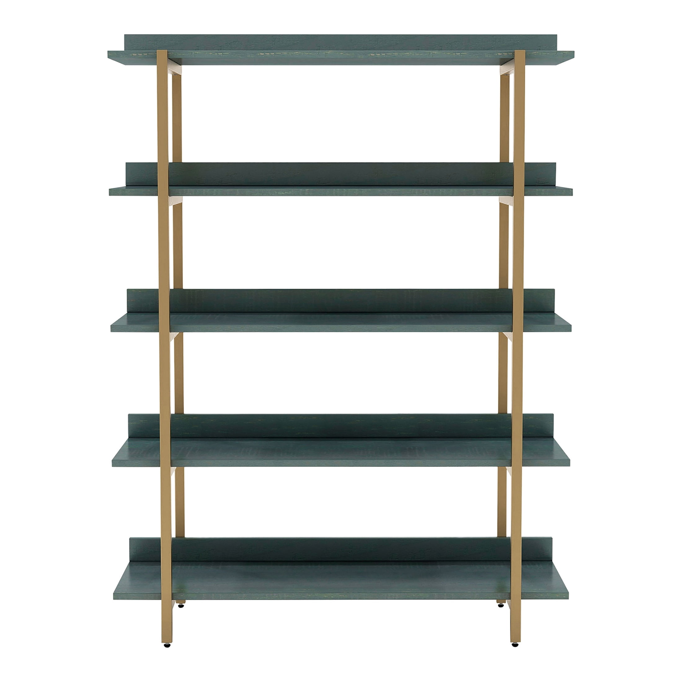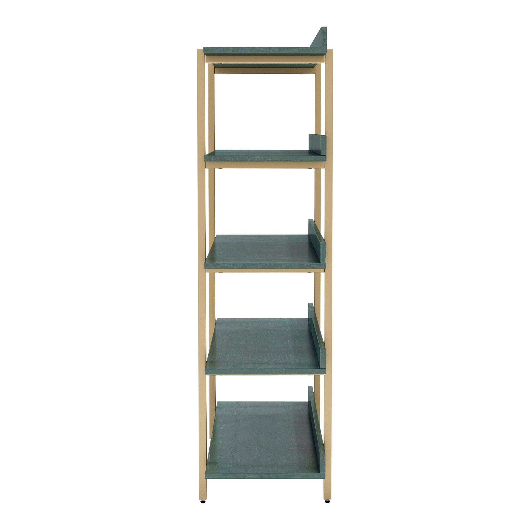 Open and eye-catching, this contemporary five-tier bookcase doubles as a room divider to define an open concept living space. It’s a bold design that combines a rich gold finish frame with antique colored shelves. Shelves are stacked one on top of another to create a vertical display space with an open back, adding exquisite versatility. Add baskets for storage or create a lovely display of personal treasures.