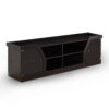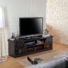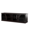 Enhance your home’s sleek entertainment room by adding this contemporary TV console into the mix! A pair of cabinets on either side of the piece feature a beautiful glass pane that is accented by the sophisticated trim along its edge. Each cabinet houses two shelves perfect for displaying decorations or movies for easy viewing while another set of centered open shelves offer room and easy wire access holes for media devices. Supported atop a flat and sturdy base, this espresso finished piece adds sleek style to revitalize your home’s decor.