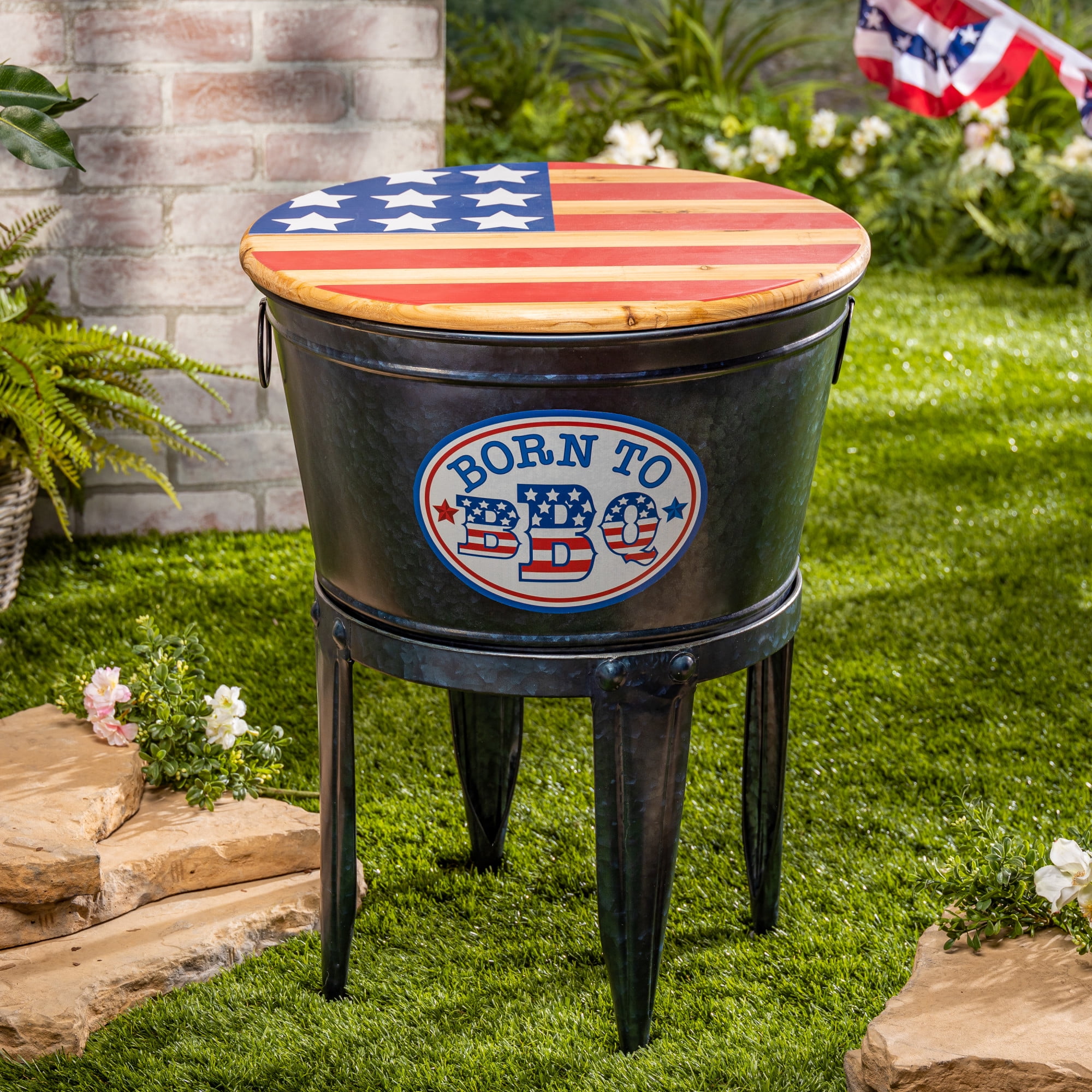 Extend your Americana home decor and love of all things BBQ onto your deck or patio with this lovely 25.75 inch high metal and wood drink cooler. This metal tub has comfortable wire handles and sits in its own matching stand. Use indoors by a sunny window for your blossoms and greenery, or outdoors for an elevated plant space. It makes a unique cooler when you have guests, holding iced beverages for all to enjoy. ‘BORN TO BBQ’ is painted on the side of this multi purpose table. The vintage style legs and tub, along with the American flag painted fir wood top will bring a touch of Americana into your home decor to be enjoyed for many years to come. Dimensions 20 in L x 20 in W x 25.75 in H. Capacity is 4.8 liters. Light assembly required.
