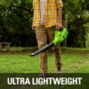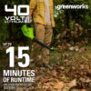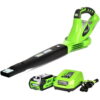 The Greenworks 40V 135 CFM Cordless Leaf Blower/Sweeper combines power and convenience for keeping your outdoor spaces clean. Delivering up to 150 MPH wind speeds and 135 CFM of air volume, this lightweight tool (only 3.39 lbs) is ideal for clearing debris and leaves from patios, driveways, and other hard surfaces. The variable speed dial and adjustable airflow tip provide precise control, while the cruise control feature ensures consistent performance. Designed for yards up to 1/2 acre, it runs for up to 15 minutes on high and requires no gas or oil, offering gas-like power without the mess. Compatible with over 75 Greenworks 40V tools, this leaf blower is backed by a 3-year warranty for peace of mind. Includes Greenworks 2.0Ah Battery and Charger.