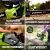 The Greenworks 40V 14” Brushless Chainsaw offers powerful performance driven by advanced brushless motor technology and a 40-volt, 2.5 Ah battery. With the capability of up to 75 cuts on 4 x 4 lumber per charge, this chainsaw ensures you complete the entire job seamlessly. The included charger rapidly powers up the battery in just 75 minutes for minimal downtime. Its 14-inch chainsaw bar provides ample length for substantial cuts, while the wrap-around handle ensures a steady and secure grip during operation. Safety features such as the chain brake and automatic oiler guarantee continuous lubrication for efficient cutting. Enjoy increased torque, extended run-time, and a longer tool life thanks to the brushless motor design. In a vibrant green color, measuring 29.5 x 9 x 8 inches and weighing only 7.6 pounds, this chainsaw comes backed by a 90-day manufacturer warranty, delivering both power and reliability for your cutting needs.