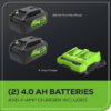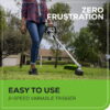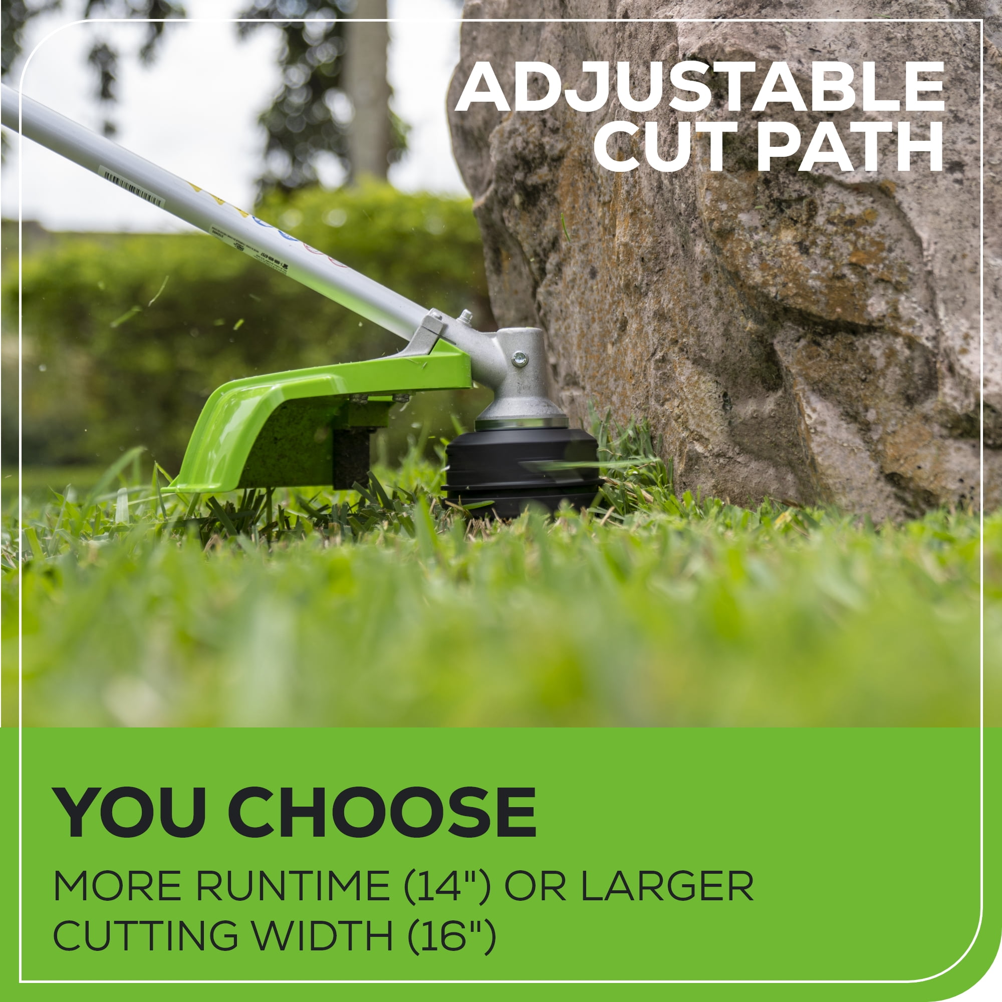 The Greenworks 2 x 24V (48V) 16″ Brushless Cordless String Trimmer is designed to optimize the performance and efficiency of grass trimming tasks. It is powered by two 4.0Ah USB batteries, which can deliver up to 45 minutes of runtime, depending on the grass condition and operator technique. The 24V battery is also compatible with over 125+ indoor and outdoor Greenworks products.With a 16″ cutting path and a dual-line, bump feed head, the trimmer allows for quick and easy line advancement, saving time and increasing efficiency. The brushless motor provides more torque, quiet operation, and longer life, ensuring optimal performance over time.The variable speed trigger enables you to control the cutting speed on the go, allowing you to easily maneuver around plants and shrubs. The trimmer is also attachment-capable, accepting Greenworks and universal attachments, such as an edger, polesaw, hedge trimmer, and more.With an ultra-lightweight design and superior ergonomics, the trimmer reduces user fatigue, making it easy to use for extended periods. Additionally, the trimmer is virtually maintenance-free, with no gas, oil, or emissions, making it a more environmentally friendly option. It starts instantly, runs quietly, and delivers the power you need to get the job done efficiently.
