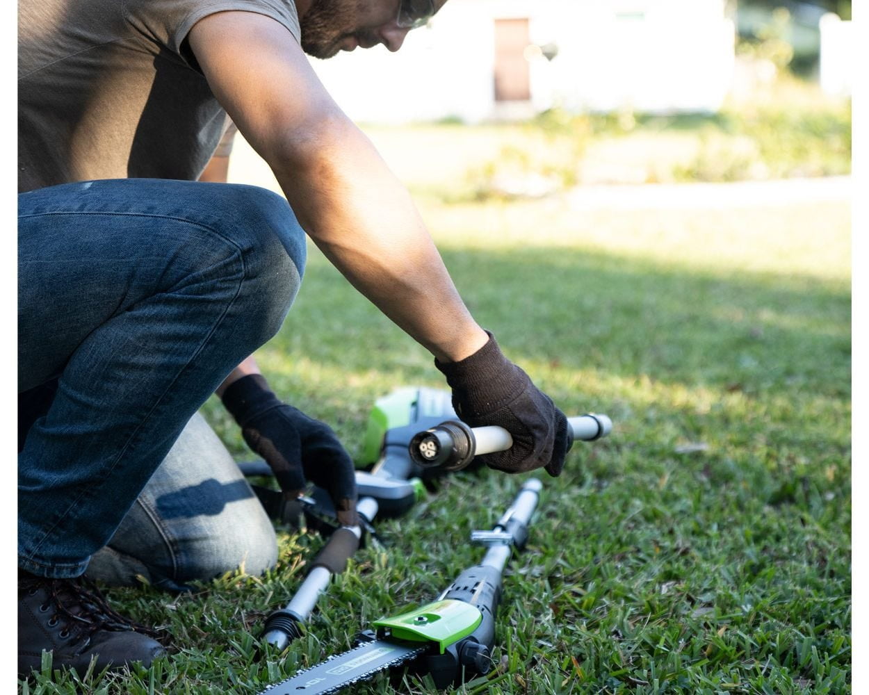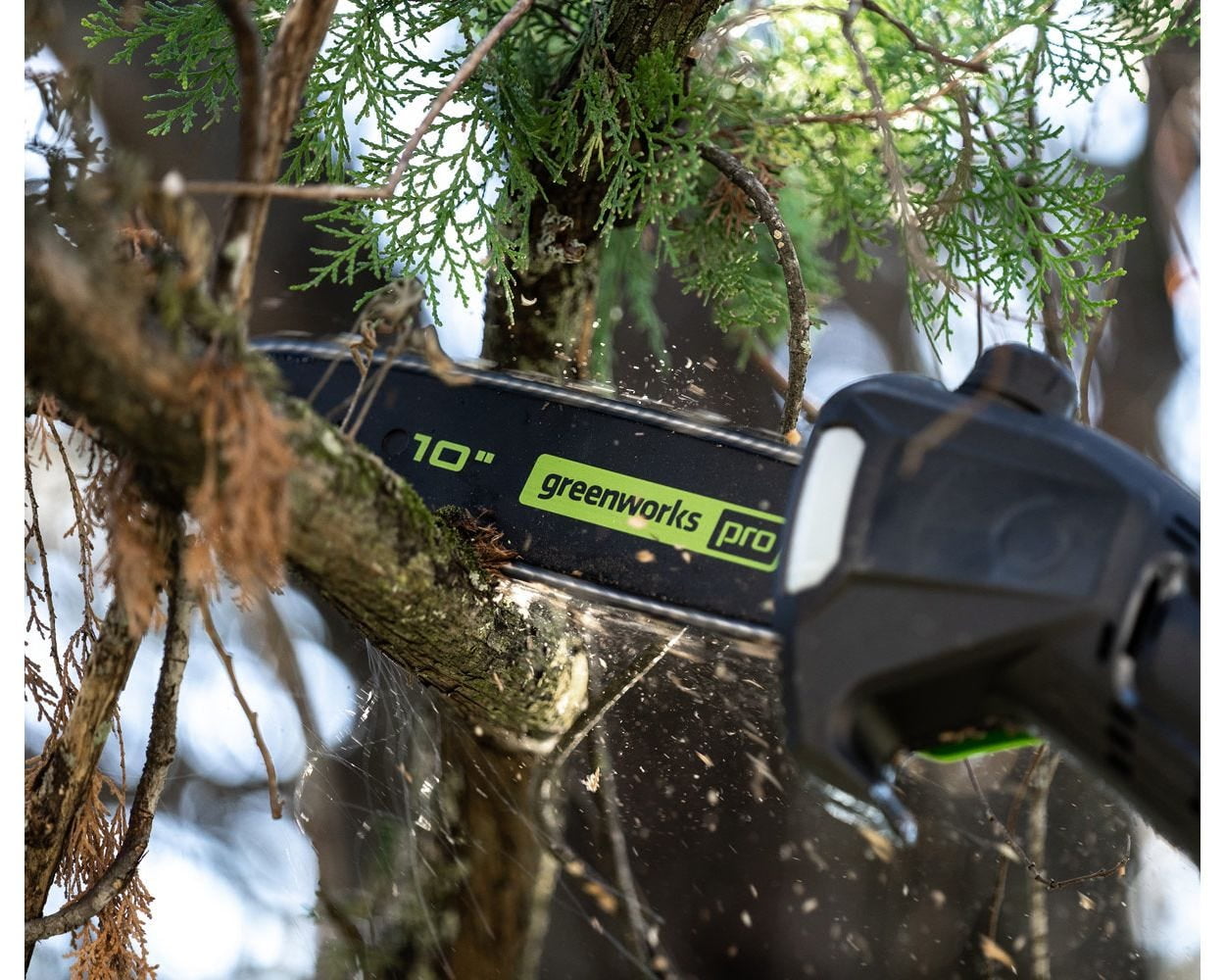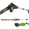 The Greenworks 60V 10″ Cordless Battery Pole Saw & 20″ Pole Hedge Trimmer Combo Kit is perfect for all your yard clean-up, storm clean-up, and general pruning needs when extended reach is required. The cordless pole saw features a 10″ bar with a high-performance 1/4″ chain for quick cutting, while the cordless pole hedge trimmer boasts dual-action 20″ laser-cut steel blades for longer life. With an easy-starting system that requires no priming, choking, or pulling, you can start working quickly without hassle. Advanced brushless motor technology delivers major torque, power, and longevity with no maintenance needed. The kit includes a 2.0 Ah battery and charger, and both tools come with a 4-year limited warranty for peace of mind.