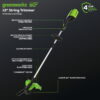 Powered by a 60V lithium-ion battery, this Greenworks combo kit provides more power and performance than typical gas-powered trimmers – without the noise, fumes, or harmful emissions. It features our Load N Go spool head for super-fast, hassle-free line reloading on the fly. And with a durable die-cast aluminum trimmer head, it’s made to last. This compact, lightweight cordless string trimmer starts with the squeeze of a trigger, with no aggravating pull cord. Plus, there’s no need to worry about spilling, mixing, or storing oil and fuel. The powerful Greenworks 60V UltraPower cordless battery platform gives you all the power you need to tackle all your lawn care projects. Kick gas to the curb this spring and go green with no fumes, no mixing, no maintenance and no pull cords. Let Greenworks help you take the work out of yard work. When you’re done, the 60V battery charges in just 80 minutes so you are always ready to power over 75 Greenworks tools. Life. Powered by Greenworks.