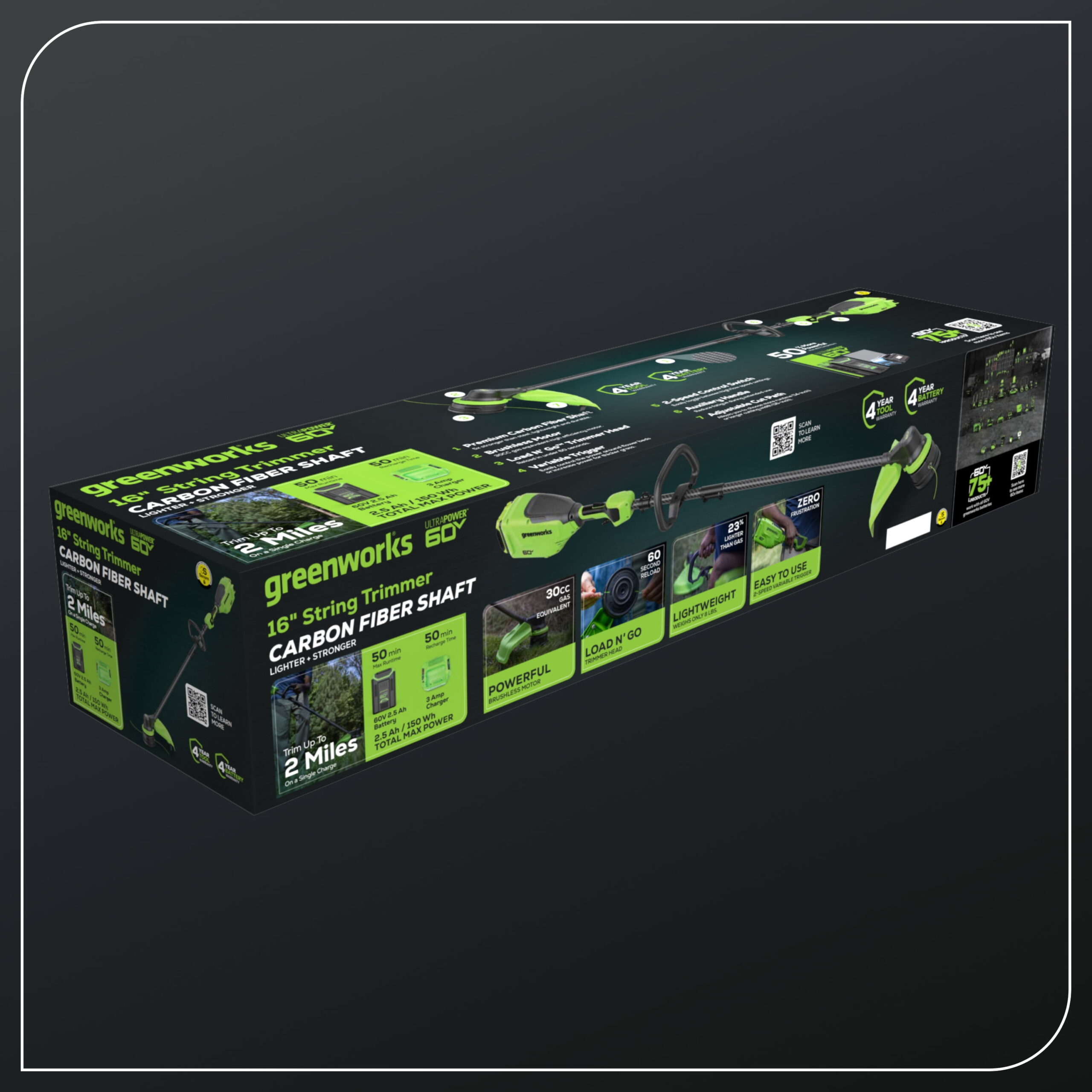 The Greenworks 60V 16” Carbon Fiber Shaft String Trimmer with 2.5 Ah Battery and 3 Amp Charger is all about power and efficiency. With the ability to trim up to 2 miles on a single charge, this trimmer will keep your yard looking pristine without any interruptions. The 2.5 Ah battery provides an impressive 50 minutes of runtime, while the 3 Amp charger allows for a quick recharge in just 50 minutes. Constructed with a premium carbon fiber shaft, this trimmer is not only lightweight but also 5x stronger than steel, ensuring long-lasting durability. And with its 30cc gas equivalence, the trimmer is 23% lighter than gas models, making it easy to maneuver and handle. Includes 2.5 Ah lithium-ion battery, 3 Amp charger. Battery is compatible with 75+ Greenworks Pro 60V products.