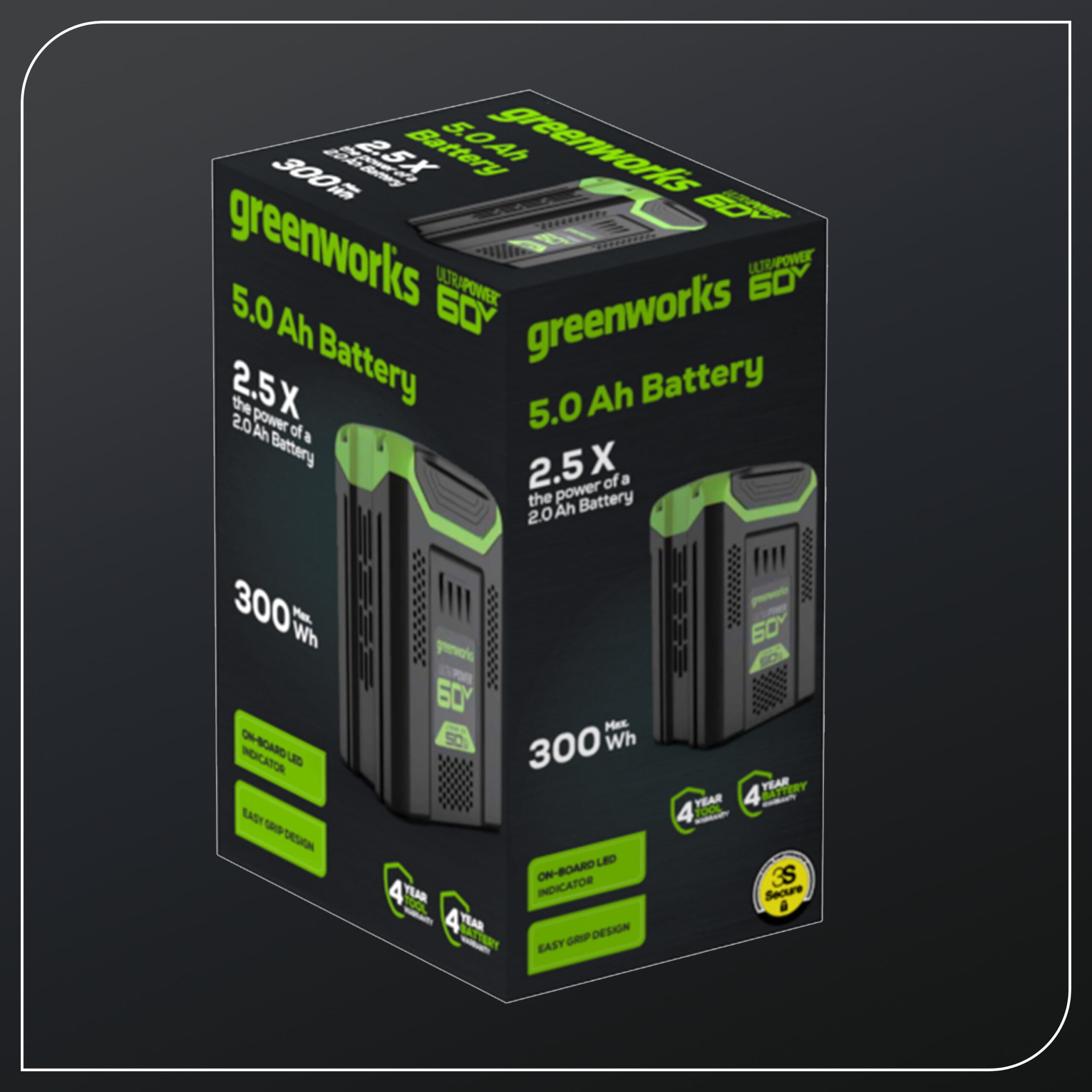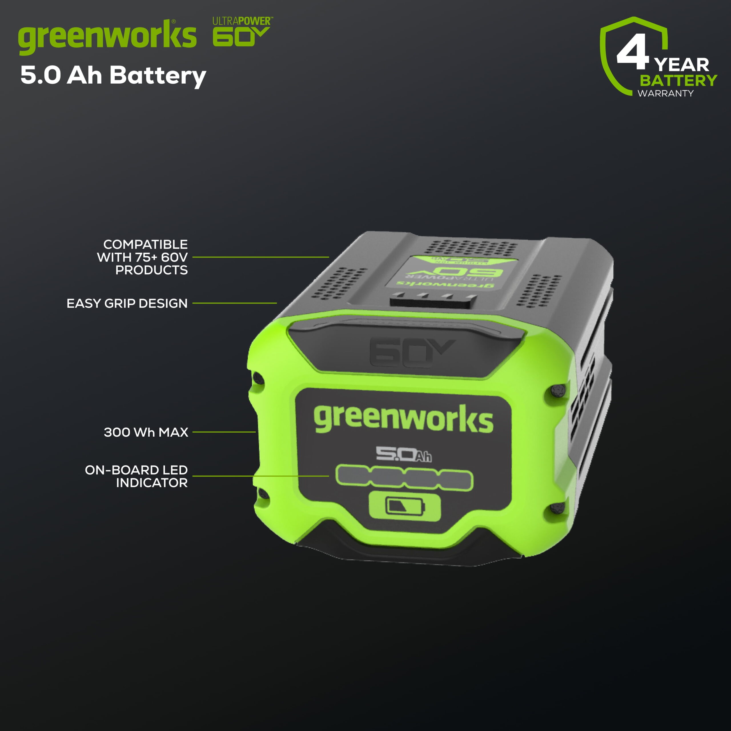 The new Greenworks 60V 5.0 Ah HC Battery is the perfect companion for all your power tool needs. Designed to deliver maximum performance, this high-capacity battery is compatible with all Greenworks 60V tools, making it extremely versatile. Say goodbye to the hassle of memory loss after charging, as this battery provides fade-free power and maintains its performance over time. With the on-board battery fuel indicator, you can easily check the remaining power at any time, ensuring you never run out of juice in the middle of a project. Plus, with a 4 Year Limited Battery Warranty, you can have peace of mind knowing you’re investing in a reliable and long-lasting battery. Power up your tools with the Greenworks 60V 5.0 Ah Battery and experience the difference in performance and reliability. Product weight: 4.69 lbs.