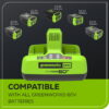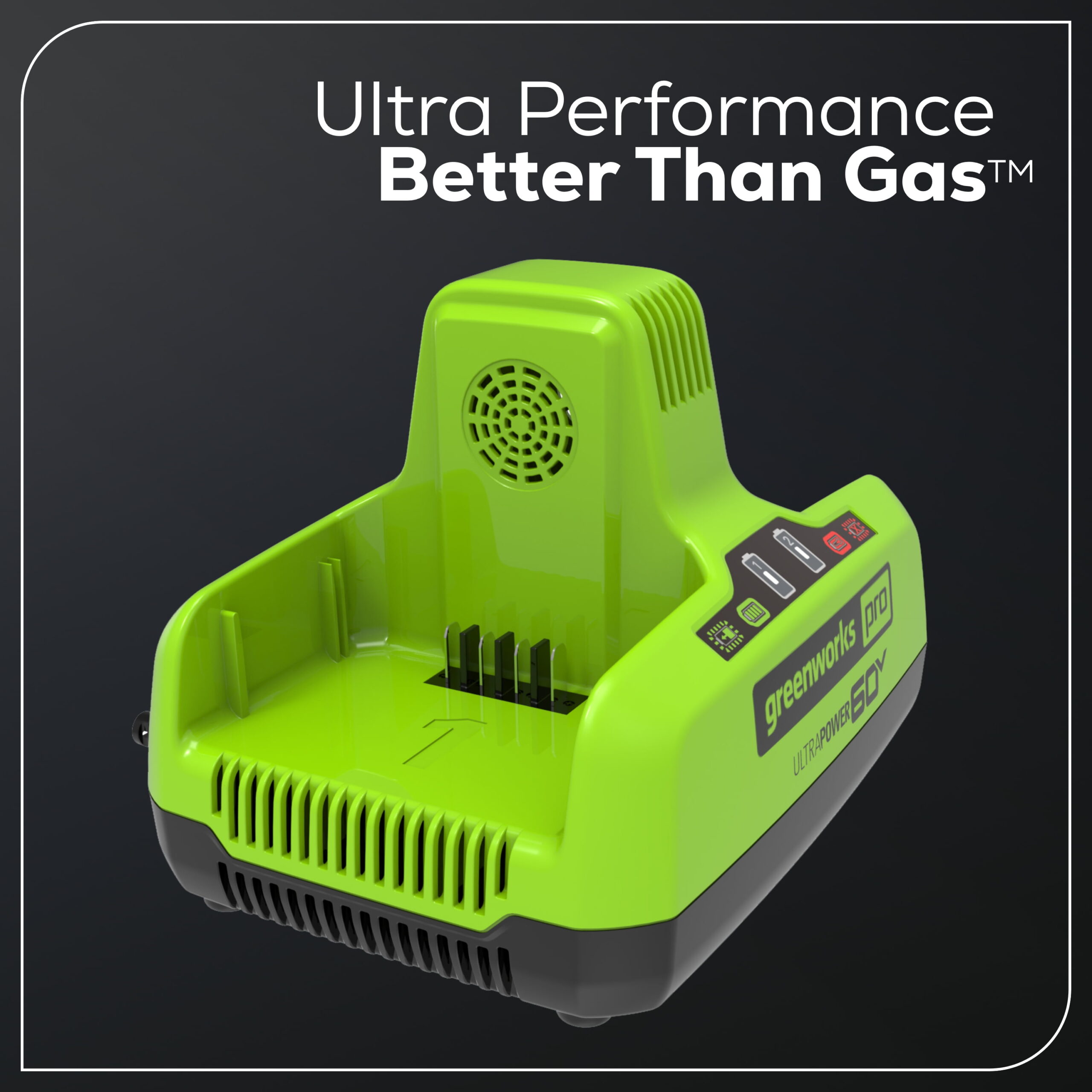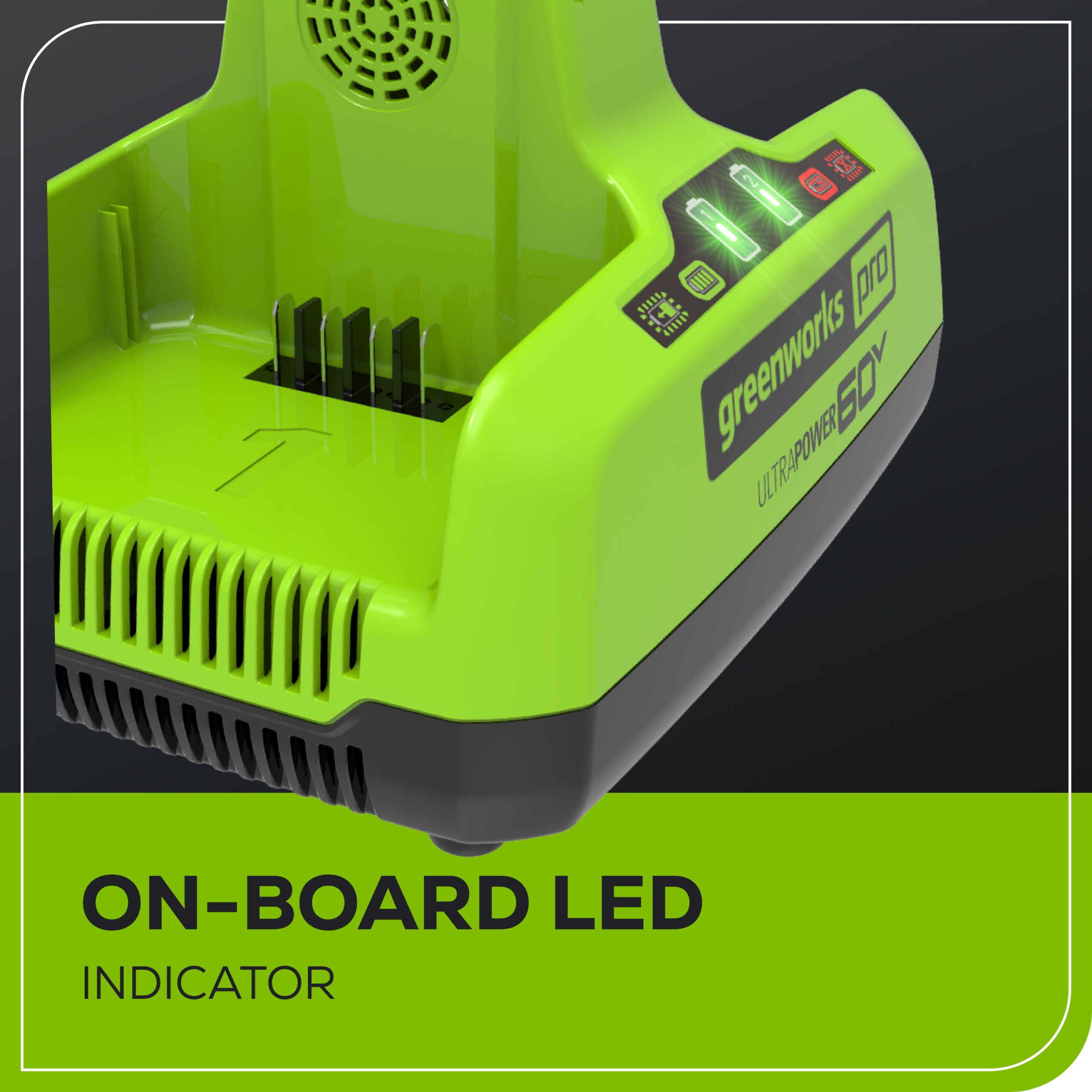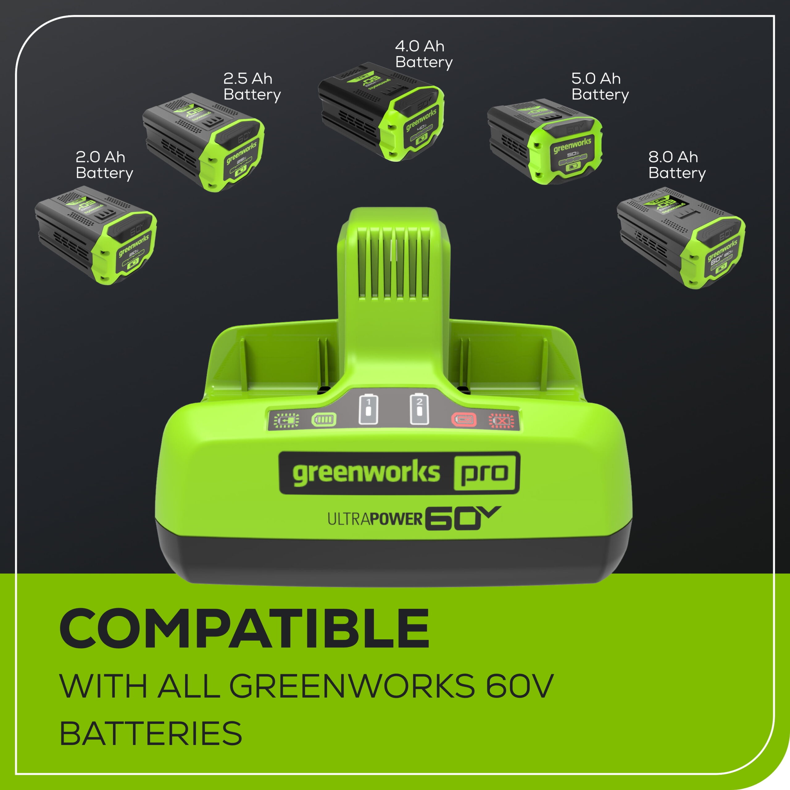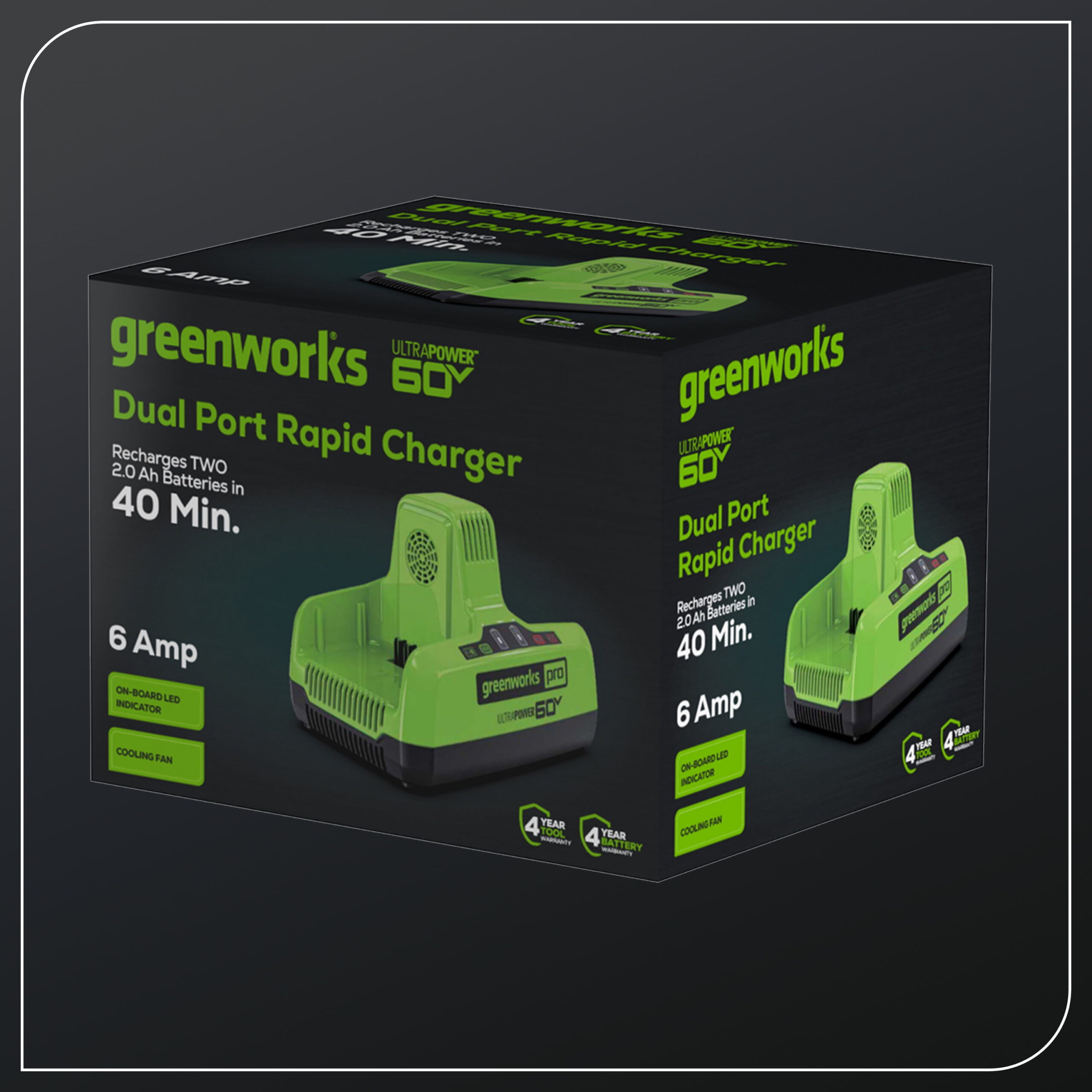 Power all of your tools with ease thanks to your Greenworks 60V 6 Amp Dual-Port Turbo Battery Charger. This 6 Amp battery delivers fade-free power with no memory loss after charging. This battery charger provides the power needed for maximum performance by simultaneously charging 2 batteries. Each 60V battery has an LED indicator that shows the remaining battery charge. Compatible with all Greenworks 60V batteries. 4 Year Limited Tool Warranty.