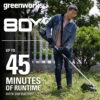 Ideal for neighborhoods with noise ordinances, the Greenworks GST80321 80V cordless lithium-ion 16″ String Trimmer Kit will breeze through the job without disturbing others. Designed for durability and heavy duty jobs, this unit features a brushless motor that delivers the power and performance of a 32cc gas engine, all while being lightweight and easy to use. Complete with a battery, charger, and shoulder strap, this kit will get your job done without the maintenance and high cost of gas.