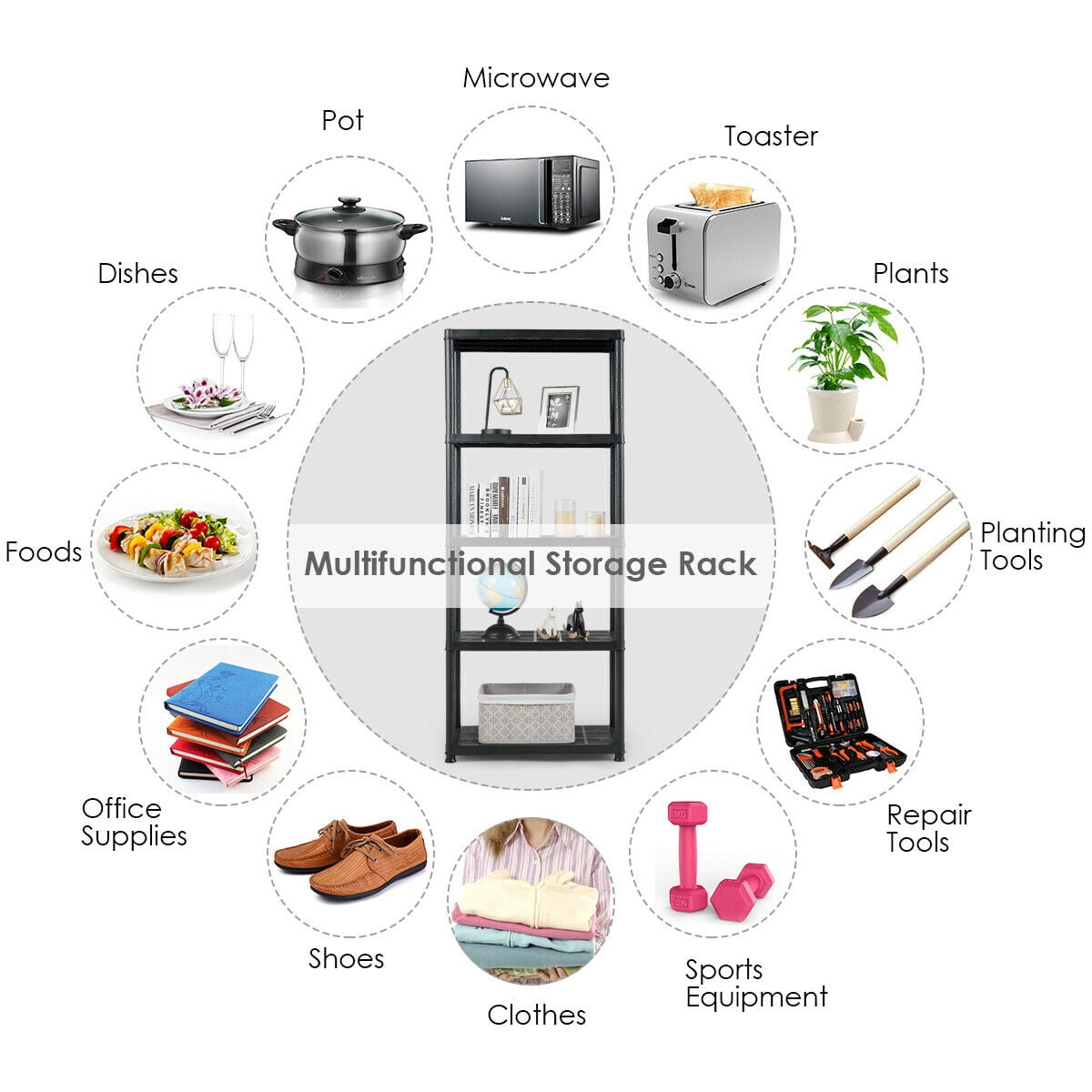Description: A practical storage shelf to enlarge your storage space. The boards and tubes of the rack are made of thick and solid plastic, which is sturdy and not easy to deform. It can stand firmly on the floor and provide large weight capacity. For indoor using, the rack can be placed in kitchen, study room, garage and office for some tools, cookers, boxes and office supplies. With waterproof surface, the rack is suitable to be used outdoors for plants and some garden supplies. You can choose how many layers you need according to the height of place. And equipped with tilting preventing devices, the rack will not fall forward because of fixing against the wall.