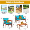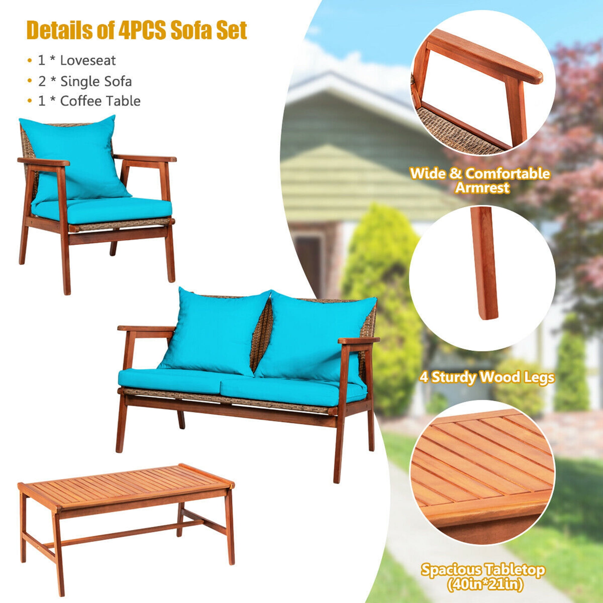 This 4-piece wooden sofa set with concise style is ideal to be placed in your patio or garden. Made of premium acacia wood and rattan, the whole frame is sturdy and not easy to crack or deform. All the single chairs and loveseat are equipped with soft and high-resilient cushion for seat and backrest. You will get excellent comfort if you sit on the sofa. In addition, the zippered cover can be removed conveniently for rinsing. Each piece of our set is independent so that they can be rearranged based on your preference. Comes with a coffee table, you can put drinks, snack, magazines and fruits on. Please enjoy your leisure time with your friends or family in your balcony, garden or backyard.