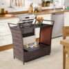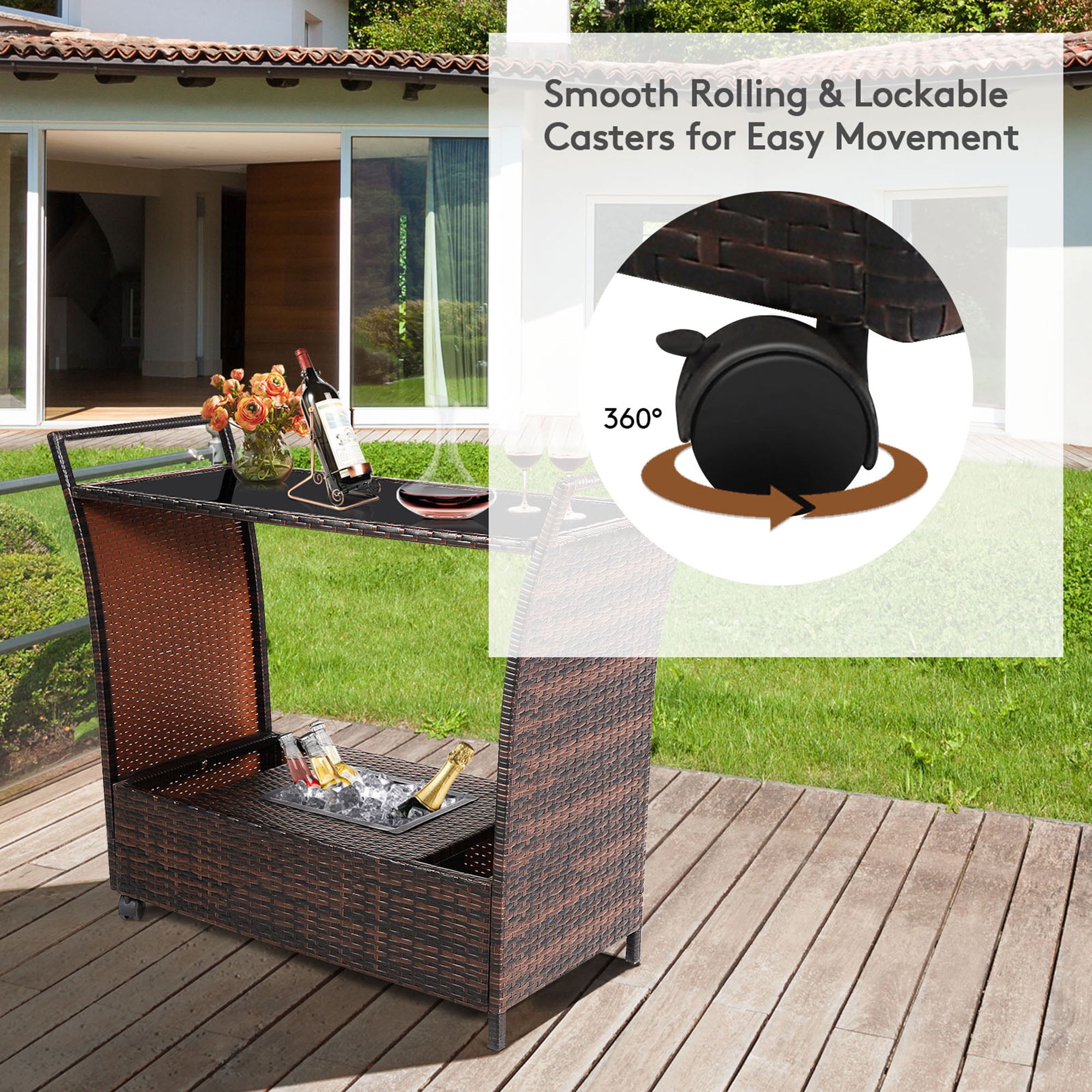 This rattan bar cart with ice bucket is a perfect choice for you to entertain guests or have a meal with your family members outdoors. Made from solid powder coated steel frame and all-weather rattan, this wine serving cart ensures great stability and durability for long-lasting outdoor or indoor use. Besides, the high quality tempered glass tabletop provides ample space for drinks, snacks and food. Thanks to the flexible wheels and humanized handles, you can easily move the bar cart to any place. Moreover, the modern yet simple design made the cart look great in any setting, which is suitable for garden, patio, balcony, yard, poolside and more.