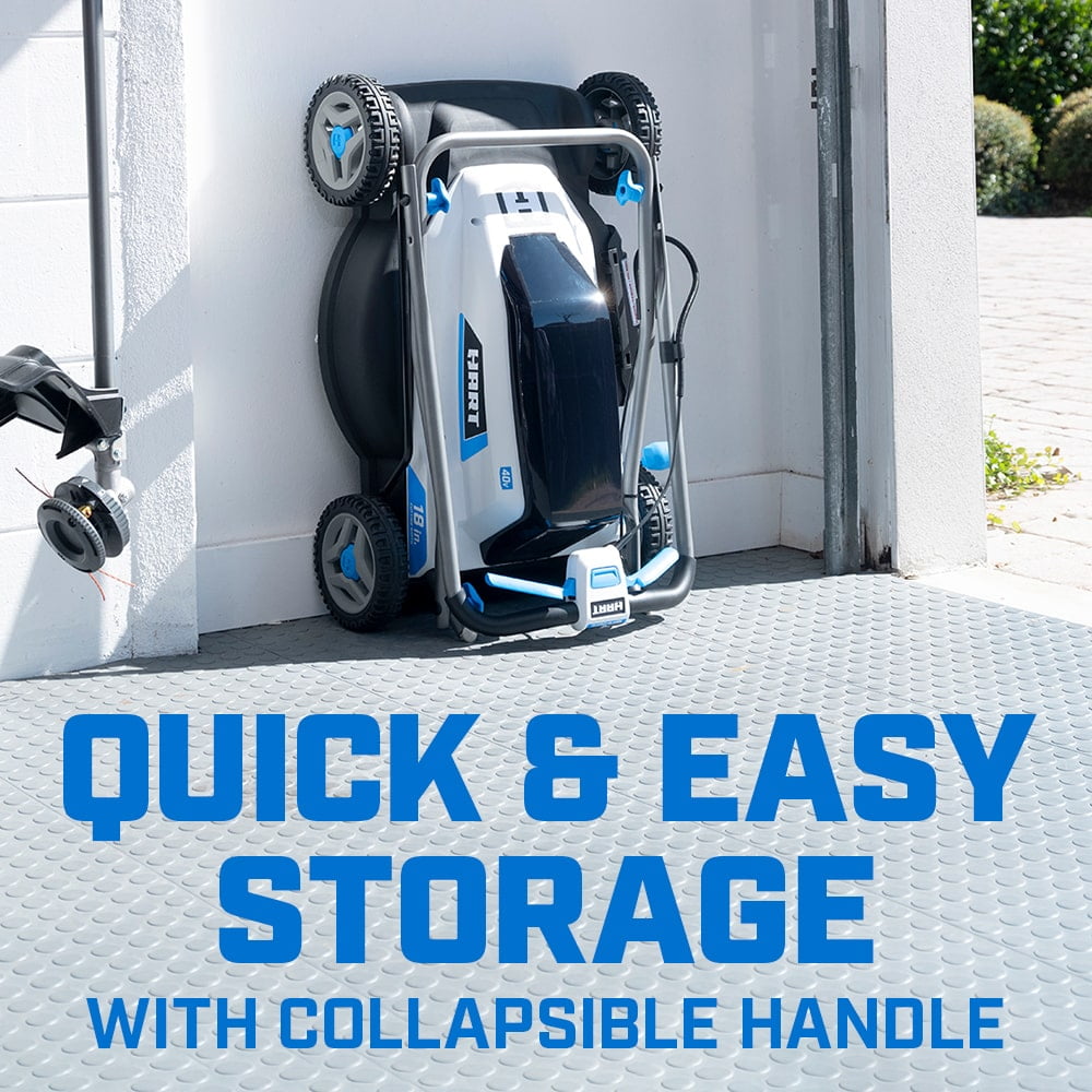 Tired of grass getting stuck under the deck of your mower? Also tired of cleaning blades? If so, then you should consider this electric 40V 18” Side Discharge Mower. It features a side-discharge chute that evenly disperses grass clippings onto the lawn. (Which, by the way, is great for your lawn.) Our lightweight, cordless unit also mulches too. The addition of a single point height adjust makes it easy to tackle mowing of various grass heights from 1-1/2″”-4″”. Also goodbye to annoying pull cords. This battery-powered machine starts with just the push of a button—and cuts up to 1/4 of an acre on one charge. Works with All HART 40V Batteries. Includes: 40V 18” Side Discharge Mower, 6.0Ah battery, charger, side-discharge chute, start key, mulch plug and operator’s manuals.