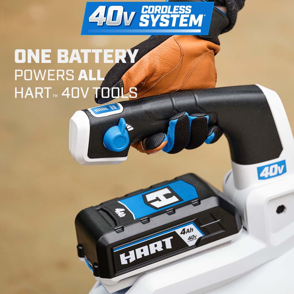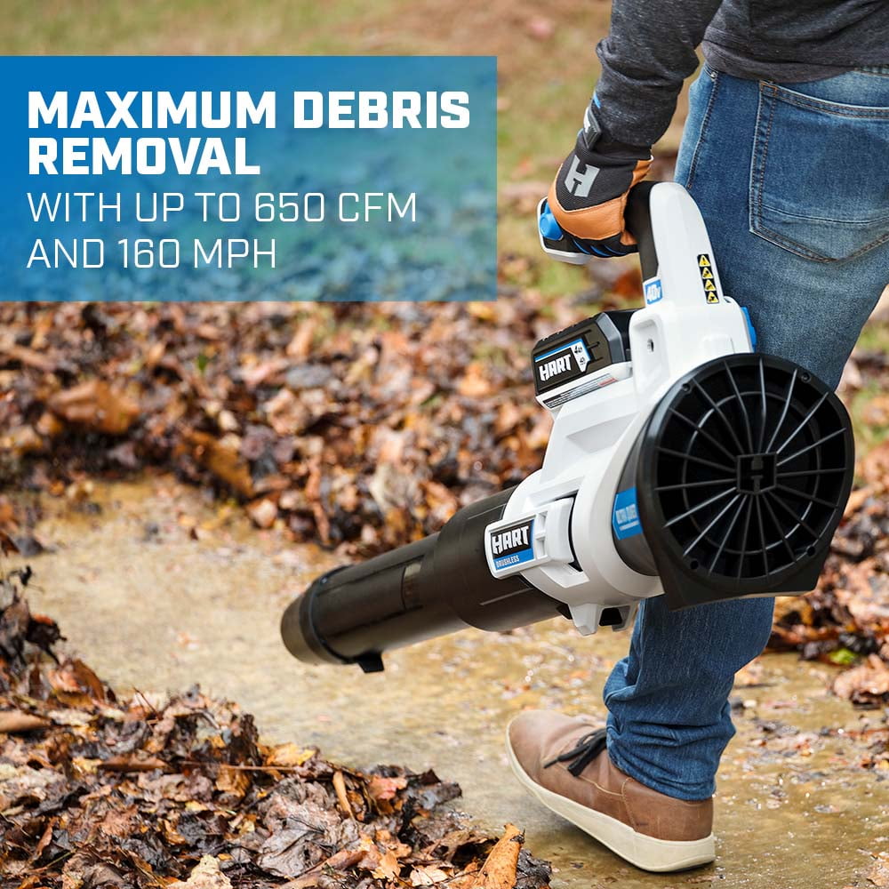 For high-volume cleanup, you can count on HART’s 40V SUPERCHARGE Brushless 650 CFM Blower to clear your yard quickly and efficiently. Not only does it clear stubborn materials such as wet leaves, but also lifts and moves twigs, grass clippings and more. The turbo fan design with speed tip provides 650 CFM and 160 MPH of power, while the variable speed trigger gives you the ultimate control. Its lightweight, compact design provides the ultimate user comfort during extended periods of use. Plus, there’s no stubborn start-up cord to deal with. Just press the turbo button for maximum clearing power. Battery power also eliminates the fumes and mess that comes with gas-powered blowers. The Brushless Motor Technology delivers more power, longer runtime and longer motor life. It’s also cordless, so you’re free to work anywhere without tripping over or getting tangled up in cords. Finally, the *Ultra-Quiet Technology* makes it our quietest blower to date. The included 40V 5.0Ah battery is compatible with all HART 40V tools. With powerful brushless motors, premium features, and fast charging, HART 40V SUPERCHARGE is the perfect choice for yards without compromise.