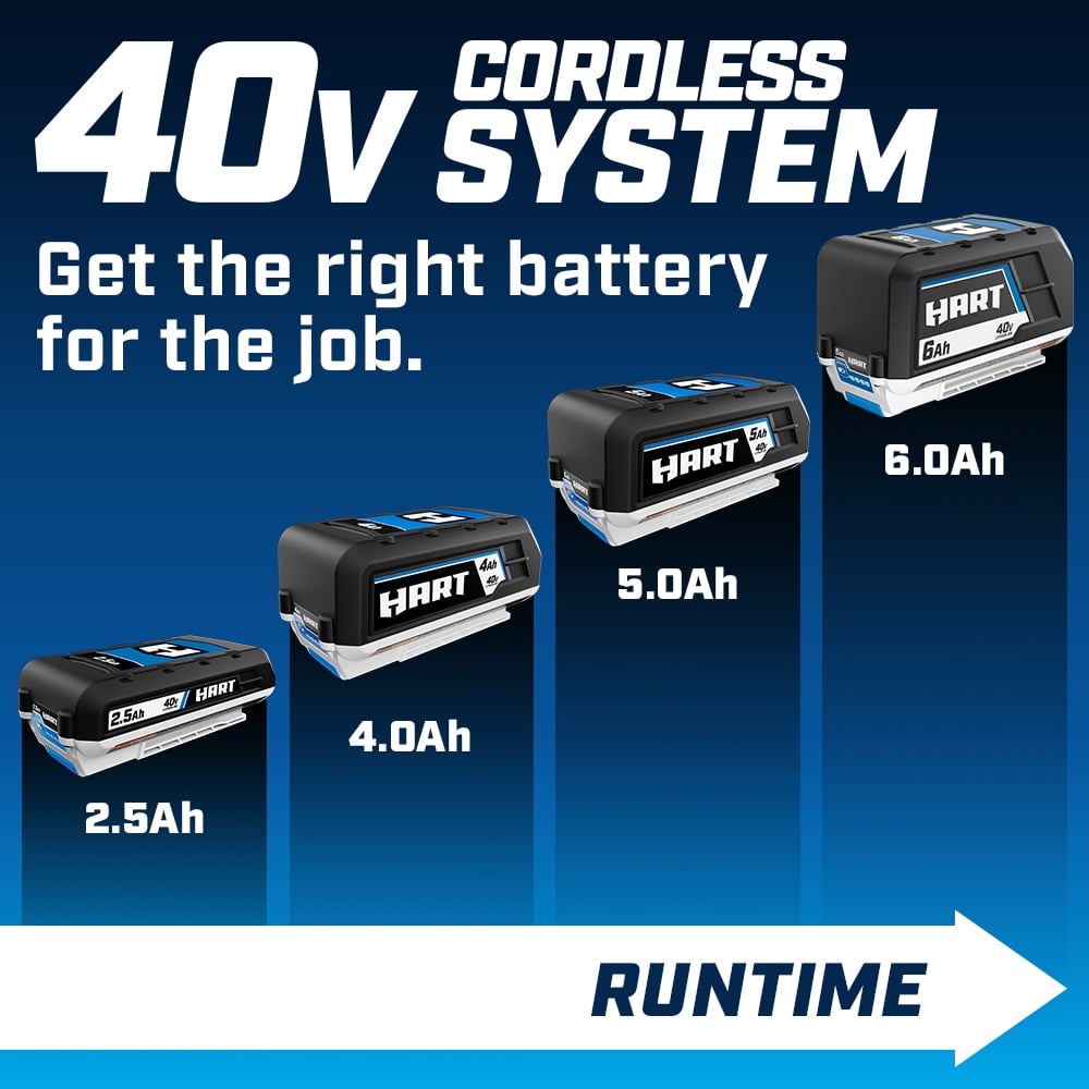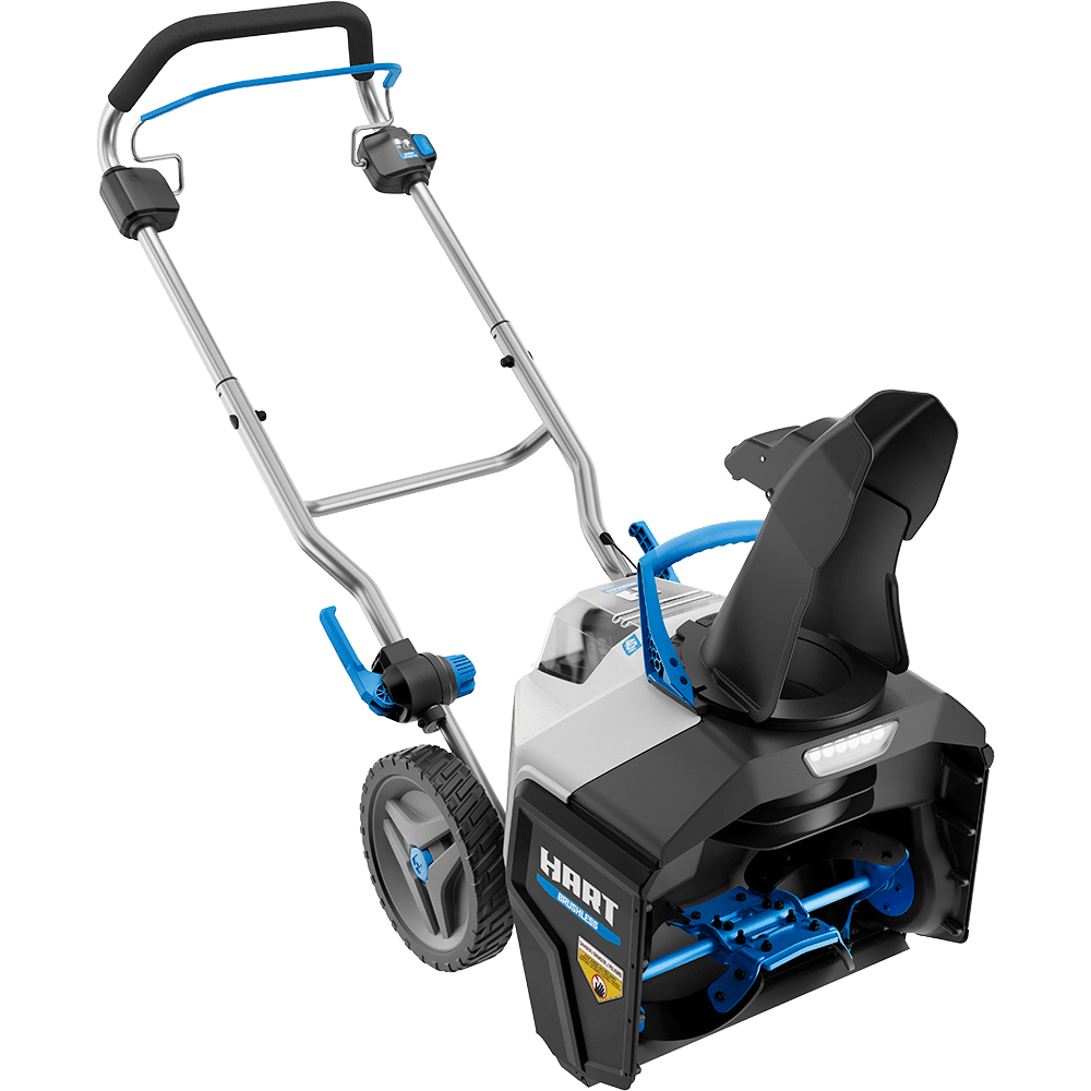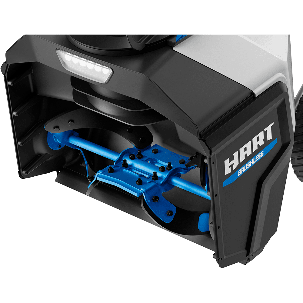 Take charge all winter with HART’s cordless 40V Brushless 18” Snow Blower Kit. We combine the convenience of cordless with a powerful brushless motor to deliver instant power at the push of a button. Battery-powered, you can clear snow up to 18” in width by 10” in depth without the hassle or maintenance of gas. Best when used on patios, decks, and paved driveways. Easily adjust the 180° directional chute to control where snow is chucked up to a 25’ throw distance. The 1.4 Watt LED lights increase visibility so snow can be cleared any time of day. (Plus it’s quiet with zero emissions.) When you’re done, use the folding handles to conveniently store the snowblower away.