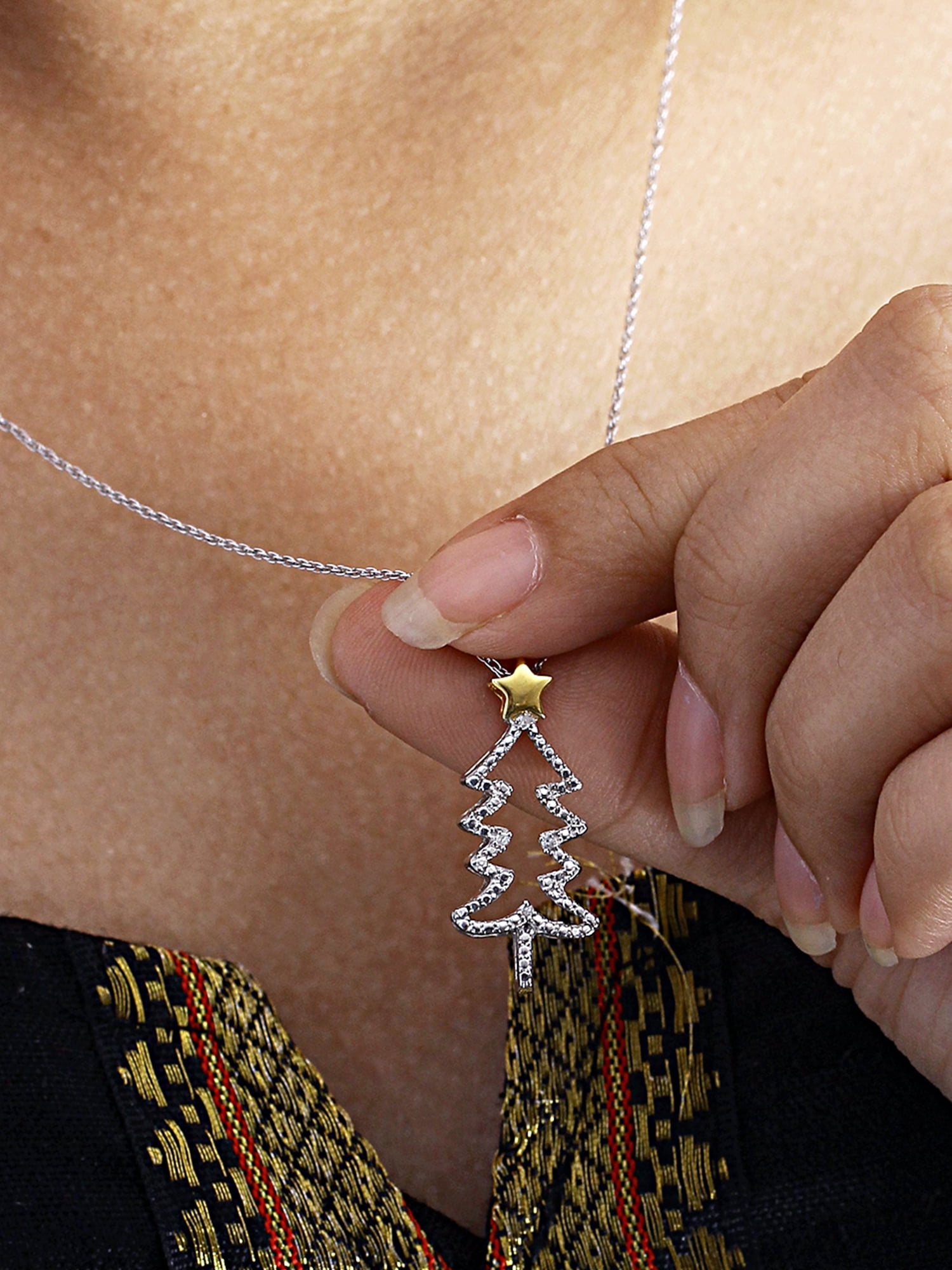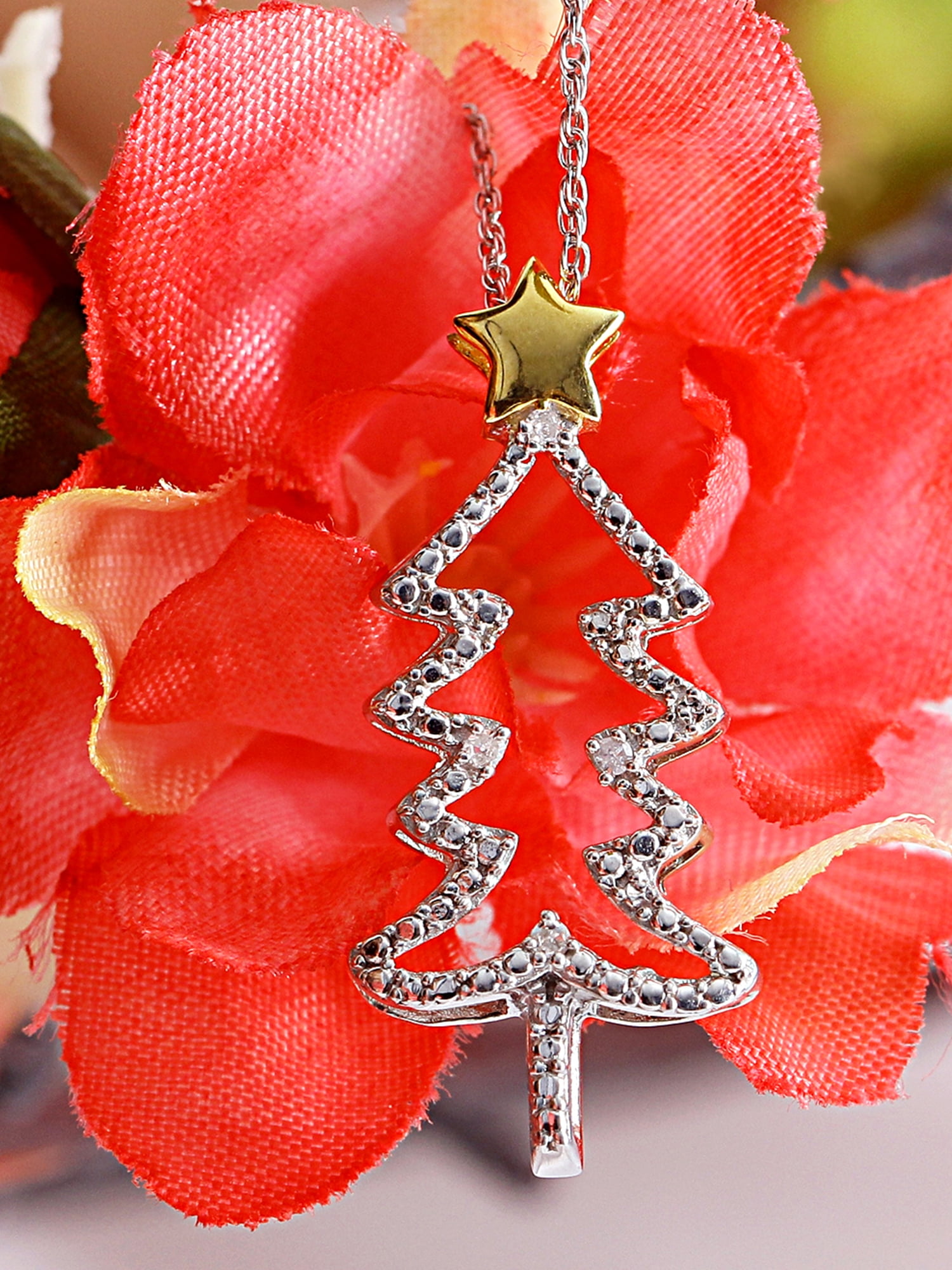 Crafted out of lustrous, highly durable Two-Tone Silver, the JewelersClub Christmas Tree Pendant features genuine .02 CTW White Diamonds set in a glimmering halo pattern. Supported by a strong 18-inch rope chain with a spring ring clasp, our Christmas Tree-inspired necklace is made to remain securely in place throughout all your winter festivities.
