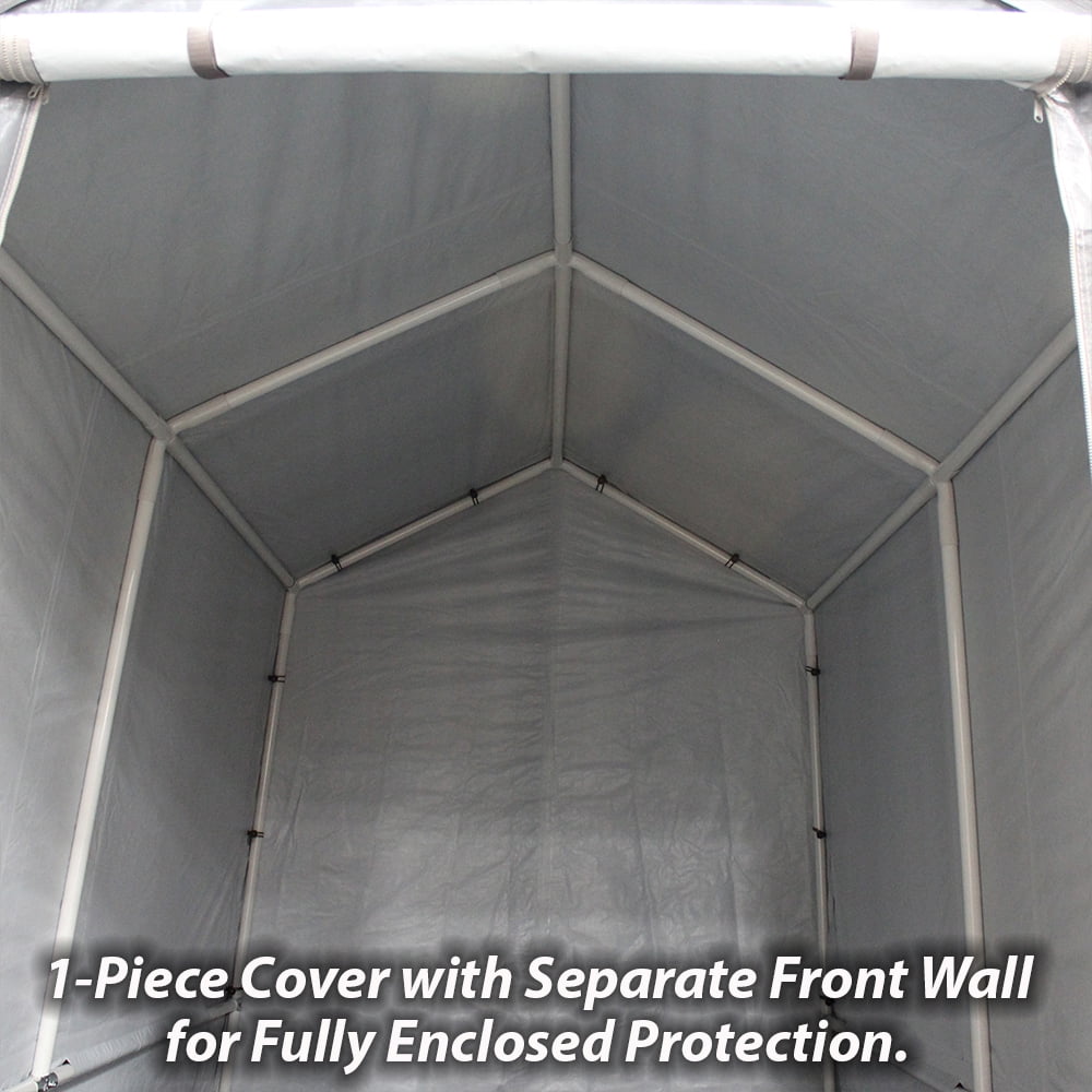 King Canopy Replacement Cover and End wall for the G0712 Storage Shed is an accessory. Frame measures 7ft 7in by 12ft and this is used for replacing old and worn canopies. It is attached to the frame with ball bungees. Frame, bungees not included.