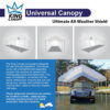 King Canopy Universal 10 ft 8 in x 27 ft Canopy. This economical 10 leg Canopy offers quick, portable shade and protection from inclement weather. Great to pack up and take camping, hunting, or hosting a gathering. The Universal Canopy features a 1 3/8-inch Powder Coated Steel Frame, and 180gsm Polyethylene Patented White Drawstring Cover. Easy Assembly. No Tools Required.