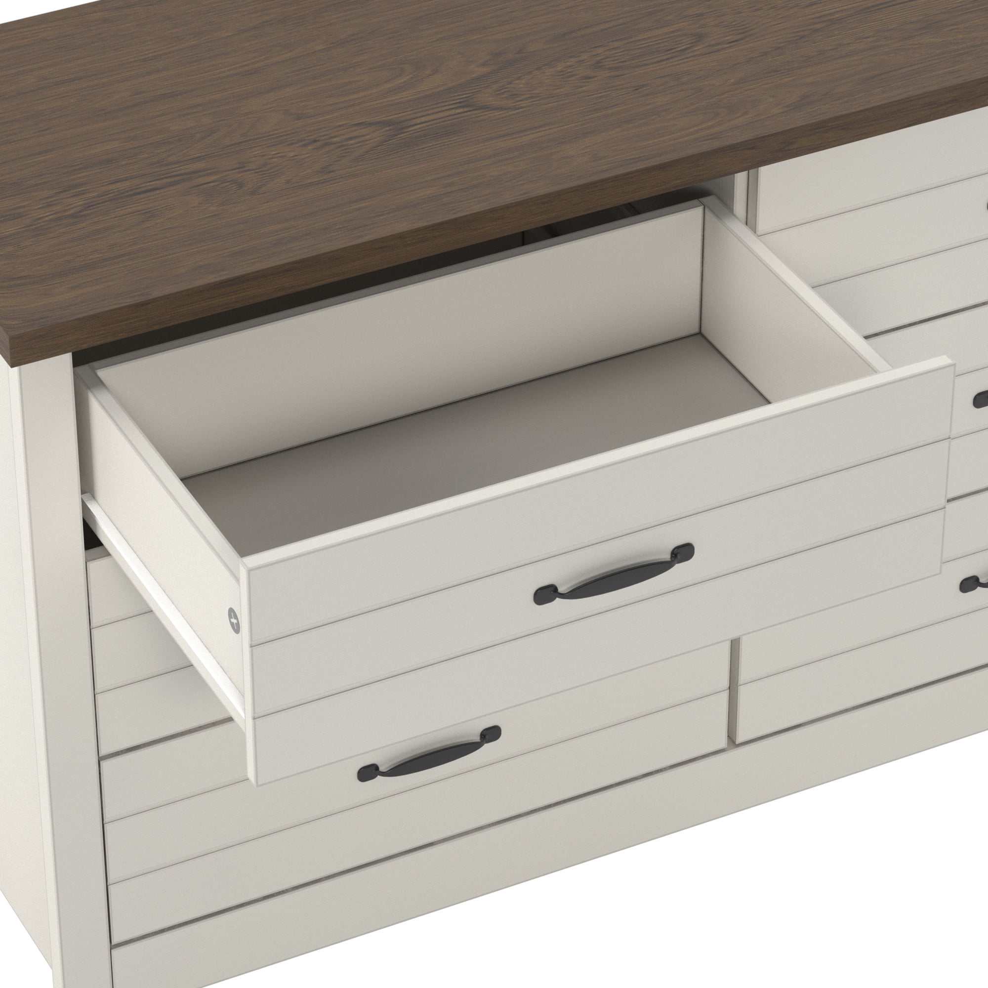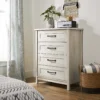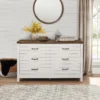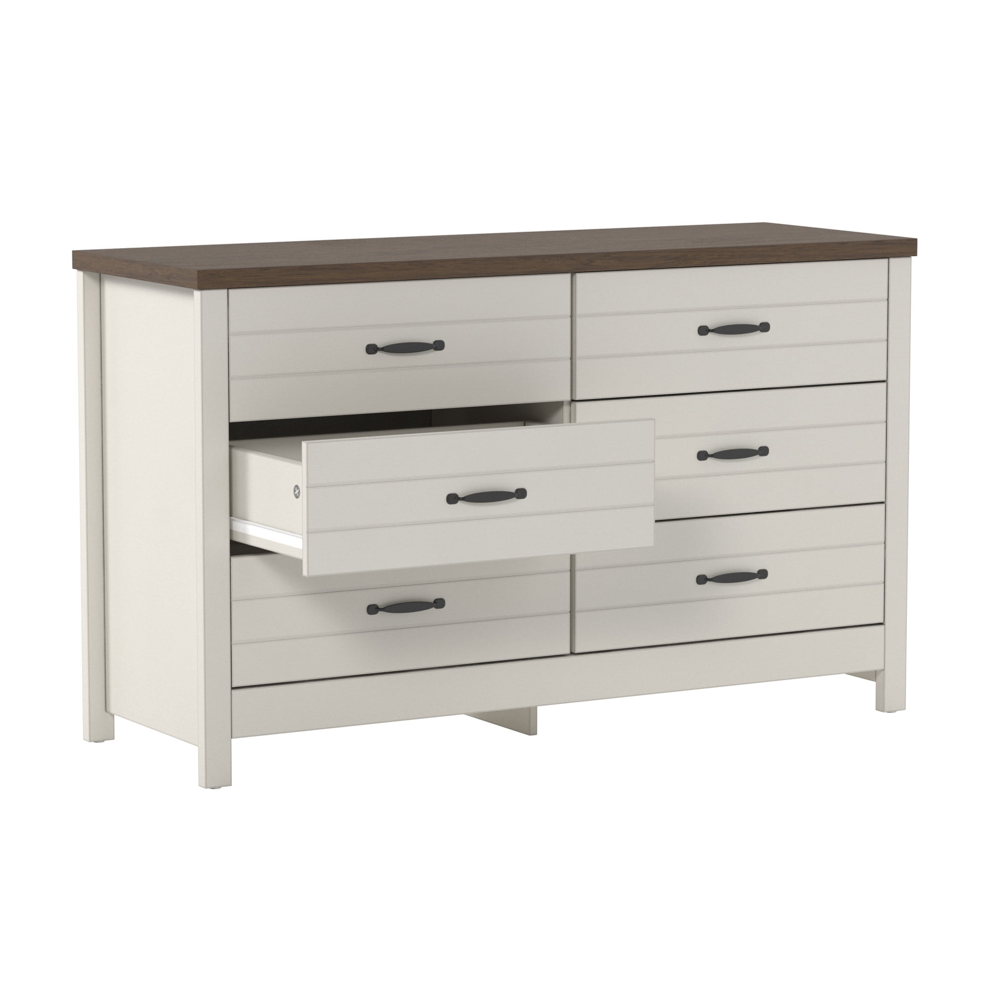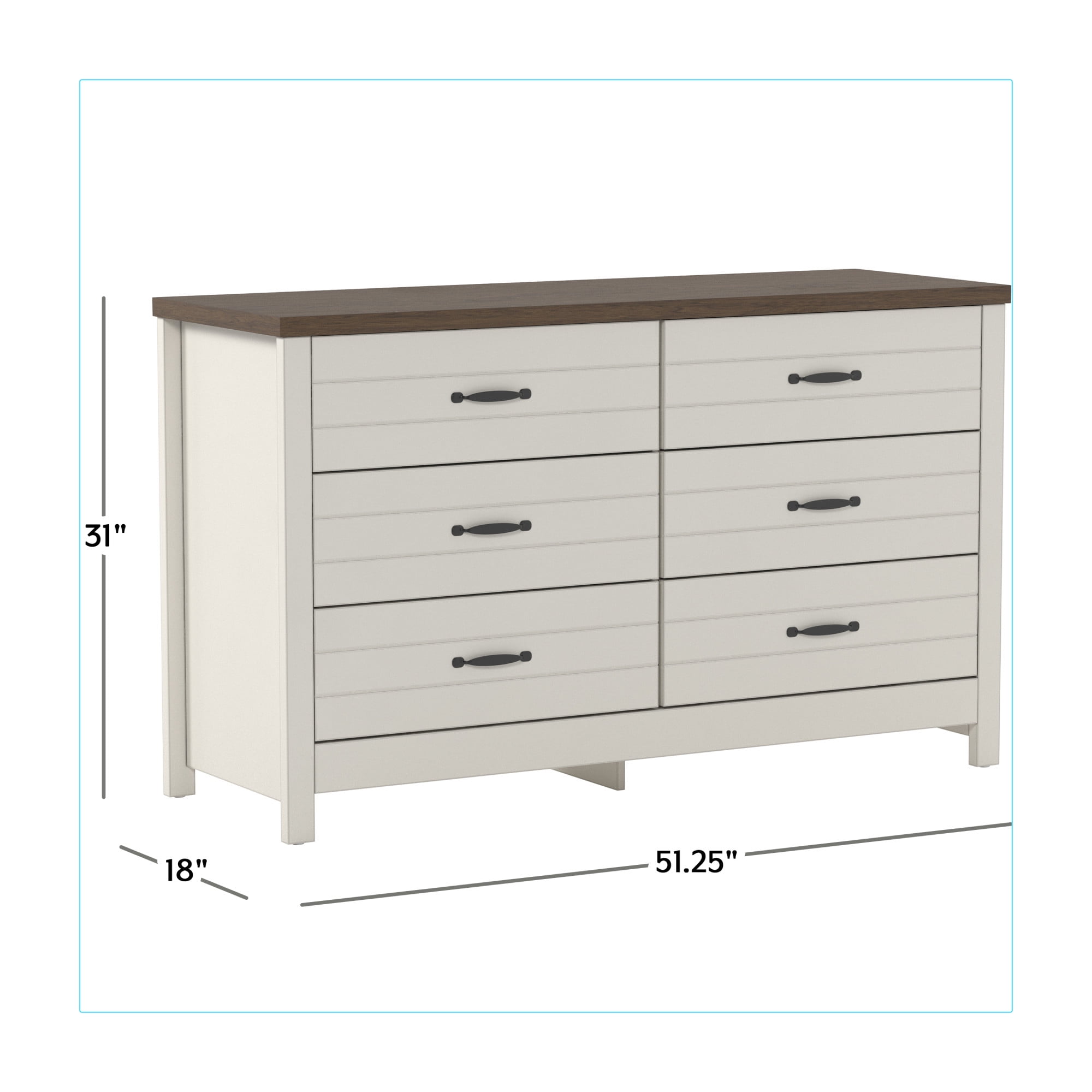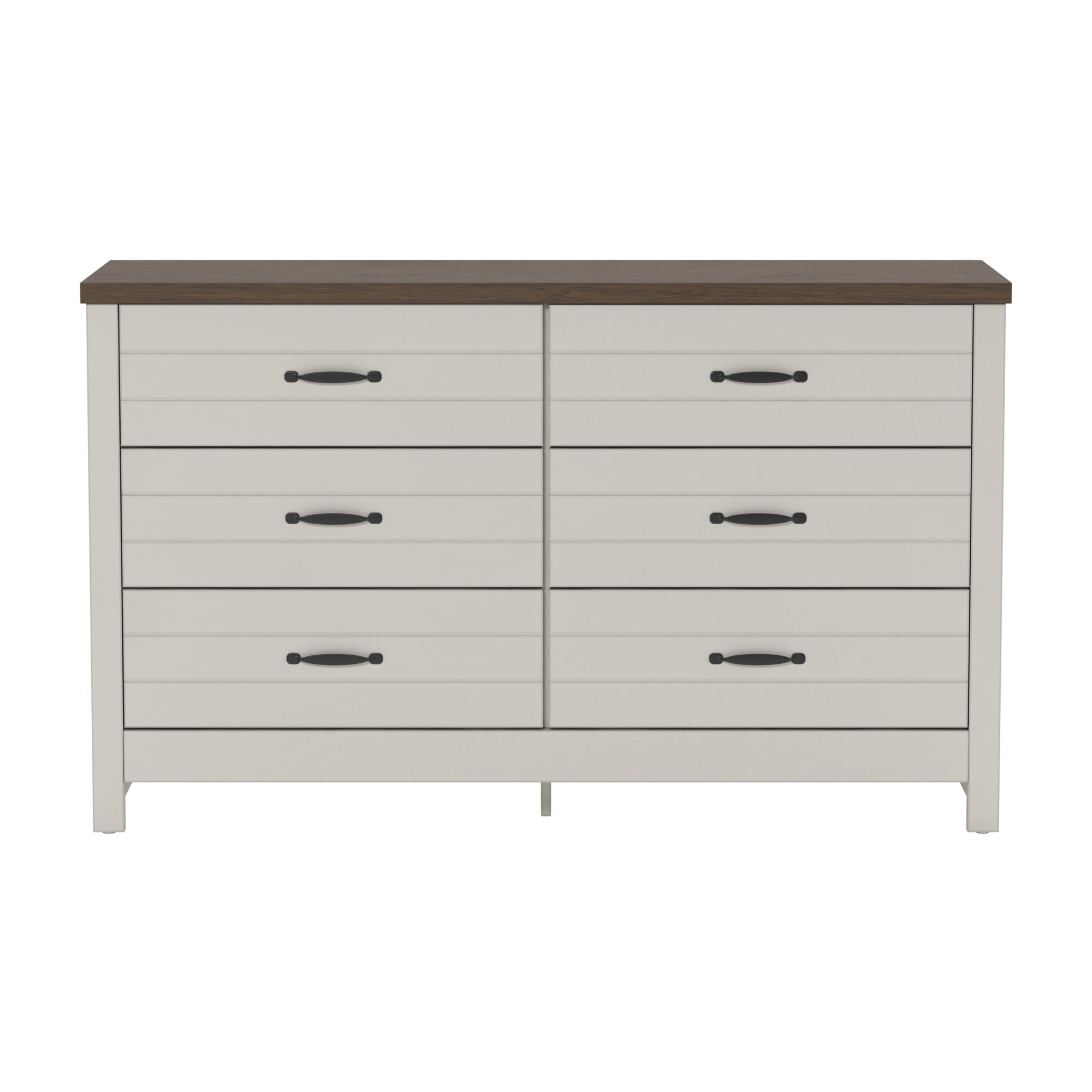 The Lancaster Modern Farmhouse 6 drawer dresser by Hillsdale Living Essentials pays respect to the architectural elements of farmhouse spaces and adds clean, straight lines that can springboard this piece into any home design style. Featuring a beadboard design, transitional soft ivory finish with rustic knotty oak finished tops and stylish black handles, this adult dresser is composed of manufactured wood, smooth metal glides, and durable laminates, and will be a stylish place to organize clothes, blankets, books, or anything other treasures you’d like to tuck out of eyesight. Assembly required. Estimated assembly time is two hours.