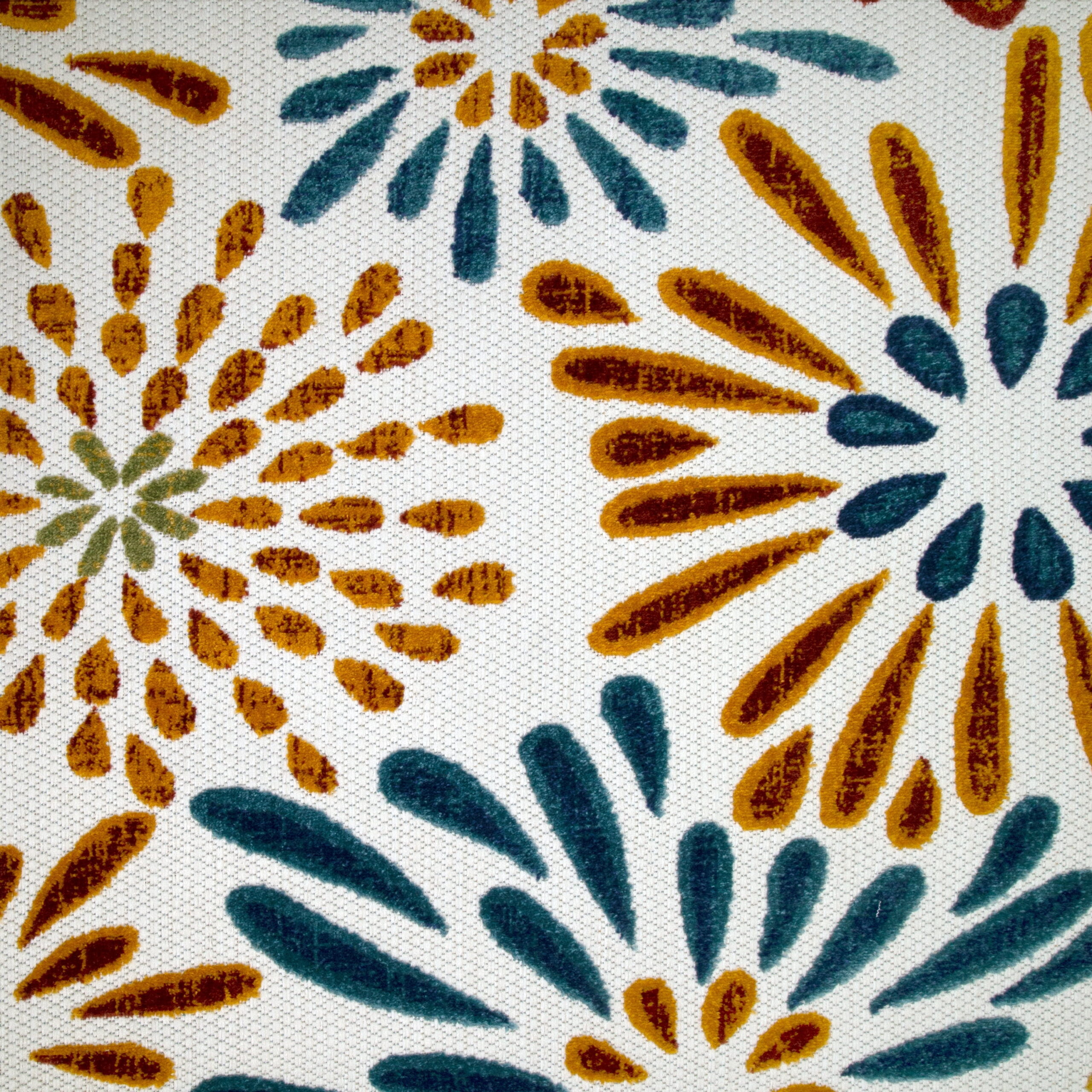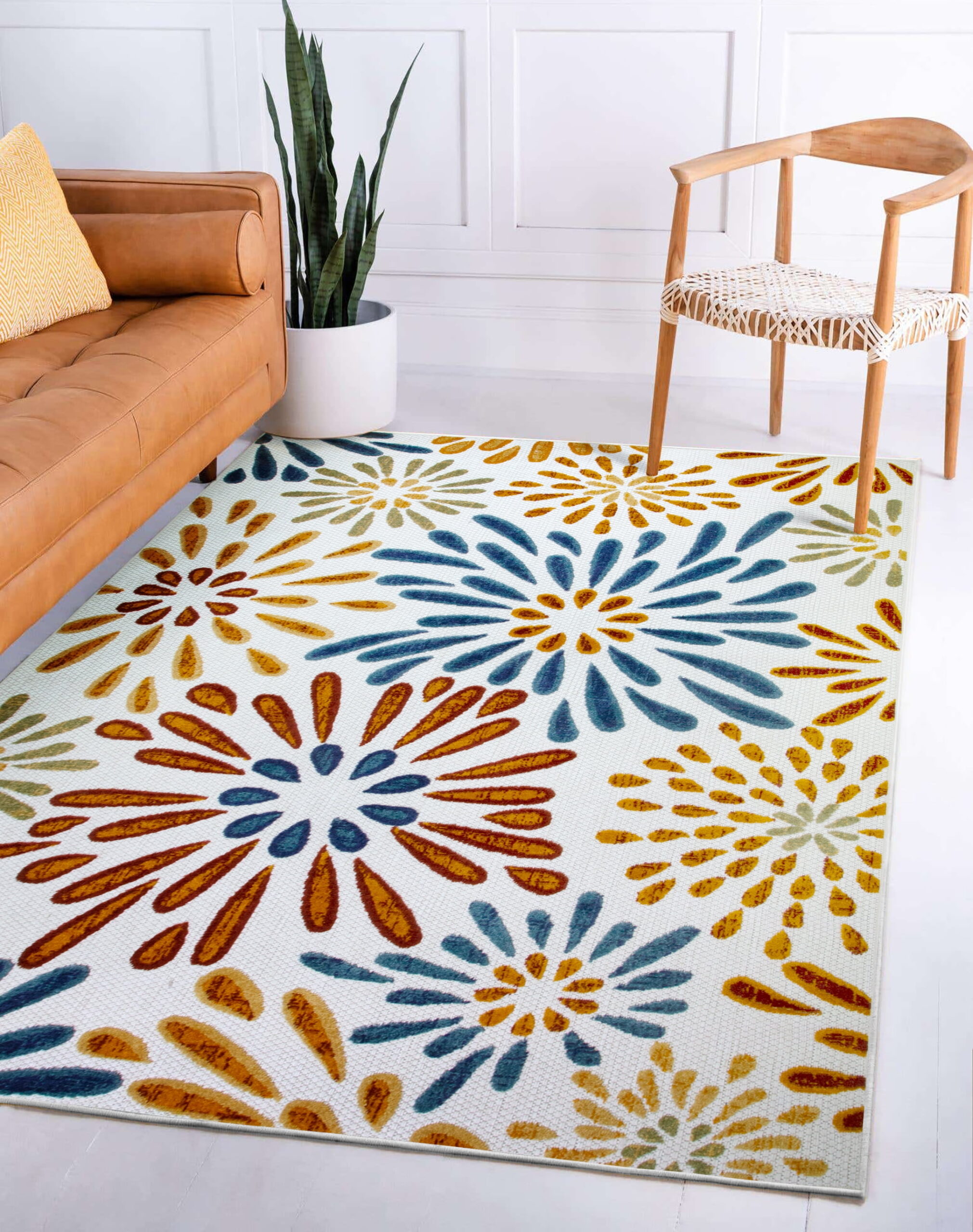 The Leick Home 595405 Beam Indoor Outdoor Rug adds a fun flower print to your indoor our outdoor space with deep red, gold, rich sand, olive, dusty blue and faded navy on a neutral background. The durable area rug is made to stand up to the elements while looking beautiful. Polypropylene is tightly woven to be both soft and non-shedding, while also being easy to clean. It’s lightweight so you can easily move indoors our outdoors, while also being long lasting under heavy use, kids, pets and outdoor weather conditions. Enjoy water as well as UV protection to keep your space looking gorgeous year after year. The low-pile, stain resistant rug can be easily cleaned with a hose, broom or leaf blower. To extend the life of your rug, we recommend a rug pad for indoor use and bringing indoors during extreme weather. Rug measures 5’3″x7′. Crafted in Turkey. Comes with a 1-year limited warranty.