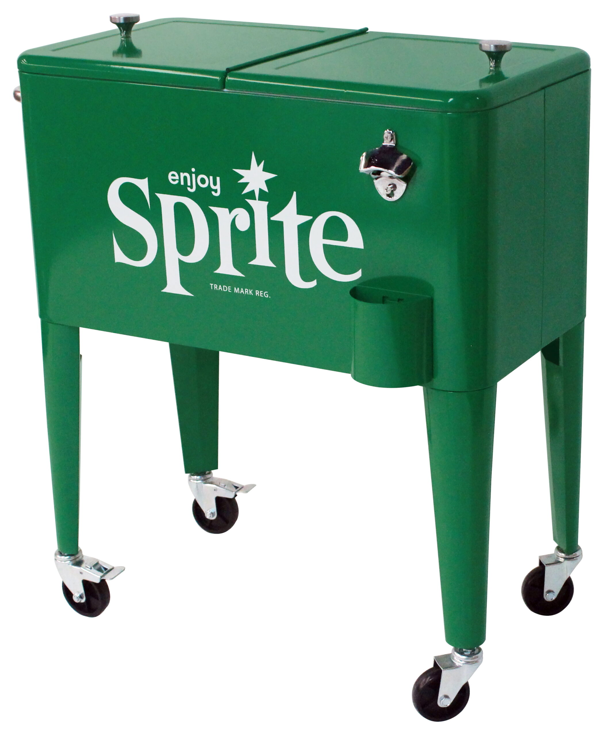 Enjoy the good times with the Sprite® Green Retro 60 qt. rolling cooler with insulated poly liner. It includes a durable steel handle, removable double lid, and a heavy-duty bottle opener & cap catcher. Part of our Leigh Country Coca-Cola licensed series of products.