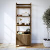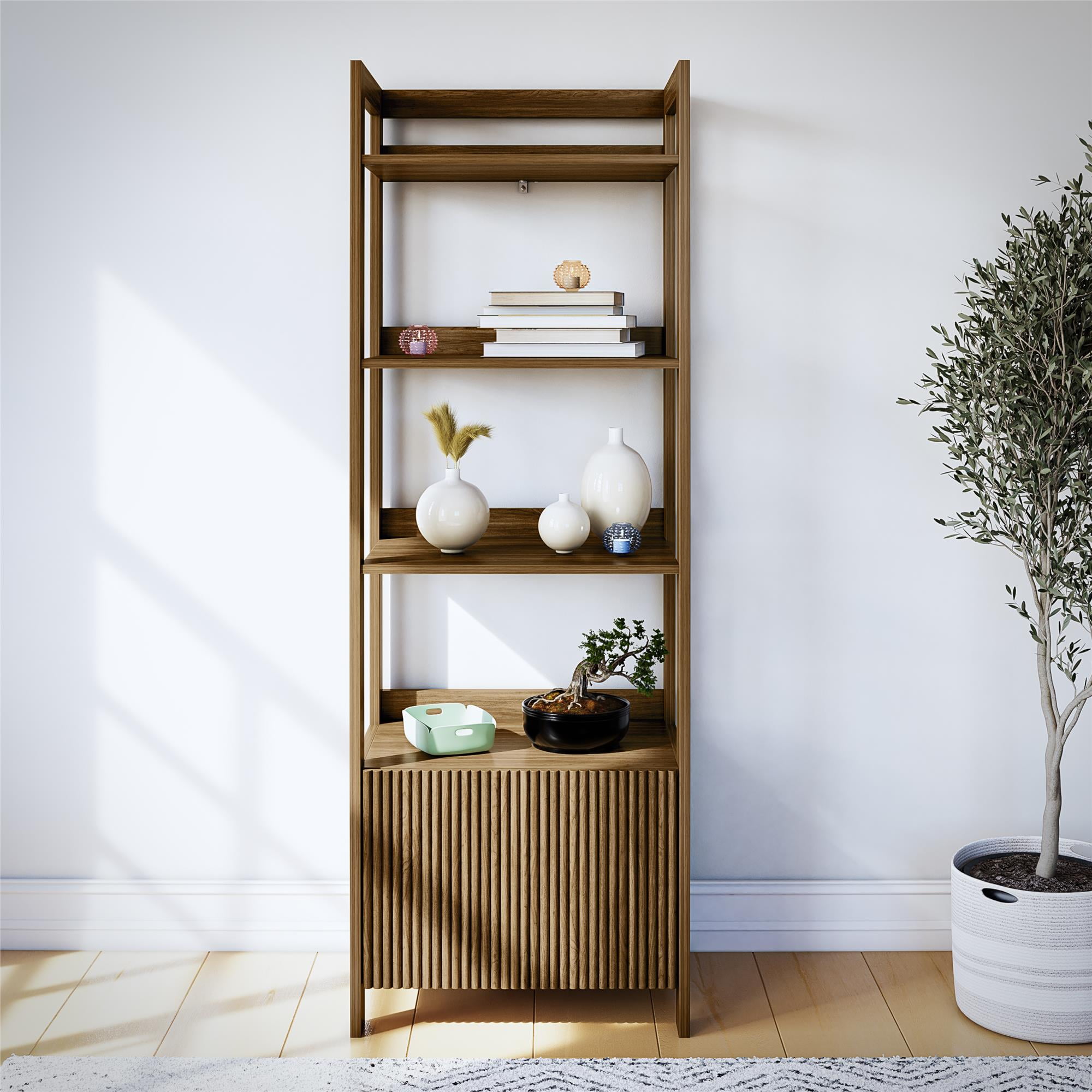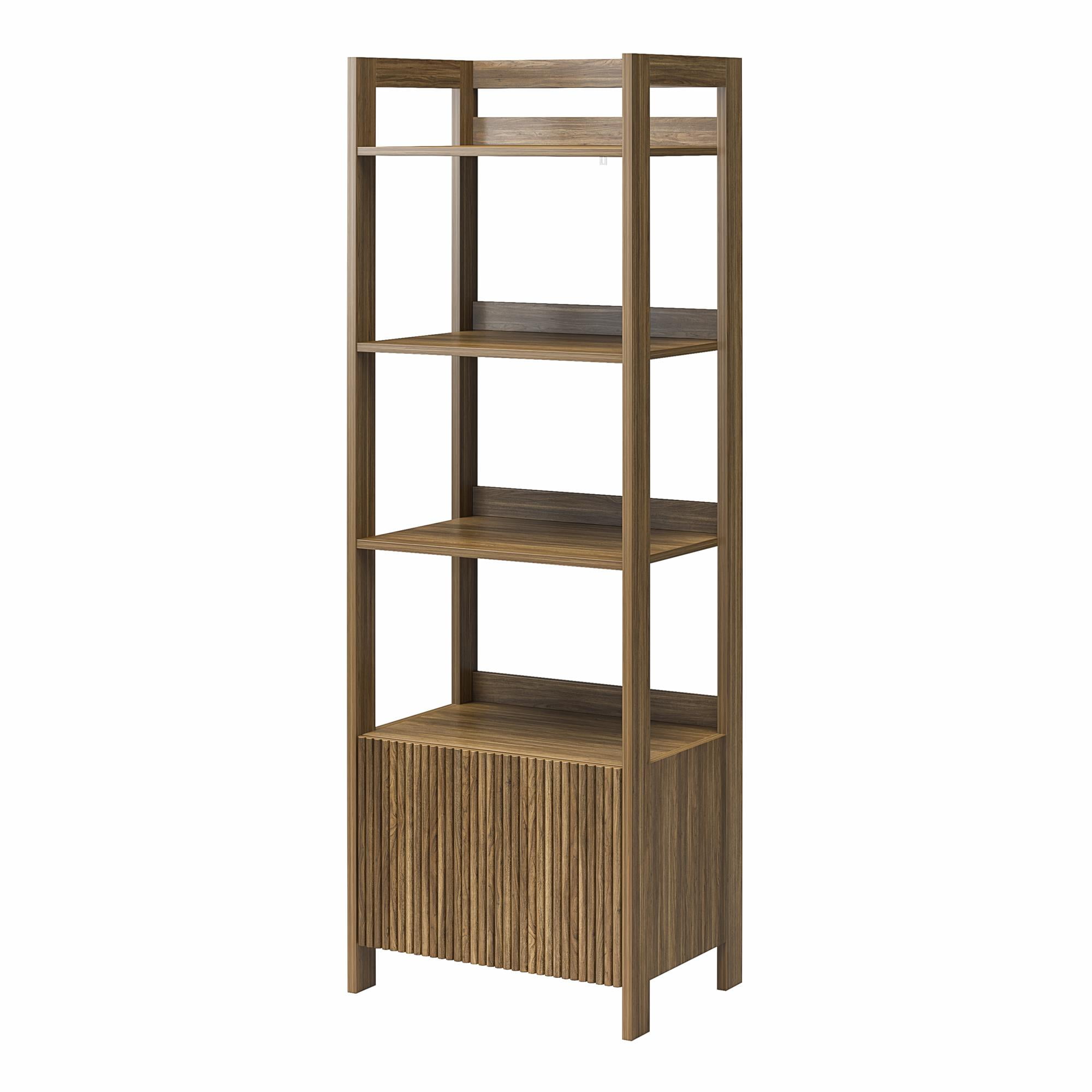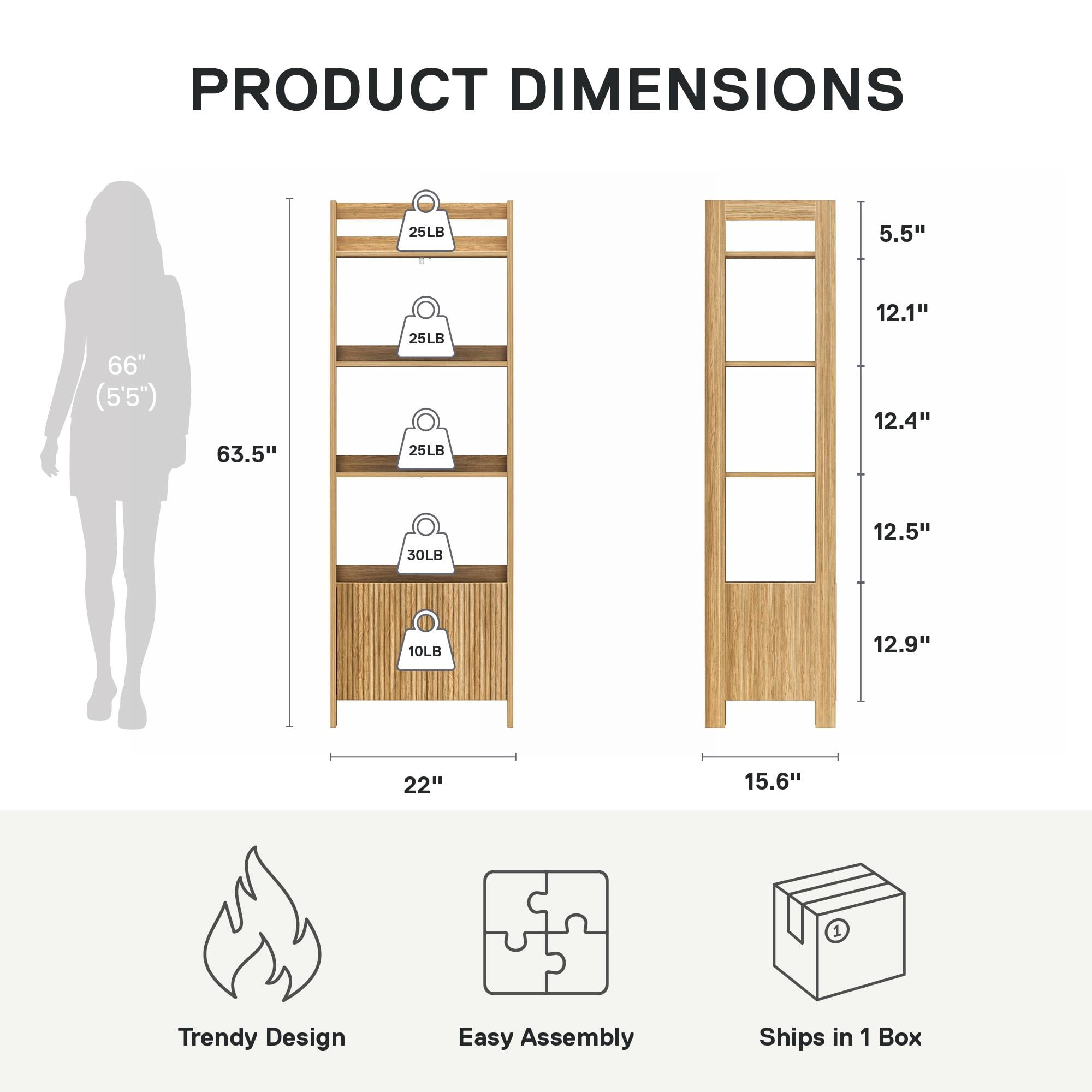 Unleash the potential of your living or working space with the chic and contemporary Mainstays 4-Shelf Reeded Bookcase, designed to effortlessly integrate into any decor while optimizing storage. Crafted from durable engineered wood with a natural teak finish, this modern 4-shelf bookcase is built to last and enhance your room’s aesthetic. Featuring four open shelves, the free-standing storage shelving unit offers ample room for displaying your favorite books, collectibles, or decorative items. The bottom drawer, with its reeded fluted front and sides, adds a touch of sophistication and provides hidden storage for office supplies, stationery, or personal belongings. Drawer slides ensure smooth access, while the wall anchor prevents tipping, keeping your tall bookshelf organizer secure. Its narrow footprint makes it ideal for small spaces, fitting perfectly into corners or tight areas. A gem among tall bookshelf organizers, it blends functionality and elegance, fitting seamlessly into modern or Mid-century modern aesthetics. Assembly is straightforward with clear instructions for a hassle-free setup. Assembled Dimensions: 22.05″ W x 63.39″ H x 15.63″ D.