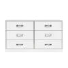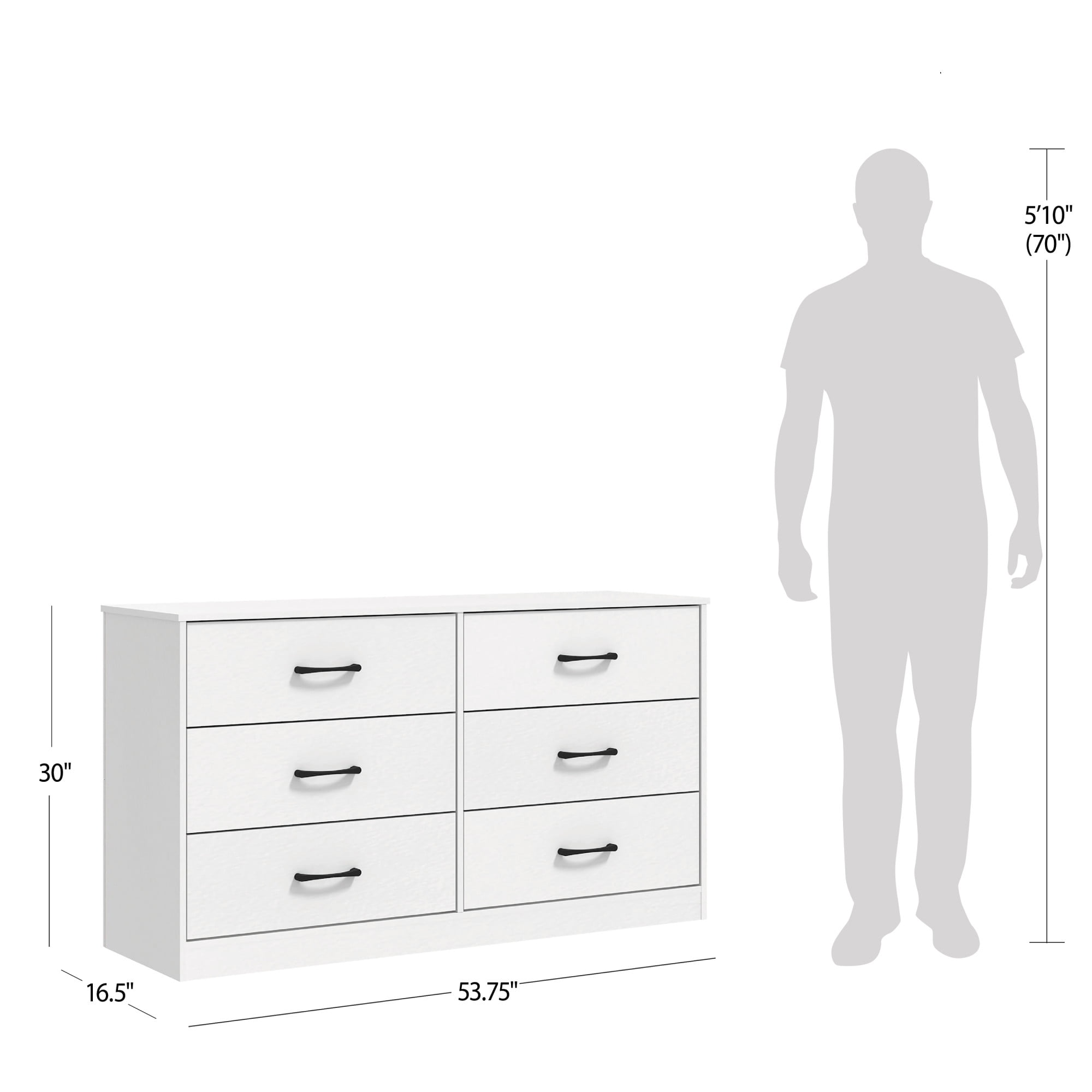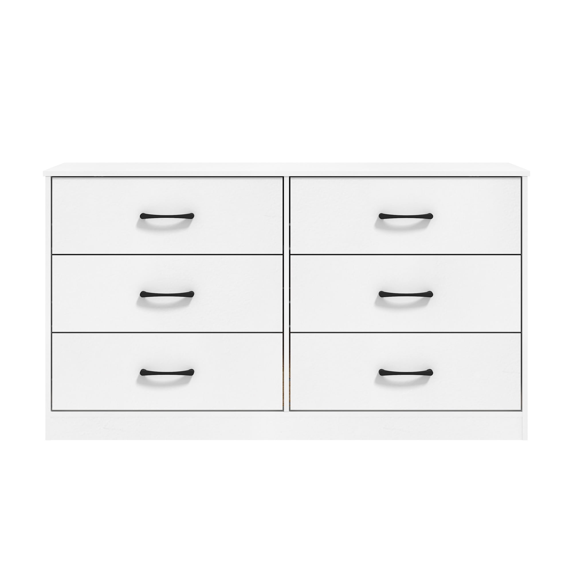 This six-drawer dresser is as simple to put together as it is sleek. Featuring a design that allows for quick and easy assembly by anyone, this piece gives you an elevated look without the hard work. Grooved Wood Compositeen panels are designed to stay in place so you can effortlessly snap them together and then move on with your day. With clean lines and a timeless silhouette, this adult dresser boasts generously sized drawer pulls, and a lamination process ensures a consistent white finish throughout. Wide and substantial, this dresser features six spacious drawers that slide smoothly on a metal glide system. Add understated elegance to your bedroom with this casual transitional piece. Assembly required.